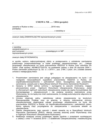 Załącznik nr 4 do SIWZ UMOWA NR …. / 2016 (projekt) zawarta w Rudce w dniu ……………………....2016 roku pomiędzy: ……………………………………………………….. z siedzibą w ……………………………………………………………………………… ………………………………………………………………......………………………………………, zwanym dalej ZAMAWIAJĄCYM reprezentowanym przez: ……………………………………………………………………………………………, a ........................................................................................................................................, z siedzibą: ...................................................................................................................... zarejestrowanym w ........................................................................................................ pod numerem …………………............. posiadającym nr NIP …………………….….…, reprezentowanym przez: ……………................................................................................................................., zwanym dalej WYKONAWCĄ w wyniku wyboru najkorzystniejszej oferty w postępowaniu o udzielenie zamówienia publicznego przeprowadzonego w trybie przetargu nieograniczonego, pn.: ,,Usługa grupowego ubezpieczenia na życie pracowników SSZZOZ w Rudce oraz członków ich rodzin” znak sprawy: AE/MK/2710/2/16, na podstawie ustawy z dnia 29 stycznia 2004 r. Prawo zamówień publicznych (tj. Dz. U. z 2015 r., poz. 2164, z późn. zm.) została zawarta umowa o następującej treści: §1 1. 2. 3. 4. 5. Przedmiotem zamówienia jest usługa polegająca na ubezpieczeniu na życie i od następstw nieszczęśliwych wypadków pracowników SSZZOZ w Rudce, ich współmałżonków/partnerów i pełnoletnich dzieci. Szczegółowy opis przedmiotu zamówienia zawarty jest w Specyfikacji Istotnych Warunków Zamówienia Rozdział II. Opisany w SIWZ zakres ochrony i wymagania to warunki minimalne, mające pierwszeństwo przed Ogólnymi Warunkami Ubezpieczenia Wykonawcy. Jeżeli w oferowanych ogólnych warunkach ubezpieczenia znajdą się zapisy korzystniejsze dla Zamawiającego i ubezpieczonych i nie zostaną wyraźnie zastrzeżone przez Wykonawcę, że nie będą one mieć zastosowania, to zostają automatycznie włączone do ubezpieczenia Umowa obejmuje pełny, całodobowy zakres ubezpieczenia na terytorium Rzeczpospolitej Polskiej oraz za granicą, a dotyczy dobrowolnej ochrony ubezpieczeniowej obejmującej usługę grupowego ubezpieczenia na życie dla pracowników SSZZOZ w Rudce, ich współmałżonków/partnerów i pełnoletnich dzieci, którzy zgłoszą chęć przystąpienia do ubezpieczenia i uiszczania składki za ubezpieczenie. Zakres ubezpieczenia, jego warunki i stawki zawarte są w Specyfikacji Istotnych Warunków Zamówienia (SIWZ), ofercie cenowej złożonej przez Wykonawcę oraz w Ogólnych Warunkach Ubezpieczenia Wykonawcy. Realizacja niniejszej umowy przebiegać będzie zgodnie z przepisami wynikającymi z ustawy z dnia 11 września 2015 r. o działalności ubezpieczeniowej i reasekuracyjnej 1 6. 1. 2. 1. 2. 1. 2. 3. 4. 1. 2. 1. 2. (t.j. Dz. U. z 2015r. poz. 1844), innymi obowiązującymi w tym zakresie przepisami prawa i zgodnie z postanowieniami niniejszej umowy. W ramach niniejszej umowy Strony zobowiązują się dołożyć wszelkiej staranności niezbędnej przy jej wykonywaniu. §2 Strony uzgadniają, że w trakcie realizacji niniejszej umowy poniższe dokumenty będą uważane za jej elementy oraz będą stanowić integralną część umowy: 1) Specyfikacja Istotnych Warunków Zamówienia, 2) Oferta Wykonawcy, 3) Dokumenty wystawione przez Wykonawcę potwierdzające zawarcie umów ubezpieczenia, tj. polisa ubezpieczeniowa oraz Ogólne Warunki Ubezpieczenia. W przypadku rozbieżności pomiędzy zapisami dokumentów wymienionych w pkt. 1 pierwszeństwo mają zapisy korzystniejsze dla Ubezpieczonego. §3 Umowa zostaje zawarta na czas oznaczony, tj. na okres od 01.10.2016r. do 30.09.2019r. Polisa będzie wystawiona na okres zgodny z okresem wykonania umowy określonym w ust. 1. §4 Strony ustalają, że likwidacja szkód będzie przebiegała zgodnie z ustalonymi procedurami likwidacji szkód. Nadzór nad likwidacją szkód i sprawozdawczość w tym zakresie należy do Wykonawcy. Wykonawca zobowiązuje się do likwidacji szkód i wypłaty świadczeń niezwłocznie po otrzymaniu kompletnej dokumentacji, nie później jednak niż w terminie określonym ustawowo. Zamawiający, w razie konieczności, wymaga zapewnienia badania lekarskiego w celu orzeczenia wysokości stopnia uszczerbku na zdrowiu ubezpieczonego, które zostanie wykonane w odległości nie większej niż 50 km od siedziby Ubezpieczającego. W innym przypadku Wykonawca zapewnia możliwość wypłaty stosownego świadczenia na podstawie przekazanej dokumentacji lekarskiej. §5 Podstawą do wypłaty świadczenia będzie jeden z następujących dokumentów: – akt urodzenia, – akt zgonu, – wypis ze szpitala lub inna dokumentacja medyczna, – orzeczenie lekarskie o stopniu uszczerbku na zdrowiu, – lub inne niezbędne dokumenty potwierdzające i uzasadniające roszczenie. Wypłaty należnych świadczeń wypłacane będą w formie przelewu na wskazane przez ubezpieczonego konto bankowe bądź w formie gotówki w kasie wskazanej przez Wykonawcę, a jeżeli ubezpieczony nie posiada konta bankowego – przekazem pocztowym na adres podany przez ubezpieczonego. §6 Ubezpieczający zobowiązuje się zapłacić Wykonawcy należną sumę składek, przelewem na przypisany polisie przez Wykonawcę numer konta, nie później niż do 15 dnia miesiąca kalendarzowego, za który udzielana jest ochrona ubezpieczeniowa. Suma składek za każdy miesięczny okres objęcia ochroną ubezpieczeniową nie może przekroczyć wartości wynika
