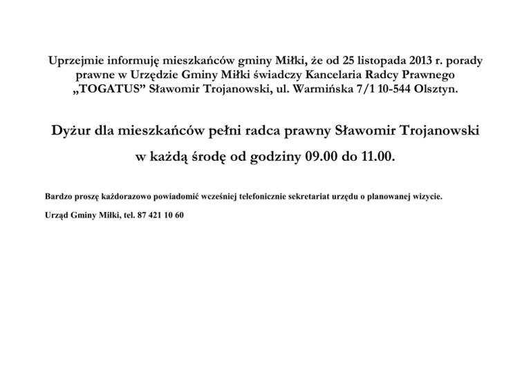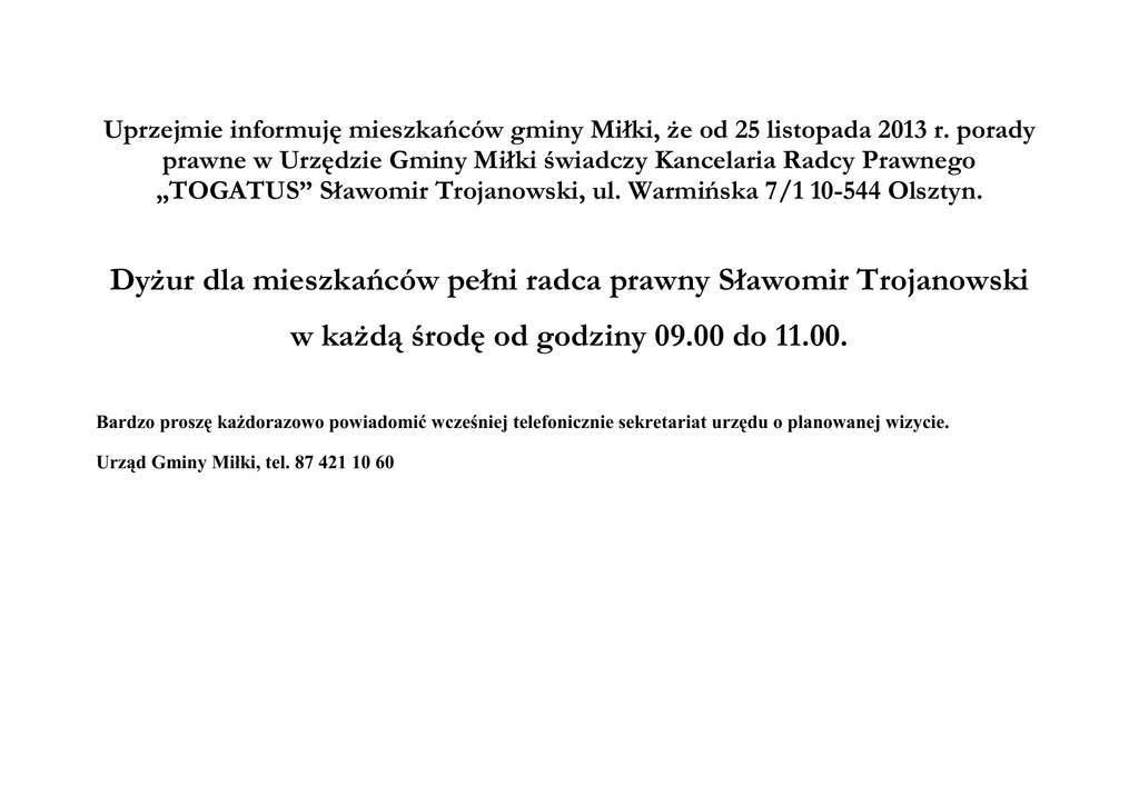 Uprzejmie informuję mieszkańców gminy Miłki, że od 25 listopada 2013 r. porady prawne w Urzędzie Gminy Miłki świadczy Kancelaria Radcy Prawnego „TOGATUS” Sławomir Trojanowski, ul. Warmińska 7/1 10-544 Olsztyn. Dyżur dla mieszkańców pełni radca prawny Sławomir Trojanowski w każdą środę od godziny 09.00 do 11.00. Bardzo proszę każdorazowo powiadomić wcześniej telefonicznie sekretariat urzędu o planowanej wizycie. Urząd Gminy Miłki, tel. 87 421 10 60