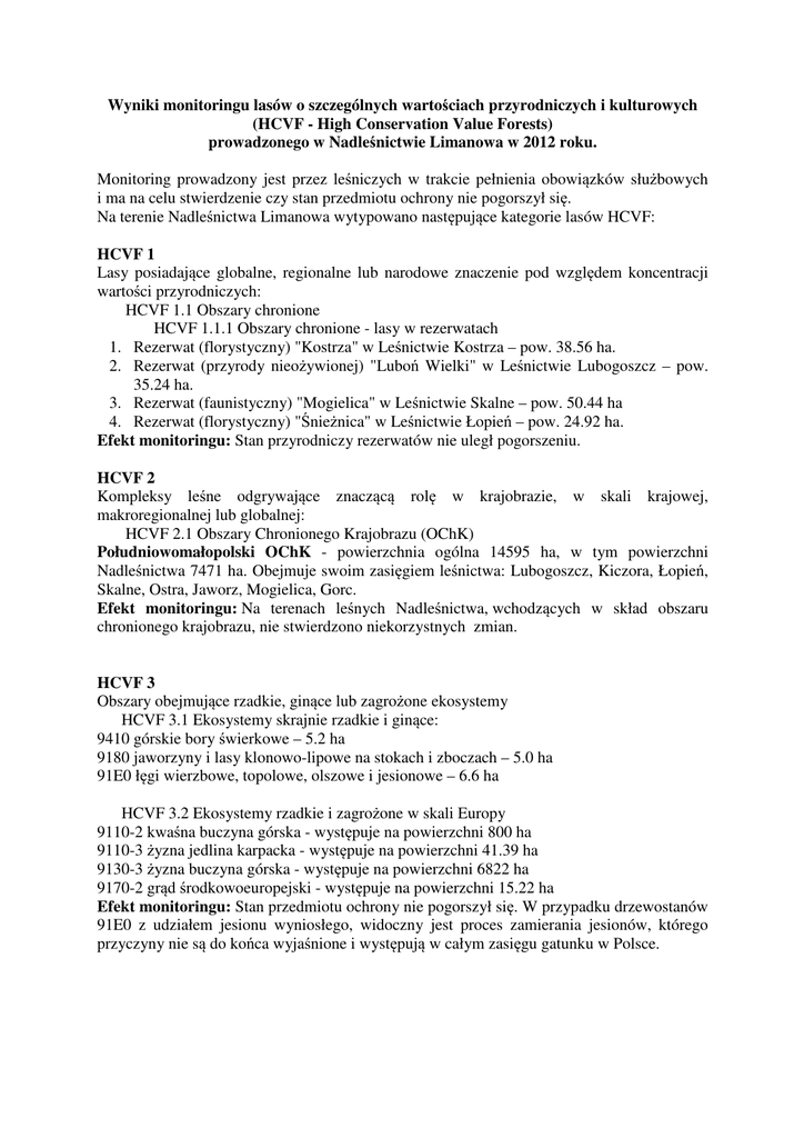 Wyniki monitoringu lasów o szczególnych wartościach przyrodniczych i kulturowych (HCVF - High Conservation Value Forests) prowadzonego w Nadleśnictwie Limanowa w 2012 roku. Monitoring prowadzony jest przez leśniczych w trakcie pełnienia obowiązków służbowych i ma na celu stwierdzenie czy stan przedmiotu ochrony nie pogorszył się. Na terenie Nadleśnictwa Limanowa wytypowano następujące kategorie lasów HCVF: HCVF 1 Lasy posiadające globalne, regionalne lub narodowe znaczenie pod względem koncentracji wartości przyrodniczych: HCVF 1.1 Obszary chronione HCVF 1.1.1 Obszary chronione - lasy w rezerwatach 1. Rezerwat (florystyczny) "Kostrza" w Leśnictwie Kostrza – pow. 38.56 ha. 2. Rezerwat (przyrody nieożywionej) "Luboń Wielki" w Leśnictwie Lubogoszcz – pow. 35.24 ha. 3. Rezerwat (faunistyczny) "Mogielica" w Leśnictwie Skalne – pow. 50.44 ha 4. Rezerwat (florystyczny) "Śnieżnica" w Leśnictwie Łopień – pow. 24.92 ha. Efekt monitoringu: Stan przyrodniczy rezerwatów nie uległ pogorszeniu. HCVF 2 Kompleksy leśne odgrywające znaczącą rolę w krajobrazie, w skali krajowej, makroregionalnej lub globalnej: HCVF 2.1 Obszary Chronionego Krajobrazu (OChK) Południowomałopolski OChK - powierzchnia ogólna 14595 ha, w tym powierzchni Nadleśnictwa 7471 ha. Obejmuje swoim zasięgiem leśnictwa: Lubogoszcz, Kiczora, Łopień, Skalne, Ostra, Jaworz, Mogielica, Gorc. Efekt monitoringu: Na terenach leśnych Nadleśnictwa, wchodzących w skład obszaru chronionego krajobrazu, nie stwierdzono niekorzystnych zmian. HCVF 3 Obszary obejmujące rzadkie, ginące lub zagrożone ekosystemy HCVF 3.1 Ekosystemy skrajnie rzadkie i ginące: 9410 górskie bory świerkowe – 5.2 ha 9180 jaworzyny i lasy klonowo-lipowe na stokach i zboczach – 5.0 ha 91E0 łęgi wierzbowe, topolowe, olszowe i jesionowe – 6.6 ha HCVF 3.2 Ekosystemy rzadkie i zagrożone w skali Europy 9110-2 kwaśna buczyna górska - występuje na powierzchni 800 ha 9110-3 żyzna jedlina karpacka - występuje na powierzchni 41.39 ha 9130-3 żyzna buczyna górska - występuje na powierzchni 6822 ha 9170-2 grąd środkowoeuropejski - występuje na powierzchni 15.22 ha Efekt monitoringu: Stan przedmiotu ochrony nie pogorszył się. W przypadku drzewostanów 91E0 z udziałem jesionu wyniosłego, widoczny jest proces zamierania jesionów, którego przyczyny nie są do końca wyjaśnione i występują w całym zasięgu gatunku w Polsce. HCVF 4 Lasy pełniące funkcje w sytuacjach krytycznych HCVF 4.1 Lasy wodochronne oraz HCVF 4.2 Lasy glebochronne zajmują 8233,45 ha. Efekt monitoringu: Stan tych lasów nie uległ pogorszeniu i nadal spełniają one funkcje wodochronne i glebochronne. HCVF 6.1 Lasy kluczowe dla tożsamości kulturowej lokalnych społeczności: 1. Szczyt Mogielicy 2. Torfowisko na Łopieniu 3. Lasy jodłowe nad Tymbarkiem 4. Boisko i miejsce rekreacji na Śnieżnicy 5. Bystra Góra – Gmina Kamienica 6. Polany gorczańskie w zarządzie LP– Gmina Kamienica 7. Las krajobrazowy przy drodze 968 – Dolina Kamienicy 8. Polanki - Miejsce zrzutów z czasów II wojny światowej 9. Cmentarz z czasów I wojny światowej w Słupi 10. „Katowski Potok” na Cietniu 11. „ Altana” na Cietniu 12. Kompleks jaskiń „Ostrysz” na Łopieniu 13. Mogiły partyzanckie na Gorcu 14. Krzyż z czasów I wojny światowej pod Przeł. Ostra 15. Krzyż partyzancki pod Mogielicą 16. Droga krzyżowa na Śnieżnicy 17. Droga różańcowa na Ćwilinie Efekt monitoringu: Stan wyodrębnionych w toku konsultacji społecznych lasów kluczowych dla tożsamości kulturowej lokalnych społeczności nie wykazuje niekorzystnych zmian.