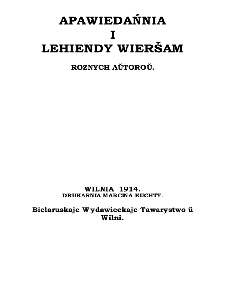 APAWIEDAŃNIA I LEHIENDY WIERŠAM ROZNYCH AŬTOROŬ. WILNIA 1914. DRUKARNIA MARCINA KUCHTY. Biełaruskaje W ydawieckaje Tawarystwo ŭ Wilni. Rodnaje słow o. P ad naw ałaj kryŭdaŭ, mnohije stalećcia, My niaśli pakorna lamku biezpraświećcia, My niaśli—ŭsio nyło, hinuło pamału, Až nie našaj naša baćkoŭščyna stała. Nie dla nas sasonki našy zašumieli, Nie dla nas pasiewy našy zarunieli, Adno ty nam, słow o, astałosia wiernym, Kab w iaści z upadku k radaściam niaźmiernym. * Kab w iaści nas, jak my wiek sw ajho sumleńnia Nie zaklejmaw ali pomstaj znistažeńniem,— My kali ŭmirali, to išli na muku Dla čužoj karyści, pad čužoj prynukaj. Siejučy-ž i doma i za domam kości— Dzie nas hnali našy letašnije hości— Jak u puščy ciomnaj, źbilisia z darohi, I zdarma čekali ad ludziej padmohi... * Ŭsio spahaniŭć ludzi, pokul noč šaleje,— Wyrw uć wieru ŭ ščaście, wieru i nadzieju, Dyj taho nia wyrw uć, što napieła maci, Nočkaj nad kałyskaj rodnamu dziciaci. Oj nie w yrw ać s serca ciabie, naše słow o! Oj nie ŭziać nijakim schow am dy akow am, Jak biaruć matulu ŭ małoj dziaciny, Jak biaruć u baćki apošniaho syna! * T y zžyłosia z nami, baćkaŭskaje słoŭce, Jakby koreń z drew am, jakby z niebam sonce; Dzieliš z nami wiečna ŭsio, što z nami chodzie U błahoj i dobraj mačysie-pryhodzie. I my sami naw at mo nie spaznaw ali, Jak u dumkach sonnych ciabie hadaw ali, Jak ciabie chaw ali ŭ ščaści i nieščaści Ad naprasnaj złości, ad ludzkoj napaści. * T y ŭ žyćci wiało nas z chw ałaj i niechw ałaj, Byŭ čas, sw aje praw y čužym dychtaw ało; I ciapier chto zw odna nad taboj śmiajecca,— Heta abo wiecier, što ŭ płatoch trasiecca, Abo toj śmiajecca, chto nie znaŭ nikoli Čeław iečych dumak, čeław iečaj doli,— Chto ŭ hrudziach haduje złosna nieprytw orna Zamiest serca kamień, miest dušy—dym čorny. * Jak žyło ty z nami—budzieš wiečna žyci, Hramadoj miljonaŭ s świetam hamanici... Z popieloŭ minuŭšych dzion ślapych kryw aw ych Wiesieła ŭzojdzie ruń świetlanaj sławy, I radzimym słow am rukoj mazalistaj Biełarus upiše na stranicy čystaj Knihi ŭsich narodaŭ, w ažna, ŭ nieprymusie, Sumnuju apowieść rodnaj Biełarusi. Janka Kupała. Ščaście. I. T y haw oryš, susiedzie, što na świecie ŭsio jedzie Kryw a, naskas, nie tak jak patreba, I što ŭ hetaj kruciole winna našaja dola, I to sonce, što świecić nam z nieba. Ej, śmiaješsia ty chiba, moj harotny Kandyba, Rastłumaču ja ŭsio tut inačej: Sami my winaw aty ŭ našej doli praklataj, U tym, što wiek biadujem dy plačem. Hlań, w o anhlik ci niemiec!—jany ŭsio ŭmiejuć skiemić Im i ščaście i radaść pakorny; My-ž lažym, jak miadźw iodki, jak hniłyje kałodki, I nas topče, chto bolej praw orny. Śpim sabie, ani dbajem, palahčennia čekajem, Byccym z nieba nam zw alicca toje, Za ništo schodziać siły, prybyw ajuć mahiły, Što raz mieniej prastoru, spakoju. Dzie nia kinieš ty w okam, precca ŭsio šybkim krokam, K čamuś rw ucca, štos chočuć narody. Kali ž nas chto pračniecca, to jamu ŭžo zdajecca... Ale słuchaj adnej w oś pryhody. II. P ad hajkom, pry darožcy, znaŭ ja chłopca ŭ wioscy, Na siało ŭsio byŭ hety dziacina: Dužy, strojny, pryhožy, pracu ŭsiakuju zmože, Łasku mieŭ nie ŭ adnej jon dziaŭčyny. Kažuć, z dolaj chto zžyŭsia, toj u čepku radziŭsia, Janka moj, znać, ješče i ŭ kašuli: Baćka, maci lubili, z knižkaj znacca naŭčyli, Časta hroš jaki mieŭ i na huli. Jon adzin u ich dzietak, dyk nia dziw a, što hetak P apiaścić jaho časam lubili, P akul z hetych piaščotaŭ nie spahnaŭ toj achwoty; P akul zły jaho duch nie asiliŭ. Staŭ hladzieci jon kryw a na chacinu, na niw u, Staŭ hladzieć jon ni chamam, ni panam: Stała stydna siermiažki, pry sasie pracy ciažkaj,— P aciahnuła jaho ŭ kraj nieznany. I adnej w oś niadzieli, tolki ŭstaŭšy s paścieli, Staŭ źbiracca naš Janka ŭ darožku; Darma maci chlipoče, darma baćka bić choče, Jon spynuŭsia s chatomkaj za w ioskaj. III. I pajšoŭ ŭ świet šyroki, ŭ świet niapeŭny, daloki, Ad damow aj šukać lepšaj doli, A świet, znaješ, moj bratka,—to nia rodnaja chatka: Usiaho ŭ im zaznaješ daw oii. My, wiaskow aje plemia, mieńš pry čarcy zadremiem, A jak pryjdzie łob staw ić praškodzie, T o tady, jak u nočy, tolki łypajuć w očy, Hiniem marna, jak kryhiŭrazw odździe. Nie skažu, kab moj Janka šelmaj byŭbiezustanku: Ŭ toj-že čas za siałom zažuryŭsia, Bo chto-ž jość tak niahodny, nie zapłače pa rodnaj P a staroncy, dzie ŭzros, dzie radzi ŭ sia? Kali w yjdzieš, daroha ŭ tudy siŭdy—oj, mnoha! T olki naš brat ich w ybrać nia ŭmieje,— Chodzie, mieryć što siły—bač i błudzie, až miła— Mieŭ nadzieju, zhubiŭ i nadzieju. Hetkich ścicžak mieŭ sporna i moj zuch niepakorny: Jak ta ryba, nie raz ab lod biŭsia, Piŭ naśmieški i ślozy, byŭ i pjan i ćwiarozy, Žyŭ, na wozie, pad w ozam kruciŭsia. IV. Zbiehli mnohije lety. Za čas doŭhińki hety Mnoha chmar pierajechała niebam; T oj radziŭsia, chryściŭsia, toj na wiek paw aliŭsia, T oj šoŭ s chaty za ščaściem, za chlebam. Let dziesiatak nia lohka pražyŭ Janka daloka Ad miejsc tych, dzie ješče biehaŭ dziciem,— Ale dzie jon nia chodzie, nuda pieśniŭ zaw odzie, Nie daje sw ajho kuta zabyci. Z nizkaj pryzbaj chacinka, šnur z wiasiołaj zbažynkaj, Ci šumić les, ci rečka pluskoče, I ziamielka, i zory, ŭsio ab rodnym haw ore, Spać nie raz nie dajuć i ŭ nočy. Žyŭ i ŭsio-ž nie spatkaŭsia z dolaj tej, k jakoj rw aŭsia. Ci nia lepiej było siadzieć doma? I sabraŭsia ŭ darohu k sw ajmu Janka parohu, Nie haw oručy słow a nikomu. Idzie, nohi zmieniaje, ŭ sercy radaść takaja Pieśniaj sw ojskaj dušu paciešaje; T olki hory i doły, i palany i sioły, Ŭsio čuzyje s padskokam minaje. V. Ej, w y, rodnyje niwy! ej, ty bor hutarliw y! Ej, w y, ŭbohije r