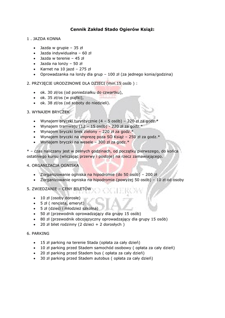 Cennik Zakład Stado Ogierów Książ: 1 . JAZDA KONNA Jazda w grupie – 35 zł Jazda indywidualna – 60 zł Jazda w terenie – 45 zł Jazda na lonży – 50 zł Karnet na 10 jazd – 275 zł Oprowadzanka na lonży dla grup – 100 zł (za jednego konia/godzina) 2. PRZYJĘCIE URODZINOWE DLA DZIECI (min.15 osób ) : ok. 30 zł/os (od poniedziałku do czwartku), ok. 35 zł/os (w piątki), ok. 38 zł/os (od soboty do niedzieli). 3. WYNAJEM BRYCZEK Wynajem Wynajem Wynajem Wynajem Wynajem bryczki turystycznie (4 – 5 osób) – 220 zł za godz.* tramwaju (12 – 15 osób) - 220 zł za godz.* bryczki brek zielony – 220 zł za godz.* bryczki na imprezę poza SO Książ – 250 zł za godz.* bryczki na wesele – 300 zł za godz.* * – czas naliczany jest w pełnych godzinach, od początku pierwszego, do końca ostatniego kursu (wliczając przerwy i postoje) na rzecz zamawiającego. 4. ORGANIZACJA OGNISKA Zorganizowanie ogniska na hipodromie (do 50 osób) – 200 zł Zorganizowanie ogniska na hipodromie (powyżej 50 osób) – 10 zł od osoby 5. ZWIEDZANIE – CENY BILETÓW 10 zł (osoby dorosłe) 5 zł ( rencista, emeryt) 5 zł (dzieci i młodzież szkolna) 50 zł (przewodnik oprowadzający dla grupy 15 osób) 80 zł (przewodnik obcojęzyczny oprowadzający dla grupy 15 osób) 20 zł bilet rodzinny (2 dzieci + 2 dorosłych ) 6. PARKING 15 10 20 30 zł zł zł zł parking parking parking parking na terenie Stada (opłata za cały dzień) przed Stadem samochód osobowy ( opłata za cały dzień) przed Stadem bus ( opłata za cały dzień) przed Stadem autobus ( opłata za cały dzień) 7. Pensjonat - 6 pokoi (5 pokoi 2 osob.,1 pokój 3 osob.) wynajęcie całości pok. nr 1 pok. nr 2 pok. nr 3 pok. nr 4 pok. nr 5 pok. nr 6 ( 3os.) Wynajęcie czasowo zawieszone - 600,-zł / doba - 110 zł /doba - 100 zł /doba - 120 zł /doba - 120 zł /doba - 140 zł / doba -140 zł / doba 8. Wynajem terenu wynajem hipodromu dla grup do 50 osób - 1000 zł wynajem hipodromu powyżej 50 osób – cena ustalana indywidualnie** wynajem terenu wokół Stada - cena ustalana indywidualnie ** wynajem zabytkowej powozowni z przeznaczeniem na ucztę staropolska – od 100 zł/godz. max 30 osób ** Cena uzależniona od wielkości wynajmowanego terenu oraz od ilości uczestników 9. Oferta dla młodzieży szkolnej*** 1. przejazd wozami biesiadnymi, zwiedzanie z przewodnikiem zabytkowych stajni, ognisko – 15 zł/os 2. przejazd wozami biesiadnymi, zwiedzanie z przewodnikiem zabytkowych stajni, - 12 zł/os 3. zwiedzanie z przewodnikiem zabytkowych stajni, ognisko – 10 zł/os 4. przejazd wozami biesiadnymi, zwiedzanie z przewodnikiem zabytkowych stajni, oprowadzanka na koniu - 18 zł/os *** Dotyczy grup powyżej 15 osób, na każde 10 osób jeden opiekun wstęp wolny. 10. Oferta dla grup zorganizowanych Zwiedzanie zabytkowych stajni z przewodnikiem, przejazd wozami biesiadnymi, ognisko – 40 zł/osoba (grupa min. 10 osób) Weekend w siodle – jazdy konne od piątku do niedzieli - od 180 zł /os (4 jazdy indywidualne) Nauka powożenia zaprzęgiem jednokonnym – od 50 zł/os – 30 min Kursy farmerskie – podstawy pielęgnacji i żywienia koni, nauka siodłania i zaprzęgania koni, zapoznanie z obowiązkami i kompetencjami masztalerza, ognisko, certyfikat masztalerza –50 zł/os dla grup min. 12 os Organizacja pokazów – cena do uzgodnienia Przejażdżka bryczkami na terenie Książa i okolicach – od 25 zł/os dla grup min. 10 osób – 45 min. Organizacja imprez integracyjnych – cena do uzgodnienia **** Kwoty podane w cenniku są kwotami brutto