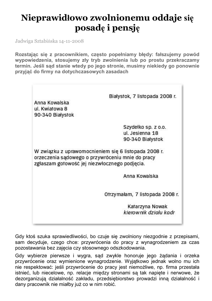 Nieprawidłowo zwolnionemu oddaje się posadę i pensję Jadwiga Sztabińska 14-11-2008 Rozstając się z pracownikiem, często popełniamy błędy: fałszujemy powód wypowiedzenia, stosujemy zły tryb zwolnienia lub po prostu przekraczamy termin. Jeśli sąd stanie wtedy po jego stronie, musimy niekiedy go ponownie przyjąć do firmy na dotychczasowych zasadach Gdy ktoś szuka sprawiedliwości, bo czuje się zwolniony niezgodnie z przepisami, sam decyduje, czego chce: przywrócenia do pracy z wynagrodzeniem za czas pozostawania bez zajęcia czy stosownego odszkodowania. Gdy wybierze pierwsze i wygra, sąd zwykle honoruje jego żądania i orzeka przywrócenie oraz wymienione wynagrodzenie. Wyjątkowo jednak wolno mu ich nie respektować: jeśli przywrócenie do pracy jest niemożliwe, np. firma przestała istnieć, lub niecelowe, np. relacje między stronami są tak napięte i nerwowe, że dezorganizują działalność zakładu, przedsiębiorstwo prowadzi inną działalność i dany pracownik nie miałby już co w nim robić. Uwaga! Sąd jest związany roszczeniami pracowników chronionych przed rozwiązaniem umowy o pracę, np. ciężarnej, osoby w wieku przedemerytalnym, związkowca, przewlekle chorego itd. Gdy więc brzemienna kobieta, która dostała wymówienie, występuje o przywrócenie, sąd musi je orzec. Wyrok przywracający zatrudnionego do pracy to jednak dopiero początek obowiązków z tym związanych, jakie mamy w związku ze wznowieniem współpracy z osobą przywróconą do pracy przez sąd. Wszystkie warto zrealizować, gdyż ignorancja takiego orzeczenia stanowi wykroczenie przeciwko prawom pracownika zagrożone grzywną nawet do 30 tys. zł. Wynika tak z art. 282 § 2 kodeksu pracy. OBOWIĄZEK 1. Czekamy siedem dni od dnia uprawomocnienia orzeczenia Wygrany przez byłego podwładnego powrót do firmy nie oznacza wcale, że natychmiast musimy szykować dla niego stanowisko Ma to zrobić – art. 48 § 1 kodeksu pracy – w ciągu siedmiu dni od daty uprawomocnienia się orzeczenia przywracającego go do firmy. Owe siedem dni biegnie od daty uprawomocnienia się orzeczenia sądowego przywracającego do pracy, co potwierdził Sąd Najwyższy w wyroku z 19 grudnia 1997 r. (I PKN 444/97). Jeśli pracownik przegapi ten termin, nie mamy obowiązku ponownego zatrudnienia i może on stracić szansę na powrót. Przed takimi konsekwencjami uchroni się tylko wtedy, gdy wykaże, że opóźnienie nastąpiło z przyczyn od niego niezależnych. Wówczas powinniśmy go przyjąć, mimo przekroczenia ustawowego terminu (wyrok SN z 12 lipca 2005 r., II PK 358/ 04). Przykład 1 Pan Andrzej wygrał przed sądem pierwszej instancji przywrócenie do pracy. Były szef odwołał się od orzeczenia, o czym pełnomocnik procesowy nie poinformował pana Andrzeja. O tym że sąd drugiej instancji też stanął po jego stronie, dowiedział się dopiero dwa tygodnie po uprawomocnieniu się orzeczenia drugiej instancji. Następnego dnia zgłosił gotowość podjęcia pracy u byłego pracodawcy, ale ten odesłał go z kwitkiem, powołując się na przekroczenie siedmiodniowego terminu na zgłoszenie. Nie pomogły wyjaśnienia pana Andrzeja, że zwłoka nie nastąpiła z jego winy. Sprawa trafiła aż do ostatniej instancji – Sądu Najwyższego. Ten uznał, że niepowiadomienie pana Andrzeja o wyroku przywracającym do pracy przez pełnomocnika procesowego to przyczyna niezależna od tego pracownika. Teraz pracodawca nie miał wyboru, musiał ponownie zatrudnić pana Andrzeja. Chęć powrotu najlepiej na piśmie Zgłoszenie gotowości do podjęcia pracy może nastąpić w dowolnej formie. Przepisy nic tu bowiem nie narzucają. Pracownik może zatem zadzwonić do pracodawcy, wysłać faks lub list (tradycyjny albo e-mail) czy też pojechać osobiście. Byle przekazał jasny komunikat, że chce reaktywować stosunek pracy i jest gotowy niezwłocznie przystąpić do realizacji obowiązków z niego wynikających (wyrok SN z 12 listopada 2003 r., I PK 524/02). Oczywiście dla celów dowodowych na wypadek ewentualnego sporu najlepiej, aby zrobił to w formie pisemnej. Przykład 2 Pani Anna po roku utarczek sądowych została przywrócona do pracy. Orzeczenie uprawomocniło się 6 listopada 2008 r. i następnego dnia pojawiła się w firmie, by zgłosić swoją gotowość do pracy. Przygotowała krótkie pismo w dwóch egzemplarzach: jeden zostawiła w dziale kadr, na drugim poprosiła o pokwitowanie przyjęcia. Wyglądało ono tak: Odmawiamy tylko w jednej sytuacji Siedmiodniowy termin na zgłoszenie gotowości do pracy ma ogromne znaczenie dla obu stron. Jeśli zatrudniony nie dotrzyma go z własnej winy, traci prawo do ponownego zatrudnienia, gdyż pracodawca może wówczas odmówić jego przyjęcia. Pozwala mu na to art. 48 § 1 kodeksu pracy. Jest to jednak jedyna uzasadniona przyczyna odmowy wykonania orzeczenia sądowego o przywróceniu do pracy. I co ważne, odmowa nie jest równoznaczna z wygaśnięciem stosunku pracy – zauważył SN w orzeczeniu z 23 listopada 2001 r. (I PKN 657/00). Nie możemy więc powiedzieć nie, gdy pracownik w chwili zgłaszania powrotu jest zatrudniony gdzie indziej (wyrok SN z 4 grudnia 2003 r., I PK 109/03). Ten ostatni ma bowiem – w świetle art. 48 § 2 kodeksu pracy – prawo bez wypowiedzenia, za trzydniowym uprzedzeniem, rozwiązać umowę o pracę w ciągu siedmiu dni od przywrócenia do pracy. Według orzeczenia SN z 16 kwietnia 2003 r. (I PK 154/02) nie wolno nam także zasłaniać się likwidacją stanowiska, które zwolniony poprzednio zajmował. I tak musimy go wtedy ponownie zatrudnić. Przykład 3 Pan Marcin został zwolniony z powodu likwidacji jego stanowiska – specjalisty ds. kontroli wydatków. Jego zdaniem nie to było przyczyną, i dlatego domagał się przywrócenia do pracy przed sądem. Wykazał, że jego dotychczasowa posada pozostała, a firma ją tylko inaczej nazwała i obsadziła kim innym. Sąd przyznał mu rację i przywrócił go do