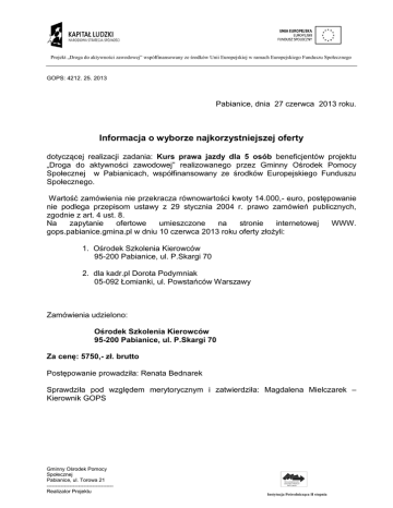 Projekt „Droga do aktywności zawodowej” współfinansowany ze środków Unii Europejskiej w ramach Europejskiego Funduszu Społecznego GOPS: 4212. 25. 2013 Pabianice, dnia 27 czerwca 2013 roku. Informacja o wyborze najkorzystniejszej oferty dotyczącej realizacji zadania: Kurs prawa jazdy dla 5 osób beneficjentów projektu „Droga do aktywności zawodowej” realizowanego przez Gminny Ośrodek Pomocy Społecznej w Pabianicach, współfinansowany ze środków Europejskiego Funduszu Społecznego. Wartość zamówienia nie przekracza równowartości kwoty 14.000,- euro, postępowanie nie podlega przepisom ustawy z 29 stycznia 2004 r. prawo zamówień publicznych, zgodnie z art. 4 ust. 8. Na zapytanie ofertowe umieszczone na stronie internetowej WWW. gops.pabianice.gmina.pl w dniu 10 czerwca 2013 roku oferty złożyli: 1. Ośrodek Szkolenia Kierowców 95-200 Pabianice, ul. P.Skargi 70 2. dla kadr.pl Dorota Podymniak 05-092 Łomianki, ul. Powstańców Warszawy Zamówienia udzielono: Ośrodek Szkolenia Kierowców 95-200 Pabianice, ul. P.Skargi 70 Za cenę: 5750,- zł. brutto Postępowanie prowadziła: Renata Bednarek Sprawdziła pod względem merytorycznym i zatwierdziła: Magdalena Mielczarek – Kierownik GOPS Gminny Ośrodek Pomocy Społecznej Pabianice, ul. Torowa 21 -------------------------------------Realizator Projektu Instytucja Pośrednicząca II stopnia Projekt „Droga do aktywności zawodowej” współfinansowany ze środków Unii Europejskiej w ramach Europejskiego Funduszu Społecznego Gminny Ośrodek Pomocy Społecznej Pabianice, ul. Torowa 21 -------------------------------------Realizator Projektu Instytucja Pośrednicząca II stopnia