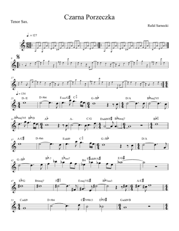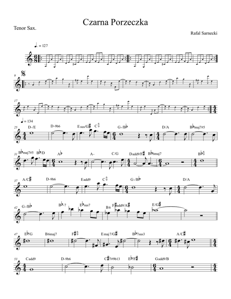 Czarna Porzeczka Tenor Sax. Rafal Sarnecki q. = 127 % & .. 6 & 8 .. 9 17 & œ œ J j œ œ J œ ‰ œ œ œ q = 134 4 w &4 25 œ œ œ œ œ J œ œ œ œ œ J œ œ ˙ b w # A/C 42 G -/B & & ˙ b b & #w 47 E /G 4 &4 w 53 C add9 ˙ œ J œ J œ œ œ J œ J œ œ œ œ œ œ J œ œ œ œ .. .. œ J œ œ œ J #œ œ J œ œ œ œ œ J œ J œ œ œ J 6 9 œ œ œ œ œ œ #œ œ œ J œ œ œ J jœ œ œ œ œ J Œ ‰ œJ 44 ˙ D/A # B b6maj7 j Œ ‰ œ ˙ œ . œ œ . œJ 44 ˙ œ œ . 46 w J J C/G A- œ. œ œ. J œ Cœ . J D add9/F œœ 6 w 4 b œ œ œ œ œ œ œ œ J œ œ œ J E add9 # #˙ #w B 6maj7 F ˙ D -9b6 6 9 6 9 G -/B # b œ . j # œ . j# ˙ ˙ #œ œ C #7#9b13 E b/F # œ ˙ œ. b˙ J E maj7/G B 7sus3 œ J œ œ œ J œ J œ œ J œ b œ. œ ˙ J œ .. œ .. 44 œ. œ J B maj7#5 Ó b 44 w B 6 9 œ. # Œ ‰ # œJ 46 # œ . # œ w J A/C 6 4 w œ #œ œ J D/A G add9/B œ œ Œ ‰ œ 44 ˙ J E/G # B b-7 E bsus7 F #add9/A # B 6 b œ bœ œ œ bœ bœ bœ œ œ bw ˙ œ œ J D -9b6 œ. œ œ œ œ œ # C G -/B b œ œ . œ œ. œ œ. J œ6 w 4 J B maj7#5 B /D 37 œ œ J œ œ œ E sus/G b Ab œ . . J œ œœ 6 w œ & 4 31 #œ œ J œ J œ J D -9b6 D -/E œ œ œ œ #œ œ Ó j œ Ó 44 4 4 b & 44 b ˙ . b b˙ 2 B /A 57 C -9 62 & bœ. œ œ J & b B -9 bœ œ œ bw bw # 6 9 E sus7 # √ bw bœ Ó œ bœ b˙ œ 4 4 œ œ # bw w 6 9 F add9/A #˙ ˙ b˙ # #˙ B6 C -11 C F -7 B maj7 68 6 4 œ œ b B -7 Œ Czarna Porzeczka C -7 F # 6 9 # E/G w # # ˙ B b-9 œ b œ . œ . b œ J b œ . b œJ ˙ J # C /B C sus9 C -9 œ. bœ œbœ œ J bœ # bw 6 9 G Ó 6 9 b bw E add9/G # b w B sus b 6 9 repeat & .. ’’’’ ’’’’ ’’’’ ’’’’ ’’’’ ’’’’ ’’’’ ’’’’.. B maj7 C# C -7 F# B maj7 F -7 œ œ œ b œ b œ 84 b˙ œ œ. b˙ bœ. ˙ bœ. bœ. bœ. b˙ bœ. b˙ bœ. bœ J J J J J J & J E badd9/G b œ # E 6maj7 b œ œ . F #-6 90 C b œ b œ . . ˙ J bœ J . œj œ œ . # œ . œj œ œ . # œ . j œ œ . # œ . j œ œ . # œ & J J J #œ J #œ J B maj7 76 C C -7 F B maj7 6 9 F -7 C E add9/G until cue 6 9 6 9 # # . # œj œ œ . # œ & J q. = 127 6 & 8 .. 100 fi o G# 7 fi j œ. # œ œJ œ . #œ. D /C 96 œ œ œ œ œ œ œ œ œ œ . œ œ œ . œ . j œ œ . ˙ .. 4 &4 #œ J JJ 104 #œ œ œ œ o œ œ J œ. J œ œ œ œ E/D j œ œ. #œ J œ. F 7 œ œ œ œ œ GO BACK TO œ w J 68 ˙. ˙. ˙. œ 68 œ .. 44 % (BAR 9) 2