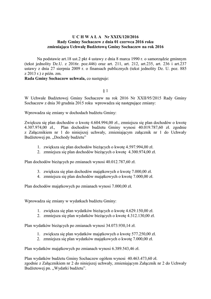 U C H W A Ł A Nr XXIX/120/2016 Rady Gminy Sochaczew z dnia 01 czerwca 2016 roku zmieniająca Uchwałę Budżetową Gminy Sochaczew na rok 2016 Na podstawie art.18 ust.2 pkt 4 ustawy z dnia 8 marca 1990 r. o samorządzie gminnym (tekst jednolity Dz.U. z 2016r. poz.446) oraz art. 211, art. 212, art.235, art. 236 i art.237 ustawy z dnia 27 sierpnia 2009 r. o finansach publicznych (tekst jednolity Dz. U. poz. 885 z 2013 r.) z późn. zm. Rada Gminy Sochaczew uchwala, co następuje: §1 W Uchwale Budżetowej Gminy Sochaczew na rok 2016 Nr XXII/95/2015 Rady Gminy Sochaczew z dnia 30 grudnia 2015 roku wprowadza się następujące zmiany: Wprowadza się zmiany w dochodach budżetu Gminy: Zwiększa się plan dochodów o kwotę 4.604.994,00 zł., zmniejsza się plan dochodów o kwotę 4.307.974,00 zł., Plan dochodów budżetu Gminy wynosi 40.019.787,60 zł. zgodnie z Załącznikiem nr 1 do niniejszej uchwały, zmieniającym załącznik nr 1 do Uchwały Budżetowej pn. „Dochody budżetu” 1. zwiększa się plan dochodów bieżących o kwotę 4.597.994,00 zł. 2. zmniejsza się plan dochodów bieżących o kwotę 4.300.974,00 zł. Plan dochodów bieżących po zmianach wynosi 40.012.787,60 zł. 3. zwiększa się plan dochodów majątkowych o kwotę 7.000,00 zł. 4. zmniejsza się plan dochodów majątkowych o kwotę 7.000,00 zł. Plan dochodów majątkowych po zmianach wynosi 7.000,00 zł. Wprowadza się zmiany w wydatkach budżetu Gminy: 1. zwiększa się plan wydatków bieżących o kwotę 4.629.150,00 zł. 2. zmniejsza się plan wydatków bieżących o kwotę 4.312.130,00 zł. Plan wydatków bieżących po zmianach wynosi 34.073.930,14 zł. 1. zwiększa się plan wydatków majątkowych o kwotę 577.250,00 zł. 2. zmniejsza się plan wydatków majątkowych o kwotę 7.000,00 zł. Plan wydatków majątkowych po zmianach wynosi 6.389.543,46 zł. Plan wydatków budżetu Gminy Sochaczew ogółem wynosi 40.463.473,60 zł. zgodnie z Załącznikiem nr 2 do niniejszej uchwały, zmieniającym Załącznik nr 2 do Uchwały Budżetowej pn. „Wydatki budżetu”. 1. Wprowadza się zmiany w dochodach i wydatkach związanych z realizacją zadań z zakresu administracji rządowej i innych zleconych odrębnymi ustawami zgodnie z załącznikiem nr 3 do niniejszej uchwały, zmieniającym załącznik nr 4 do Uchwały Budżetowej pn. "Dochody i wydatki związane z realizacją zadań z zakresu administracji rządowej i innych zleconych odrębnymi ustawami." 2. Wprowadza się zmiany w dotacjach celowych dla podmiotów zaliczanych do sektora finansów publicznych w 2016r. zgodnie z załącznikiem nr 4 do niniejszej uchwały, zmieniającym załącznik nr 5 do Uchwały Budżetowej pn. "Dotacje podmiotowe” 3. Wprowadza się zmiany w wydatkach budżetu Gminy na zadania inwestycyjne na 2016 rok zgodnie z załącznikiem nr 5 do niniejszej uchwały zmieniającym załącznik nr 9 do Uchwały Budżetowej pn. „Wydatki budżetu gminy na zadania inwestycyjne na 2016 rok nieobjęte wykazem przedsięwzięć do Wieloletniej Prognozy Finansowej”. 4. Wprowadza się zmiany w planie przychodów i rozchodów Gminy na rok 2016. Różnica między dochodami a wydatkami stanowi deficyt budżetu w kwocie 443.686,00 zł, który zostanie pokryty przychodami z wolnych środków w kwocie 443.686,00 zł. Przychody budżetu wynoszą 2.416.250,00 zł zgodnie z załącznikiem Nr 6 do niniejszej Uchwały, a rozchody budżetu wynoszą 1.972.564,00 zł zgodnie z załącznikiem Nr 6. §2 Wykonanie uchwały powierza się Wójtowi Gminy. §3 Uchwała wchodzi w życie z dniem podjęcia. Przewodniczący Rady Gminy Sochaczew Czesław Ćwikliński Uzasadnienie Zmiany do budżetu Plan dochodów bieżących zwiększono o kwotę 4.597.994,00 zł. Plan dochodów bieżących zmniejszono o kwotę 4.300.974,00 zł zgodnie z załącznikiem nr 1. Dział 801 - wprowadza się plan dochodów w rozdziale 80101 par. 2010 na kwotę 44.086,00 zł. oraz w rozdziale 80110 par. 2010 na kwotę 21.500,00zł zgodnie z decyzją nr 57 Wojewody Mazowieckiego z dnia 29.04.2016r. przyznającą dotację celową na wyposażenie szkół w podręczniki i materiały edukacyjne lub materiały ćwiczeniowe zgodnie z postanowieniem art. 22ae ust. 3 ustawy z dnia 7 września 1991 roku o systemie oświaty oraz art. 13 ustawy z dnia 30 maja 2014r. o zmianie ustawy o systemie oświaty oraz niektórych innych ustaw. - wprowadza się plan dochodów w rozdziale 80103 par. 2030 na kwotę 226.050,00 zł zgodnie z decyzją nr 49 Wojewody Mazowieckiego z dnia 29 kwietnia 2016 r. przyznającą dotację celową na realizację zadań własnych w zakresie wychowania przedszkolnego. - zwiększa się plan dochodów w rozdziale 80146 par. 2700 o kwotę 1.944,00 zł z tytułu środków pozyskanych z Fundacji Inicjatyw Społecznych w Olsztynie na kształcenie ustawiczne pracowników Zespołu Szkół w Kątach zgodnie z umową z dnia 21.04.2016r. Dział 852 - wprowadza się plan dochodów w rozdziale 85211 par. 2060 na kwotę 4.300.974,00 zł zgodnie z decyzją nr 42/2016r Wojewody Mazowieckiego z dnia 28.04.2016r. w związku ze zmianą klasyfikacji dochodów, wydatków, przychodów i rozchodów oraz środków pochodzących ze źródeł zagranicznych. - zwiększa się plan dochodów w rozdziale 85216 par. 2030 o kwotę 3.226,00 zł. zgodnie z decyzją nr 50 Wojewody Mazowieckiego z dnia 29.04.2016r zwiększającą plan dotacji na wypłatę zasiłków stałych, o których mowa w art. 17 ust. 1 pkt. 19 ustawy o pomocy społecznej. - zmniejsza się plan dochodów w rozdziale 85295 par. 2010 o kwotę 4.300.974,00 zł. zgodnie z decyzją nr 42/2016 Wojewody Mazowieckiego w związku ze zmianą klasyfikacji budżetowej. - zwiększa się plan dochodów w rozdziale 85295 par. 2010 o kwotę 214,00 zł. zgodnie z decyzją nr 40 Wojewody Mazowieckiego, zwiększającą plan dotacji na realizację zadań związanych z przyznaniem Kart Dużej rodziny. Plan dochodów majątkowych zwiększono o kwotę 7.000,00 zł, Plan doc