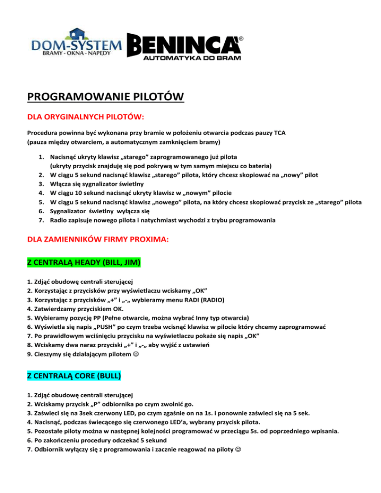 PROGRAMOWANIE PILOTÓW DLA ORYGINALNYCH PILOTÓW: Procedura powinna być wykonana przy bramie w położeniu otwarcia podczas pauzy TCA (pauza między otwarciem, a automatycznym zamknięciem bramy) 1. Nacisnąć ukryty klawisz „starego” zaprogramowanego już pilota (ukryty przycisk znajduję się pod pokrywą w tym samym miejscu co bateria) 2. W ciągu 5 sekund nacisnąć klawisz „starego” pilota, który chcesz skopiować na „nowy” pilot 3. Włącza się sygnalizator świetlny 4. W ciągu 10 sekund nacisnąć ukryty klawisz w „nowym” pilocie 5. W ciągu 5 sekund nacisnąć klawisz „nowego” pilota, na który chcesz skopiować przycisk ze „starego” pilota 6. Sygnalizator świetlny wyłącza się 7. Radio zapisuje nowego pilota i natychmiast wychodzi z trybu programowania DLA ZAMIENNIKÓW FIRMY PROXIMA: Z CENTRALĄ HEADY (BILL, JIM) 1. Zdjąć obudowę centrali sterującej 2. Korzystając z przycisków przy wyświetlaczu wciskamy „OK” 3. Korzystając z przycisków „+” i „-„ wybieramy menu RADI (RADIO) 4. Zatwierdzamy przyciskiem OK. 5. Wybieramy pozycję PP (Pełne otwarcie, można wybrać Inny typ otwarcia) 6. Wyświetla się napis „PUSH” po czym trzeba wcisnąć klawisz w pilocie który chcemy zaprogramować 7. Po prawidłowym wciśnięciu przycisku na wyświetlaczu pokaże się napis „OK” 8. Wciskamy dwa naraz przyciski „+” i „-„ aby wyjść z ustawień 9. Cieszymy się działającym pilotem ☺ Z CENTRALĄ CORE (BULL) 1. Zdjąć obudowę centrali sterującej 2. Wciskamy przycisk „P” odbiornika po czym zwolnić go. 3. Zaświeci się na 3sek czerwony LED, po czym zgaśnie on na 1s. i ponownie zaświeci się na 5 sek. 4. Nacisnąć, podczas świecącego się czerwonego LED’a, wybrany przycisk pilota. 5. Pozostałe piloty można w następnej kolejności programować w przeciągu 5s. od poprzedniego wpisania. 6. Po zakończeniu procedury odczekać 5 sekund 7. Odbiornik wyłączy się z programowania i zacznie reagować na piloty ☺