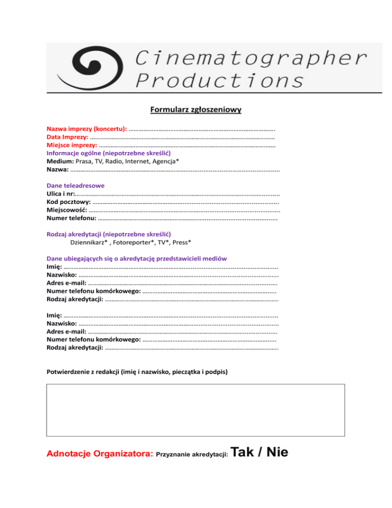 Formularz zgłoszeniowy Nazwa imprezy (koncertu): ……………………………………………………………………………. Data Imprezy: ………………………………………………………………………………………………… Miejsce imprezy: ……………………………………………………………………………………………. Informacje ogólne (niepotrzebne skreślić) Medium: Prasa, TV, Radio, Internet, Agencja* Nazwa: …………………………………………………………….................................................... Dane teleadresowe Ulica i nr:…………………………………………………………………………………………………........... Kod pocztowy: ………………………………………………..................................................... Miejscowość: …………………………………………………………….......................................... Numer telefonu: ………………………………………………………......................................... Rodzaj akredytacji (niepotrzebne skreślić) Dziennikarz* , Fotoreporter*, TV*, Press* Dane ubiegających się o akredytację przedstawicieli mediów Imię: ……………………………………………………………….................................................... Nazwisko: ………………………………………………………………............................................ Adres e-mail: …………………………………………………………………………………................... Numer telefonu komórkowego: …………………………………………………………………..... Rodzaj akredytacji: ………………………………………………………………………………………….. Imię: ……………………………………………………………….................................................... Nazwisko: ………………………………………………………………............................................ Adres e-mail: …………………………………………………………………………………................... Numer telefonu komórkowego: …………………………………………………………………..... Rodzaj akredytacji: ………………………………………………………………………………………….. Potwierdzenie z redakcji (imię i nazwisko, pieczątka i podpis) Adnotacje Organizatora: Przyznanie akredytacji: Tak / Nie