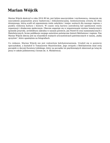 Marian Wójcik Marian Wójcik skończył w roku 2014 80 lat, jest byłym nauczycielem i wychowawcą, cieszącym się szacunkiem pasjonatem pracy badawczej i dokumentacyjnej, kontynuowanej zresztą do dnia dzisiejszego, którą ocalił od zapomnienia wiele zabytków i miejsc ważnych dla naszego regionu z punktu widzenia kultury i historii. W czasie swej kariery zawodowej był opiekunem wielu organizacji i działaczem społecznym. Obecnie angażuje się w organizowanie wystaw tematycznych (pomniki przyrody, architektura sakralna w naszym powiecie, Jan Paweł II) oraz numizmatycznych i filatelistycznych, liczne publikacje swojego autorstwa poświęcone historii Bełchatowa i regionu. Pan Marian Wójcik obecny jest na wszystkich ważnych uroczystościach patriotycznych w naszej „małej ojczyźnie”, które upamiętnia na fotografiach. Co ciekawe, Marian Wójcik nie jest rodowitym bełchatowianinem. Urodził się w powiecie opoczyńskim, a kształcił w Tomaszowie Mazowieckim. Jego związek z Bełchatowem miał swój początek w decyzji Kuratora Łódzkiego, który na początku lat pięćdziesiątych skierował go tutaj do pracy w szkole podstawowej i liceum im. A. Mickiewicza.