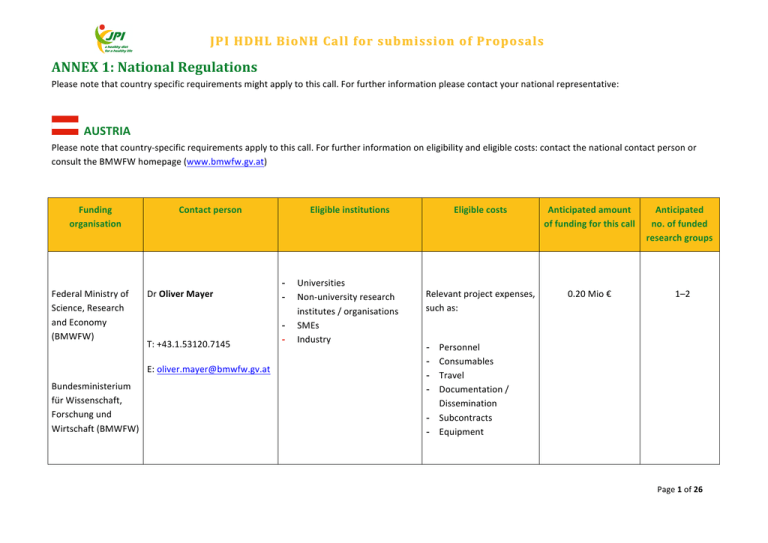 JPI HDHL BioNH Call for submission of Proposals ANNEX 1: National Regulations Please note that country specific requirements might apply to this call. For further information please contact your national representative: AUSTRIA Please note that country-‐specific requirements apply to this call. For further information on eligibility and eligible costs: contact the national contact person or consult the BMWFW homepage (www.bmwfw.gv.at) Funding organisation Contact person Federal Ministry of Science, Research and Economy (BMWFW) Dr Oliver Mayer Bundesministerium für Wissenschaft, Forschung und Wirtschaft (BMWFW) T: +43.1.53120.7145 E: [email protected] Eligible institutions - Eligible costs Universities Non-‐university research institutes / organisations SMEs Industry Anticipated amount of funding for this call Relevant project expenses, such as: Anticipated no. of funded research groups 0.20 Mio € 1–2 - Personnel Consumables Travel Documentation / Dissemination - Subcontracts - Equipment Page 1 of 26 JPI HDHL BioNH Call for submission of Proposals Page 2 of 26 JPI HDHL BioNH Call for submission of Proposals BELGIUM Please note that country-‐specific requirements apply to this call. For further information follow the links below or contact the national representative. See details of this grant on the FWO website for further information on eligibility and eligible costs for participants from Belgium: www.fwo.be . The following pages of this document detail the eligibility requirements for applicants from host institutions in Belgium. Funding organisation Research Foundation – Flanders (FWO) www.fwo.be Contact person Dr Olivier Boehme Eligible institutions Science Policy Advisor -‐ -‐ -‐ T: +32 2 550 1545 -‐ Geertrui Poelaert a Flemish university a Flemish research institution the Transnational university Limburg a federal scientific institution, if the co-‐promoter belongs to the Dutch language register. Eligible costs Anticipated amount of funding for this call -‐ Bench fees -‐ Equipment costs -‐ Personnel grants 0.40 Mio € + 2 0.10 Mio € top-‐up Advisor Research Affairs T: +32 2 550 1555 Research Foundation Flanders (FWO) Egmontstraat 5, 1000 Brussels a Anticipated no. of funded research groups E: [email protected] Page 3 of 26 JPI HDHL BioNH Call for submission of Proposals W: www.fwo.be a Max. 100,000 top-‐up funding: 10,000–25,000/existing FWO-‐funded project (4–10 projects). Research Foundation–Flanders (FWO) intends to integrate existing FWO projects into the consortia of the JPI Climate call through this top-‐up. Page 4 of 26 JPI HDHL BioNH Call for submission of Proposals The following issues will be considered in a FWO eligibility check that will be conducted on any proposals with researchers from host institutions in Belgium. Regarding the eligibility of candidates for projects funded by FWO, art. 9 of the FWO-‐regulation on the regular research projects is applicable. In this article is stated who can apply as a (co-‐)promoter for a research project (here only those cases that are relevant for JPI HDHL are listed): Promoter: -‐ an Independent Academic Staff member with an appointment of more than 10% at a Flemish university; -‐ an Independent Academic Staff member with an appointment of 10% at a Flemish university and whose main task is research; -‐ an Independent Academic Staff member with an appointment of 5% at a Flemish university and with an appointment as (assistant) clinical head or an equal function in a university hospital; -‐ an academic staff member with an appointment at the Evangelical Protestant Faculty in Leuven and the Faculty for Protestant Theology in Brussels; -‐ a research director of the FWO; -‐ a designated beneficiary of an ERC Starting Grant, an ERC Advanced Grant or an Odysseus II grant, with a Flemish university as a host institution. Co-‐promoter: All co-‐supervisors have to be researchers of at least postdoctoral level. Co-‐supervisors have to be affiliated to a Flemish university, or a Flemish research institution, or a Flemish university hospital, or the Transnational University Limburg, or the Evangelical Protestant Faculty in Leuven, or the Faculty for Protestant Theology in Brussels, or a federal scientific institution where the co-‐supervisor belongs to the Dutch-‐speaking community. (Foreign researchers can participate as co-‐supervisor in the project without FWO funding, provided the collaboration is relevant for the project).Researchers from outside Flanders can be involved as co-‐promoter without being entitled to receive funding from the FWO and insofar as this cooperation is relevant for the project. If more than one university is involved in the project, at least one promoter or co-‐promoter of each university has to fulfil the above. For the complete regulation of research projects, see: http://www.fwo.be/en/fellowships-‐funding/research-‐projects/research-‐project/regulations-‐for-‐ research-‐projects/ The objective of the FWO’s Research projects is to advance fundamental scientific research, on the initiative of researchers from all disciplines. The Research projects constitute an important tool with which to stimulate collaboration between different research teams. In this context, bench fees, equipment and personnel grants are made available to teams of researchers for conducting scientific high-‐value projects at the centre of scientific interest. Special attention is focused on projects that position their own research within a wider scientific arena and presuppose an interuniversity approach. Page 5 of 26 JPI HDHL BioNH Call for submission of Proposals DENMARK Please note that country-‐specific requirements apply to this call. For further information, follow this link or contact the national representative. Funding organisation The Danish Innovation Foundation www.fivu.dk Contact person(s) Susanne Hede T: + 45 7231 8392 E: [email prote