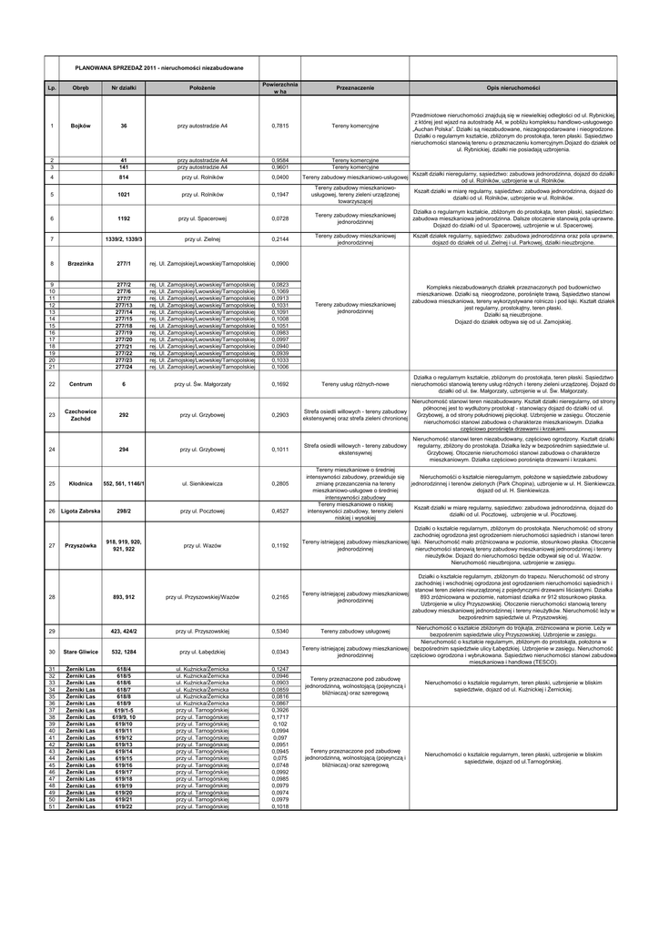 PLANOWANA SPRZEDAŻ 2011 - nieruchomości niezabudowane Lp. Obręb Nr działki Położenie Powierzchnia w ha Przeznaczenie 1 Bojków 36 przy autostradzie A4 0,7815 Tereny komercyjne 2 3 41 141 przy autostradzie A4 przy autostradzie A4 0,9584 0,9601 Tereny komercyjne Tereny komercyjne 4 814 przy ul. Rolników 0,0400 Tereny zabudowy mieszkaniowo-usługowej Kszałt działki nieregularny, sąsiedztwo: zabudowa jednorodzinna, dojazd do działki od ul. Rolników, uzbrojenie w ul. Rolników. 5 1021 przy ul. Rolników 0,1947 Tereny zabudowy mieszkaniowousługowej, tereny zieleni urządzonej towarzyszącej Kszałt działki w miarę regularny, sąsiedztwo: zabudowa jednorodzinna, dojazd do działki od ul. Rolników, uzbrojenie w ul. Rolników. 6 1192 przy ul. Spacerowej 0,0728 Tereny zabudowy mieszkaniowej jednorodzinnej Działka o regularnym kształcie, zbliżonym do prostokąta, teren płaski, sąsiedztwo: zabudowa mieszkaniowa jednorodzinna. Dalsze otoczenie stanowią pola uprawne. Dojazd do działki od ul. Spacerowej, uzbrojenie w ul. Spacerowej. 7 1339/2, 1339/3 przy ul. Zielnej 0,2144 Tereny zabudowy mieszkaniowej jednorodzinnej Kszałt działek regularny, sąsiedztwo: zabudowa jednorodzinna oraz pola uprawne, dojazd do działek od ul. Zielnej i ul. Parkowej, działki nieuzbrojone. 277/1 rej. Ul. Zamojskiej/Lwowskiej/Tarnopolskiej 0,0900 277/2 277/6 277/7 277/13 277/14 277/15 277/18 277/19 277/20 277/21 277/22 277/23 277/24 rej. Ul. Zamojskiej/Lwowskiej/Tarnopolskiej rej. Ul. Zamojskiej/Lwowskiej/Tarnopolskiej rej. Ul. Zamojskiej/Lwowskiej/Tarnopolskiej rej. Ul. Zamojskiej/Lwowskiej/Tarnopolskiej rej. Ul. Zamojskiej/Lwowskiej/Tarnopolskiej rej. Ul. Zamojskiej/Lwowskiej/Tarnopolskiej rej. Ul. Zamojskiej/Lwowskiej/Tarnopolskiej rej. Ul. Zamojskiej/Lwowskiej/Tarnopolskiej rej. Ul. Zamojskiej/Lwowskiej/Tarnopolskiej rej. Ul. Zamojskiej/Lwowskiej/Tarnopolskiej rej. Ul. Zamojskiej/Lwowskiej/Tarnopolskiej rej. Ul. Zamojskiej/Lwowskiej/Tarnopolskiej rej. Ul. Zamojskiej/Lwowskiej/Tarnopolskiej 0,0823 0,1069 0,0913 0,1031 0,1091 0,1008 0,1051 0,0983 0,0997 0,0940 0,0939 0,1033 0,1006 6 przy ul. Św. Małgorzaty 0,1692 8 Brzezinka 9 10 11 12 13 14 15 16 17 18 19 20 21 22 23 Centrum Czechowice Zachód 24 292 294 przy ul. Grzybowej przy ul. Grzybowej 0,1011 ul. Sienikiewicza 0,2805 26 Ligota Zabrska 298/2 przy ul. Pocztowej 0,4527 przy ul. Wazów Działka o regularnym kształcie, zbliżonym do prostokąta, teren płaski. Sąsiedztwo nieruchomości stanowią tereny usług różnych i tereny zieleni urządzonej. Dojazd do działki od ul. św. Małgorzaty, uzbrojenie w ul. Św. Małgorzaty. Strefa osiedli willowych - tereny zabudowy ekstensywnej 552, 561, 1146/1 918, 919, 920, 921, 922 Kompleks niezabudowanych działek przeznaczonych pod budownictwo mieszkaniowe. Działki są nieogrodzone, porośnięte trawą. Sąsiedztwo stanowi zabudowa mieszkaniowa, tereny wykorzystywane rolniczo i pod łąki. Kształt działek jest regularny, prostokątny, teren płaski. Działki są nieuzbrojone. Dojazd do działek odbywa się od ul. Zamojskiej. 0,2903 Kłodnica Przyszówka Tereny usług różnych-nowe Przedmiotowe nieruchomości znajdują się w niewielkiej odległości od ul. Rybnickiej, z której jest wjazd na autostradę A4, w pobliżu kompleksu handlowo-usługowego „Auchan Polska”. Działki są niezabudowane, niezagospodarowane i nieogrodzone. Działki o regularnym kształcie, zbliżonym do prostokąta, teren płaski. Sąsiedztwo nieruchomości stanowią terenu o przeznaczeniu komercyjnym.Dojazd do działek od ul. Rybnickiej, działki nie posiadają uzbrojenia. Nieruchomość stanowi teren niezabudowany. Kształt działki nieregularny, od strony północnej jest to wydłużony prostokąt - stanowiący dojazd do działki od ul. Strefa osiedli willowych - tereny zabudowy Grzybowej, a od strony południowej pięciokąt. Uzbrojenie w zasięgu. Otoczenie ekstensywnej oraz strefa zieleni chronionej nieruchomości stanowi zabudowa o charakterze mieszkaniowym. Działka częściowo porośnięta drzewami i krzakami. 25 27 Tereny zabudowy mieszkaniowej jednorodzinnej Opis nieruchomości Tereny mieszkaniowe o średniej intensywności zabudowy, przewiduje się zmianę przezanczenia na tereny mieszkaniowo-usługowe o średniej intensywności zabudowy Tereny mieszkaniowe o niskiej intensywności zabudowy, tereny zieleni niskiej i wysokiej Nieruchomość stanowi teren niezabudowany, częściowo ogrodzony. Kształt działki regularny, zbliżony do prostokąta. Działka leży w bezpośrednim sąsiedztwie ul. Grzybowej. Otoczenie nieruchomości stanowi zabudowa o charakterze mieszkaniowym. Działka częściowo porośnięta drzewami i krzakami. Nieruchomośći o kształcie nieregularnym, położone w sąsiedztwie zabudowy jednorodzinnej i terenów zielonych (Park Chopina), uzbrojenie w ul. H. Sienkiewcza, dojazd od ul. H. Sienkiewicza. Kszałt działki w miarę regularny, sąsiedztwo: zabudowa jednorodzinna, dojazd do działki od ul. Pocztowej, uzbrojenie w ul. Pocztowej. 0,1192 Działki o kształcie regularnym, zbliżonym do prostokąta. Nieruchomość od strony zachodniej ogrodzona jest ogrodzeniem nieruchomości sąsiednich i stanowi teren Tereny istniejącej zabudowy mieszkaniowej łąki. Nieruchomość mało zróżnicowana w poziomie, stosunkowo płaska. Otoczenie jednorodzinnej nieruchomości stanowią tereny zabudowy mieszkaniowej jednorodzinnej i tereny nieużytków. Dojazd do nieruchomości będzie odbywał się od ul. Wazów. Nieruchomość nieuzbrojona, uzbrojenie w zasięgu. Działki o kształcie regularnym, zbliżonym do trapezu. Nieruchomość od strony zachodniej i wschodniej ogrodzona jest ogrodzeniem nieruchomości sąsiednich i stanowi teren zieleni nieurządzonej z pojedynczymi drzewami liściastymi. Działka Tereny istniejącej zabudowy mieszkaniowej 893 zróżnicowana w poziomie, natomiast działka nr 912 stosunkowo płaska. jednorodzinnej Uzbrojenie w ulicy Przyszowskiej. Otoczenie nieruchomości stanowią t