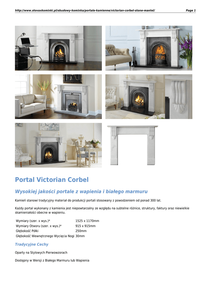 http://www.stovaxkominki.pl/obudowy-kominka/portale-kamienne/victorian-corbel-stone-mantel/ Page 1 Portal Victorian Corbel Wysokiej jakości portale z wapienia i białego marmuru Kamień stanowi tradycyjny materiał do produkcji portali stosowany z powodzeniem od ponad 300 lat. Każdy portal wykonany z kamienia jest niepowtarzalny ze względu na subtelne różnice, struktury, faktury oraz niewielkie skamieniałości obecne w wapieniu. Wymiary (szer. x wys.)* 1525 x 1170mm Wymiary Otworu (szer. x wys.)* 915 x 915mm Głębokość Półki 250mm Głębokość Wewnętrznego Wycięcia Nogi 30mm Tradycyjne Cechy Oparty na Stylowych Pierwowzorach Dostępny w Wersji z Białego Marmuru lub Wapienia