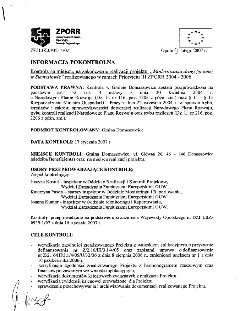 MIEJSCE KONTROLI: Gmina Domaszowice,ul. Gl6wna26, 46 - 146 Domaszowice