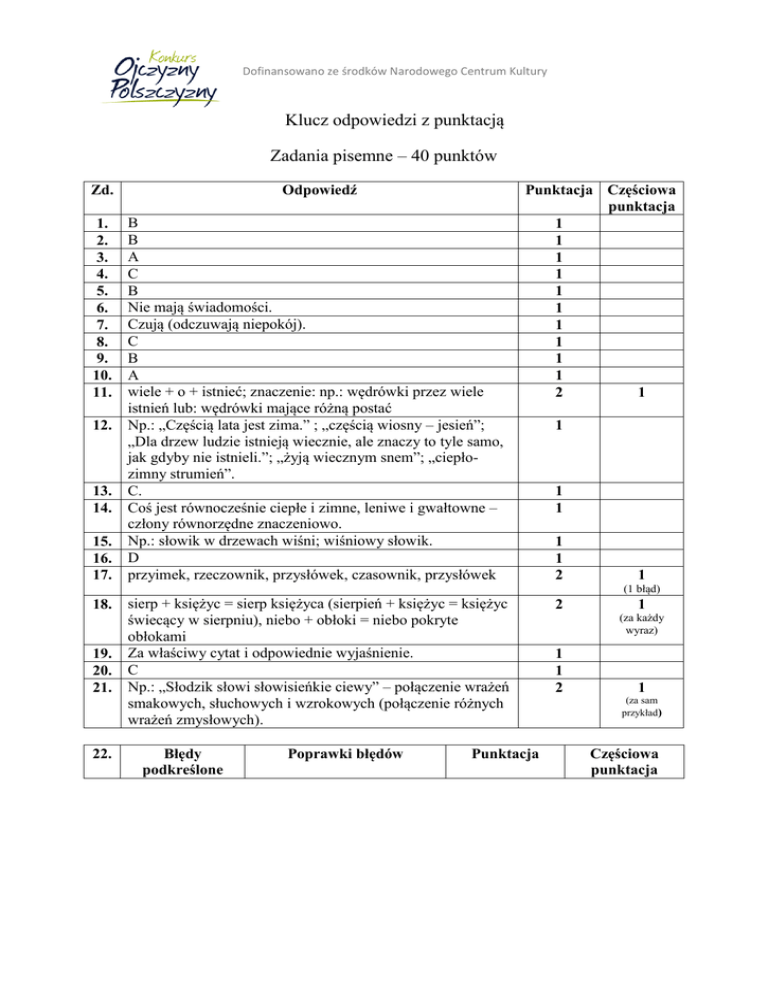 Dofinansowano ze środków Narodowego Centrum Kultury Klucz odpowiedzi z punktacją Zadania pisemne – 40 punktów Zd. Odpowiedź 1. 2. 3. 4. 5. 6. 7. 8. 9. 10. 11. B B A C B Nie mają świadomości. Czują (odczuwają niepokój). C B A wiele + o + istnieć; znaczenie: np.: wędrówki przez wiele istnień lub: wędrówki mające różną postać Np.: „Częścią lata jest zima.” ; „częścią wiosny – jesień”; „Dla drzew ludzie istnieją wiecznie, ale znaczy to tyle samo, jak gdyby nie istnieli.”; „żyją wiecznym snem”; „ciepłozimny strumień”. C. Coś jest równocześnie ciepłe i zimne, leniwe i gwałtowne – człony równorzędne znaczeniowo. Np.: słowik w drzewach wiśni; wiśniowy słowik. D przyimek, rzeczownik, przysłówek, czasownik, przysłówek 12. 13. 14. 15. 16. 17. Punktacja Częściowa punktacja 1 1 1 1 1 1 1 1 1 1 2 1 1 1 1 1 1 2 1 (1 błąd) 18. 19. 20. 21. 22. sierp + księżyc = sierp księżyca (sierpień + księżyc = księżyc świecący w sierpniu), niebo + obłoki = niebo pokryte obłokami Za właściwy cytat i odpowiednie wyjaśnienie. C Np.: „Słodzik słowi słowisieńkie ciewy” – połączenie wrażeń smakowych, słuchowych i wzrokowych (połączenie różnych wrażeń zmysłowych). Błędy podkreślone Poprawki błędów Punktacja 2 1 (za każdy wyraz) 1 1 2 1 (za sam przykład) Częściowa punktacja 1. patrząc na drzewa, zachwycały mnie… 1. gdy patrzyłem na drzewa, zachwycały mnie… 5 2. spadały w dół 2. spadały 3. sprawował troskę 3. sprawował pieczę (otaczał troską) 4. obejść się ze smakiem 4. obejść się smakiem 5. na dzień dzisiejszy 5. dzisiaj (dziś) 4, 3, 2, 1 (odpowiednio za właściwe wskazanie i poprawienie 4-3-2-1 bł.) Uwaga! Za zbędne podkreślenia i poprawki są odejmowane punkty (po jednym za niewłaściwe podkreślenie lub poprawienie każdego błędu nieistniejącego, jednak w sumie za to zadanie nie może być punktów ujemnych, najmniej 0 p.) Razem: 30 punktów 23. Kryteria oceny wypracowania: 10 punktów. a. Treść ( 4p.): zrozumienie tematu, trafność wyboru, argumentacja – sposób przedstawiania świata (konwencja, kompozycja, styl, leksyka i składnia), stosowność środków wobec treści, styl jako nośnik idei, czytelnicza atrakcyjność całości, piękność pisania. b. Forma (4p.): poprawność stylistyczna, kompozycja i akapitowanie, słownictwo i gramatyka, ortografia i interpunkcja. c. Szczególne wartości (2p.): funkcjonalność formy wobec treści (celu), przejawy uzdolnień pisarskich (talentu). Uwagi dla poprawiających wypracowanie W ocenianiu punkty wystawia się najpierw osobno: a. treść, b. forma, c. szczególne wartości; potem sumuje się punkty w ocenę całości. W pozycji c. należy wskazać (pod tekstem wypracowania) konkretnie punktowane wartości: w czym (jak) przejawia się funkcjonalność, w czym (jak) przejawiają się uzdolnienia. Ten sposób oceniania – łączenie holistyczności i analityczności – zakłada wysokie kompetencje jurora, dając mu dużą swobodę, jednakże pod pewnymi rygorami. Zadania ustne – 10 punktów Kryteria oceny Czytanie wiersza na głos (3p.): zamysł interpretacyjny, wyrazistość i donośność, dykcja. Interpretacja wiersza (7p.): zgodność tezy (hipotezy interpretacyjnej) z tekstem; argumenty (waga, spójność, pomysłowość); funkcjonalność analizy formalnej (opisu) – służebność tezie: język tworzywem poetyki; elegancja i oryginalność całej wypowiedzi; ewentualne konteksty tekstu.