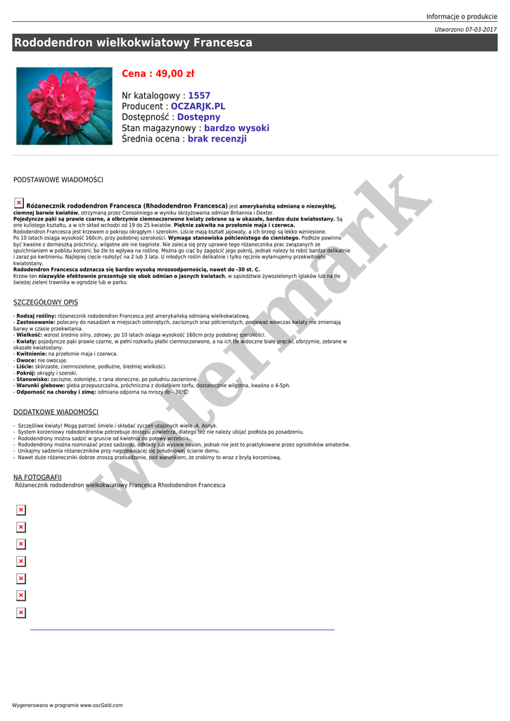 Informacje o produkcie Utworzono 07-03-2017 Rododendron wielkokwiatowy Francesca Cena : 49,00 zł Nr katalogowy : 1557 Producent : OCZARJK.PL Dostępność : Dostępny Stan magazynowy : bardzo wysoki Średnia ocena : brak recenzji PODSTAWOWE WIADOMOŚCI SZCZEGÓŁOWY OPIS er m ar k Różanecznik rododendron Francesca (Rhododendron Francesca) jest amerykańską odmianą o niezwykłej, ciemnej barwie kwiatów, otrzymaną przez Consoliniego w wyniku skrzyżowania odmian Britannia i Dexter. Pojedyncze pąki są prawie czarne, a olbrzymie ciemnoczerwone kwiaty zebrane są w okazałe, bardzo duże kwiatostany. Są one kulistego kształtu, a w ich skład wchodzi od 19 do 25 kwiatów. Pięknie zakwita na przełomie maja i czerwca. Rododendron Francesca jest krzewem o pokroju okrągłym i szerokim. Liście mają kształt jajowaty, a ich brzegi są lekko wzniesione. Po 10 latach osiąga wysokość 160cm, przy podobnej szerokości. Wymaga stanowiska półcienistego do cienistego. Podłoże powinno być kwaśne z domieszką próchnicy, wilgotne ale nie bagniste. Nie zaleca się przy uprawie tego różanecznika prac związanych ze spulchnianiem w pobliżu korzeni, bo źle to wpływa na roślinę. Można go ciąć by zagęścić jego pokrój, jednak należy to robić bardzo delikatnie i zaraz po kwitnieniu. Najlepiej cięcie rozłożyć na 2 lub 3 lata. U młodych roślin delikatnie i tylko ręcznie wyłamujemy przekwitnięte kwiatostany. Rododendron Francesca odznacza się bardzo wysoką mrozoodpornością, nawet do -30 st. C. Krzew ten niezwykle efektownie prezentuje się obok odmian o jasnych kwiatach, w sąsiedztwie żywozielonych iglaków lub na tle świeżej zieleni trawnika w ogrodzie lub w parku. - Rodzaj rośliny: różanecznik rododendron Francesca jest amerykańską odmianą wielkokwiatową. - Zastosowanie: polecany do nasadzeń w miejscach osłoniętych, zacisznych oraz półcienistych, ponieważ wówczas kwiaty nie zmieniają barwy w czasie przekwitania. - Wielkość: wzrost średnio silny, zdrowy, po 10 latach osiąga wysokość 160cm przy podobnej szerokości. - Kwiaty: pojedyncze pąki prawie czarne, w pełni rozkwitu płatki ciemnoczerwone, a na ich tle widoczne białe pręciki, olbrzymie, zebrane w okazałe kwiatostany. - Kwitnienie: na przełomie maja i czerwca. - Owoce: nie owocuje. - Liście: skórzaste, ciemnozielone, podłużne, średniej wielkości. - Pokrój: okrągły i szeroki. - Stanowisko: zaciszne, osłonięte, z rana słoneczne, po południu zacienione. - Warunki glebowe: gleba przepuszczalna, próchniczna z dodatkiem torfu, dostatecznie wilgotna, kwaśna o 4-5ph. - Odporność na choroby i zimę: odmiana odporna na mrozy do - 30°C. - at DODATKOWE WIADOMOŚCI Szczęśliwe kwiaty! Mogą patrzeć śmiele i składać życzeń utajonych wiele -A. Asnyk. System korzeniowy rododendronów potrzebuje dostępu powietrza, dlatego też nie należy ubijać podłoża po posadzeniu. Rododendrony można sadzić w gruncie od kwietnia do połowy września. Rododendrony można rozmnażać przez sadzonki, odkłady lub wysiew nasion, jednak nie jest to praktykowane przez ogrodników amatorów. Unikajmy sadzenia różaneczników przy nagrzewającej się południowej ścianie domu. Nawet duże różaneczniki dobrze znoszą przesadzanie, pod warunkiem, że zrobimy to wraz z bryłą korzeniową. w NA FOTOGRAFII Różanecznik rododendron wielkokwiatowy Francesca Rhododendron Francesca Wygenerowano w programie www.oscGold.com DLACZEGO WARTO KUPIĆ ROŚLINY U NAS - Wszystkie rośliny są dobrze ukorzenione, zdrowe oraz zadbane. Dokładamy wszelkich starań, aby wygląd roślin spełniał Państwa oczekiwania. Poza tym na większości stron naszych ofert na ostatnim zdjęciu poniżej przedstawiamy wygląd przykładowych rzeczywistych sadzonek, aby każdy mógł zobaczyć co kupuje. - W okresie zimowym, wczesnowiosennym lub późnojesiennym rododendrony sprzedajemy w stanie z liśćmi (są zimozielone) w doniczkach. W sezonie rośliny posiadają piękne żywe ulistnienie i są w plastikowych 5-o litrowych doniczkach. - Przedmiotem sprzedaży są duże sadzonki 5-o letnie rododendronów w pojemniku 5 litrowym, z wykształconymi już pąkami kwiatowymi. Krzewy wysokości ok. 35-50 centymetrów, w zależności od odmiany. Zbliżony wygląd sadzonek w at er m ar k KONIECZNIE ZOBACZ