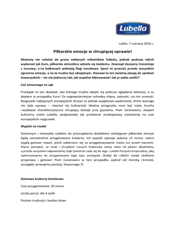 Lublin, 7 czerwca 2016 r. Piłkarskie emocje w chrupiącej oprawie! Możemy nie należeć do grona oddanych miłośników futbolu, jednak podczas takich wydarzeń jak Euro, piłkarska atmosfera udziela się każdemu. Zewsząd słyszymy transmisje z murawy, a na balkonach widnieją flagi narodowe. Sport to przecież przede wszystkim ogromne emocje, a na te trudno być obojętnym. Stanowi to też świetną okazję do spotkań towarzyskich – nic nie jednoczy tak, jak wspólne kibicowanie! Jak je sobie umilić? Coś smacznego na ząb Przekąski to ten dodatek, bez którego trudno obejść się podczas oglądania telewizji, a co dopiero w przypadku Euro! Za najpopularniejsze uchodzą chipsy, paluszki, czy też orzeszki. Rozgrywki najlepszych europejskich drużyn to jednak wyjątkowe wydarzenie, które wymaga nie lada oprawy – również tej kulinarnej! Idealna przegryzka musi być mała, krucha i wydawać charakterystyczny chrupiący dźwięk przy gryzieniu. Piotr Ceranowicz, ekspert kulinarny marki Lubella, podpowiada jak przełamać przekąskową monotonię na czas europejskich rozgrywek. Wypiek na medal Smacznym i niezwykle szybkim do przyrządzenia dodatkiem umilającym piłkarskie emocje będą samodzielnie przygotowane krakersy. Ich wypiek zajmuje jedynie 15 minut, zatem wyjdą gotowe nawet, jeżeli zabierzesz się za przygotowywanie ciasta tuż przed meczem. Warto pamiętać, że smak i chrupkość naszych krakersów zależy także od jakości składników, a przede wszystkim odpowiedniej mąki (świetnie nada się do tego Lubella Puszysta Krupczatka), jaką wykorzystujemy do przygotowania tego typu przekąsek. Dodaj do całości swoje ulubione przyprawy i gotowe! Piotr Ceranowicz w tym przypadku wybrał sól morską i kminek, szczegóły serwujemy poniżej. Smacznego Domowe krakersy kminkowe Czas przygotowania: 20 minut Liczba porcji: dla 4 osób Poziom trudności: bardzo łatwe 300 g mąki Lubella Puszysta Krupczatka 140 g masła Łyżeczka cukru Pół łyżeczki soli 1 jajko 3 łyżki wody Kminek Sól gruboziarnista do posypania Przygotowanie: Wszystkie składniki, z wyjątkiem kminku i soli, łączymy ze sobą i energicznie wyrabiamy formując ciasto. Rozwałkowujemy je i kroimy na kwadraty. Całość przekładamy na blachę, posypujemy solą i kminkiem, lekko wciskamy przyprawy w ciasto. Dzięki specjalnemu procesowi suszenia ziaren użytych do produkcji Mąki Puszystej Krupczatki od Lubelli, krakersy będą wyjątkowo kruche i chrupiące. Przekąski pieczemy przez ok 10 – 15 minut w nagrzanym do 200 stopni piekarniku. *** Piotr Ceranowicz – ekspert kulinarny związany z marką Lubella. Szef kuchni restauracji Kaskrut oraz szef i patron restauracji Kitchen. Uczestnik 3. edycji programu Top Chef. Absolwent Szkoły Głównej Gospodarstwa Wiejskiego na kierunku Medycyny Weterynaryjnej i Psychologii Klinicznej na Wyższej Szkole Psychologii Społecznej w Warszawie. Były główny szkoleniowiec i barista w ZEN City Lounge. W 2012 roku był finalistą ogólnopolskiego konkursu „Kucharz odkrycie roku 2012”. Więcej informacji: Lubella: Dorota Liszka Manager ds. Komunikacji Korporacyjnej e-mail: [email protected] tel.: 33 870 82 04 Biuro prasowe: Ewelina Łukasiak Account Executive e-mail: [email protected] tel.: 22 544 05 15 Lubella to lider na rynku makaronów w Polsce oraz znany producent wyrobów zbożowych m.in.: płatków śniadaniowych, mąk, kasz i paluszków. Produkty Lubelli charakteryzuje wysoka jakość, wyjątkowy smak i pewność efektu od ponad 130 lat. Lubella ciągle rozwija się i czerpie to, co najlepsze z polskiej tradycji oraz wzbogaca ofertę o produkty innowacyjne. Są one niejednokrotnie inspiracją dla eksperymentów w kuchni i zabawy ze smakiem. Marka jest ceniona zarówno przez handlowców, jak i konsumentów. Z Lubellą każdy może być mistrzem kulinarnym.