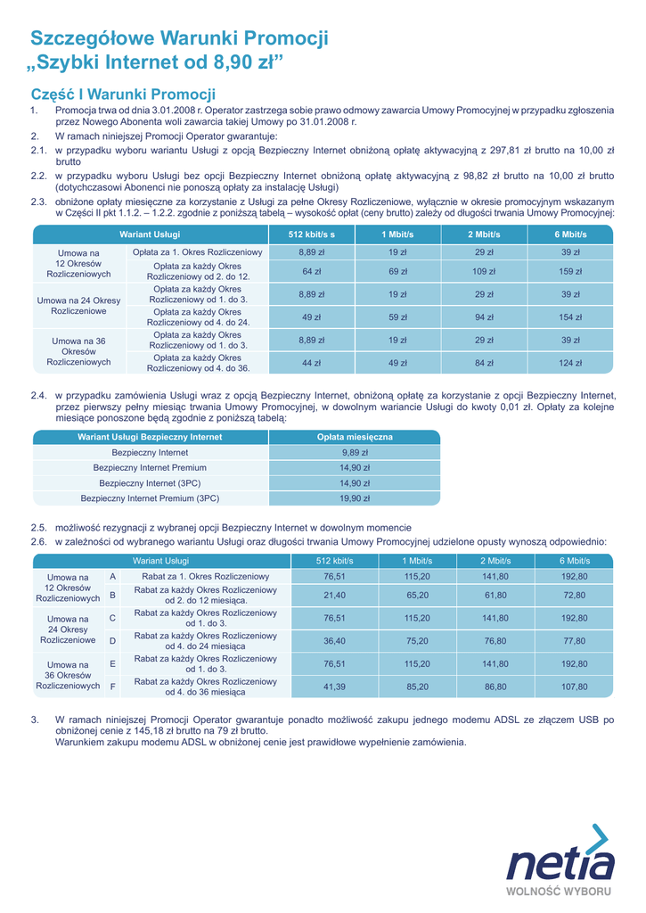 Szczegółowe Warunki Promocji „Szybki Internet od 8,90 zł” Część I Warunki Promocji 1. Promocja trwa od dnia 3.01.2008 r. Operator zastrzega sobie prawo odmowy zawarcia Umowy Promocyjnej w przypadku zgłoszenia przez Nowego Abonenta woli zawarcia takiej Umowy po 31.01.2008 r. 2. W ramach niniejszej Promocji Operator gwarantuje: 2.1. w przypadku wyboru wariantu Usługi z opcją Bezpieczny Internet obniżoną opłatę aktywacyjną z 297,81 zł brutto na 10,00 zł brutto 2.2. w przypadku wyboru Usługi bez opcji Bezpieczny Internet obniżoną opłatę aktywacyjną z 98,82 zł brutto na 10,00 zł brutto (dotychczasowi Abonenci nie ponoszą opłaty za instalację Usługi) 2.3. obniżone opłaty miesięczne za korzystanie z Usługi za pełne Okresy Rozliczeniowe, wyłącznie w okresie promocyjnym wskazanym w Części II pkt 1.1.2. – 1.2.2. zgodnie z poniższą tabelą – wysokość opłat (ceny brutto) zależy od długości trwania Umowy Promocyjnej: Wariant Usługi Opłata za 1. Okres Rozliczeniowy Umowa na 12 Okresów Rozliczeniowych Umowa na 24 Okresy Rozliczeniowe Umowa na 36 Okresów Rozliczeniowych Opłata za każdy Okres Rozliczeniowy od 2. do 12. Opłata za każdy Okres Rozliczeniowy od 1. do 3. Opłata za każdy Okres Rozliczeniowy od 4. do 24. Opłata za każdy Okres Rozliczeniowy od 1. do 3. Opłata za każdy Okres Rozliczeniowy od 4. do 36. 512 kbit/s s 1 Mbit/s 2 Mbit/s 6 Mbit/s 8,89 zł 19 zł 29 zł 39 zł 64 zł 69 zł 109 zł 159 zł 8,89 zł 19 zł 29 zł 39 zł 49 zł 59 zł 94 zł 154 zł 8,89 zł 19 zł 29 zł 39 zł 44 zł 49 zł 84 zł 124 zł 2.4. w przypadku zamówienia Usługi wraz z opcją Bezpieczny Internet, obniżoną opłatę za korzystanie z opcji Bezpieczny Internet, przez pierwszy pełny miesiąc trwania Umowy Promocyjnej, w dowolnym wariancie Usługi do kwoty 0,01 zł. Opłaty za kolejne miesiące ponoszone będą zgodnie z poniższą tabelą: Wariant Usługi Bezpieczny Internet Opłata miesięczna Bezpieczny Internet 9,89 zł Bezpieczny Internet Premium 14,90 zł Bezpieczny Internet (3PC) 14,90 zł Bezpieczny Internet Premium (3PC) 19,90 zł 2.5. możliwość rezygnacji z wybranej opcji Bezpieczny Internet w dowolnym momencie 2.6. w zależności od wybranego wariantu Usługi oraz długości trwania Umowy Promocyjnej udzielone opusty wynoszą odpowiednio: Wariant Usługi Umowa na 12 Okresów Rozliczeniowych A B Umowa na 24 Okresy Rozliczeniowe C Umowa na 36 Okresów Rozliczeniowych E 3. D F Rabat za 1. Okres Rozliczeniowy Rabat za każdy Okres Rozliczeniowy od 2. do 12 miesiąca. Rabat za każdy Okres Rozliczeniowy od 1. do 3. Rabat za każdy Okres Rozliczeniowy od 4. do 24 miesiąca Rabat za każdy Okres Rozliczeniowy od 1. do 3. Rabat za każdy Okres Rozliczeniowy od 4. do 36 miesiąca 512 kbit/s 1 Mbit/s 2 Mbit/s 6 Mbit/s 76,51 115,20 141,80 192,80 21,40 65,20 61,80 72,80 76,51 115,20 141,80 192,80 36,40 75,20 76,80 77,80 76,51 115,20 141,80 192,80 41,39 85,20 86,80 107,80 W ramach niniejszej Promocji Operator gwarantuje ponadto możliwość zakupu jednego modemu ADSL ze złączem USB po obniżonej cenie z 145,18 zł brutto na 79 zł brutto. Warunkiem zakupu modemu ADSL w obniżonej cenie jest prawidłowe wypełnienie zamówienia. Część II Warunki skorzystania z Promocji 1. Z Promocji może skorzystać Abonent, który spełni łącznie wszystkie warunki określone poniżej: 1.1. w przypadku aktywacji Usługi na łączu Operatora: 1.1.1. korzysta z Linii telefonicznej w lokalizacji, w której świadczona będzie Usługa lub łącznie z Umową Promocyjną zawiera z Operatorem Umowę o świadczenie usługi Linia telefoniczna 1.1.2. zawrze z Operatorem Umowę Promocyjną na czas określony 12, 24 lub 36 pełnych Okresów Rozliczeniowych 1.1.3. obecny Abonent może przedłużyć aktualnie obowiązującą Umowę terminową na warunkach niniejszej Promocji, jeżeli spełni warunki opisane w pkt 1.1.1. powyżej, a do wygaśnięcia obowiązującej Umowy terminowej pozostało nie więcej niż 90 dni 1.2. w przypadku aktywacji Usługi na łączu Telekomunikacji Polskiej SA lub innego operatora korzystającego z infrastruktury technicznej Telekomunikacji Polskiej SA: 1.2.1. korzysta z Linii telefonicznej w lokalizacji, w której świadczona będzie Usługa 1.2.2. zawrze z Operatorem Umowę Promocyjną na czas określony 12, 24 lub 36 pełnych Okresów Rozliczeniowych 1.2.3. wraz z zawartą Umową Promocyjną przekaże Operatorowi, zgodny ze wzorem Operatora, prawidłowo wypełniony i podpisany oryginał zgody na świadczenie Usługi w oparciu o wykorzystywane łącze Telekomunikacji Polskiej SA lub innego operatora („Oświadczenie o wyrażeniu zgody na świadczenie Usługi”) 1.2.4. obecny Abonent może przedłużyć aktualnie obowiązującą Umowę terminową na warunkach niniejszej Promocji, jeżeli spełni warunki opisane w pkt 1.2.1. powyżej, a do wygaśnięcia obowiązującej Umowy terminowej pozostało nie więcej niż 90 dni. 2. Brak spełnienia któregokolwiek z podanych powyżej warunków uniemożliwia zawarcie Umowy Promocyjnej, a jeśli Umowę Promocyjną zawarto, powoduje jej wygaśnięcie. Z powyższego tytułu użytkownikowi nie przysługuje jakiekolwiek roszczenie. 3. Brak możliwości technicznych Operatora do świadczenia Usługi we wskazanej lokalizacji, w wybranym przez Abonenta wariancie również uniemożliwia zawarcie Umowy Promocyjnej, a jeśli Umowę Promocyjną zawarto, powoduje jej wygaśnięcie. Z powyższego tytułu użytkownikowi nie przysługuje jakiekolwiek roszczenie. Część III Definicje 1. Niniejszy dokument określa warunki i zasady korzystania przez użytkowników z promocji „Szybki Internet od 8,90 zł” (zwanej „Promocją”). Operator świadczy usługi objęte Promocją na warunkach określonych w Regulaminie Świadczenia Usług przez Spółki Grupy Netia (zwanym „Regulaminem”), z uwzględnieniem zasad określonych niniejszym dokumentem. 2. Użyte w treści dokumentu terminy oznaczają: 2.1. Operator