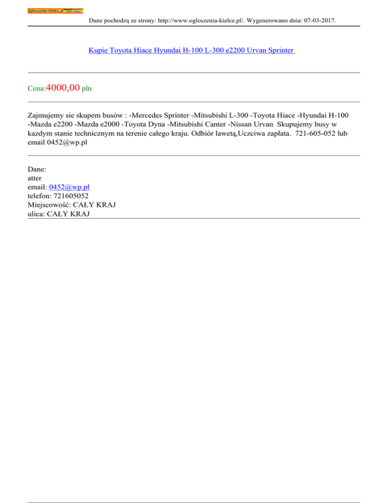 Dane pochodzą ze strony: http://www.ogloszenia-kielce.pl/. Wygenerowano dnia: 07-03-2017. Kupie Toyota Hiace Hyundai H-100 L-300 e2200 Urvan Sprinter Cena:4000,00 pln Zajmujemy sie skupem busów : -Mercedes Sprinter -Mitsubishi L-300 -Toyota Hiace -Hyundai H-100 -Mazda e2200 -Mazda e2000 -Toyota Dyna -Mitsubishi Canter -Nissan Urvan Skupujemy busy w kazdym stanie technicznym na terenie całego kraju. Odbiór lawetą,Uczciwa zapłata. 721-605-052 lub email [email protected] Dane: atter email: [email protected] telefon: 721605052 Miejscowość: CAŁY KRAJ ulica: CAŁY KRAJ