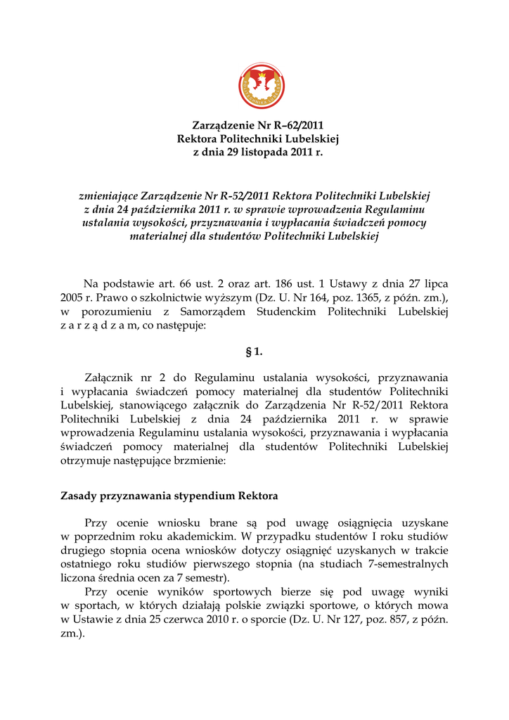 Zarządzenie Nr R–62/2011 Rektora Politechniki Lubelskiej z dnia 29 listopada 2011 r. zmieniające Zarządzenie Nr R-52/2011 Rektora Politechniki Lubelskiej z dnia 24 października 2011 r. w sprawie wprowadzenia Regulaminu ustalania wysokości, przyznawania i wypłacania świadczeń pomocy materialnej dla studentów Politechniki Lubelskiej Na podstawie art. 66 ust. 2 oraz art. 186 ust. 1 Ustawy z dnia 27 lipca 2005 r. Prawo o szkolnictwie wyższym (Dz. U. Nr 164, poz. 1365, z późn. zm.), w porozumieniu z Samorządem Studenckim Politechniki Lubelskiej z a r z ą d z a m, co następuje: § 1. Załącznik nr 2 do Regulaminu ustalania wysokości, przyznawania i wypłacania świadczeń pomocy materialnej dla studentów Politechniki Lubelskiej, stanowiącego załącznik do Zarządzenia Nr R-52/2011 Rektora Politechniki Lubelskiej z dnia 24 października 2011 r. w sprawie wprowadzenia Regulaminu ustalania wysokości, przyznawania i wypłacania świadczeń pomocy materialnej dla studentów Politechniki Lubelskiej otrzymuje następujące brzmienie: Zasady przyznawania stypendium Rektora Przy ocenie wniosku brane są pod uwagę osiągnięcia uzyskane w poprzednim roku akademickim. W przypadku studentów I roku studiów drugiego stopnia ocena wniosków dotyczy osiągnięć uzyskanych w trakcie ostatniego roku studiów pierwszego stopnia (na studiach 7-semestralnych liczona średnia ocen za 7 semestr). Przy ocenie wyników sportowych bierze się pod uwagę wyniki w sportach, w których działają polskie związki sportowe, o których mowa w Ustawie z dnia 25 czerwca 2010 r. o sporcie (Dz. U. Nr 127, poz. 857, z późn. zm.). Wnioski są oceniane metodą punktową. Za wysoką średnią ocen, za osiągnięcia naukowe, artystyczne lub wysoki wynik sportowy przyznawana jest określona liczba punktów (według poniższych tabel). Za wysoką średnią ocen rozumie się średnią ważoną, nie mniejszą niż 4,0. Stypendium Rektora otrzymują studenci najwyżej ulokowani w wyżej wymienionym rankingu. Liczbę studentów uprawnionych do otrzymania stypendium Rektora ustala się w oparciu o dane o studentach danego kierunku studiów na dzień 30 czerwca 2011 r. Jeżeli na liście rankingowej znajdują się osoby o tej samej liczbie punktów, to osoba, która zdobyła punkty z tytułu wysokiej średniej ocen jest na liście rankingowej przed osobą, która zdobyła te punkty w ramach innej kategorii. Jeżeli na liście rankingowej znajdują się osoby o tej samej liczbie punktów i tej samej średniej do listy rankingowej dopisujemy wszystkie osoby o jednakowej punktacji i średniej, pod warunkiem, że całkowita liczba osób otrzymujących stypendium Rektora nie przekracza 10%. Jeżeli student ma osiągnięcia o charakterze społecznym, a nie uzyskał średniej 4,0 nie są one punktowane. Za rok akademicki, w którym jeden z semestrów nauki był zaliczony warunkowo, stypendium nie przysługuje. Wykazy studentów, którzy otrzymali stypendium Rektora dla najlepszych studentów wywieszone zostaną na tablicy ogłoszeń w Dziale Spraw Studenckich Politechniki Lubelskiej. Wartości punktowe za osiągnięcia naukowe, artystyczne, sportowe: 1. Średnia ocen: Średnia <2,4) <4,0 – 4,25) <4,25 – 4,5) <4,5 – 4,75) <4,75 – 5,0) 5 Punkty 0 2 4 6 8 10 2. Osiągnięcia naukowe: Osiągnięcia Punkty* Wygłoszenie referatu na konferencji naukowej o zasięgu: − lokalnym − ogólnopolskim 1 2 Publikacja artykułu naukowego w czasopiśmie punktowanym 2 Współpraca ze studenckimi organizacjami naukowymi lub kołami naukowymi działającymi w innych ośrodkach akademickich 2 Publikacja artykułu naukowego w czasopiśmie, książce lub zeszycie naukowym 1 Udział w olimpiadach przedmiotowych o zasięgu ogólnopolskim 1 Pełniona funkcja w kole naukowym 1 Studia wg indywidualnego planu studiów i programu nauczania lub studia równoległe na drugim kierunku studiów 1 3. Osiągnięcia artystyczne: Osiągnięcia Punkty* Praca w organizacjach studenckich o zasięgu: − uczelnianym − ogólnopolskim − międzynarodowym 1 3 4 Udział w konkursach, festiwalach artystycznych oraz działalność kulturalna o zasięgu: − uczelnianym − ogólnopolskim − międzynarodowym 1 3 4 Działalność w wolontariacie 2 4. Osiągnięcia sportowe: Osiągnięcia Kategoria: − I stopnia − II stopnia − III stopnia − IV stopnia Punkty* 10 6 4 2 *) punktów nie sumuje się Stypendium Rektora za osiągnięcia sportowe może otrzymać student, który osiągnął wysokie wyniki w sporcie we współzawodnictwie międzynarodowym lub krajowym. Student może otrzymać stypendium Rektora w następujących przypadkach: 1) osiągnięcia I stopnia: a) posiada status członka kadry narodowej, b) zajęcie medalowego miejsca w zawodach międzynarodowych, c) zajęcie medalowego miejsca na Uniwersjadzie, d) przysługuje studentowi uczestniczącemu w I lidze państwowej; 2) osiągnięcia II stopnia: a) zajęcie medalowego miejsca w zawodach krajowych (Mistrzostwa Polski, Akademickie Mistrzostwa Polski, Puchar Polski, Mistrzostwa Polski Politechnik), b) zajęcie miejsc od 4 do 6 w zawodach międzynarodowych, c) zajęcie miejsc od 4 do 6 na Uniwersjadzie, d) przysługuje studentowi uczestniczącemu w II lidze państwowej; 3) osiągnięcia III stopnia: a) zajęcie miejsc od 4 do 6 w zawodach krajowych (Mistrzostwa Polski, Akademickie Mistrzostwa Polski, Puchar Polski, Mistrzostwa Polski Politechnik), b) finaliści Akademickich Mistrzostw Polski (po eliminacji regionalnej i strefowej w dyscyplinach zespołowych), c) przysługuje studentowi uczestniczącemu w III lidze państwowej; 4) osiągnięcia IV stopnia: a) zajęcie miejsc od 5 do 8 w rozgrywkach strefowych Akademickich Mistrzostw Polski (po eliminacji regionalnej). § 2. Pozostałe postanowienia Zarządzenia Nr R-52/2011 Rektora Politechniki Lubelskiej z dnia 24 października 2011 r. w sprawie wprowadzenia Regulaminu ustalania wysokości, przyznawania i wypłacania świadczeń pomocy mater