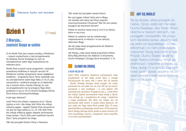 Tchnienie Ducha nad miastem Dzień 1 Taki może być początek naszej historii. Bo czyż agape, miłość, która jest w Bogu, nie została nam dana, jak Maryi, poprzez zmartwychwstanie Chrystusa? Tak! Do nas należy przyjęcie jej otwartym sercem! [17 maja] Z Maryją… znaleźć Boga w sobie O ile Wielki Post jest czasem prośby, a Wielkanoc – czasem wysłuchania, o tyle przygotowanie do Zesłania Ducha Świętego to czas na uświadomienie sobie tego wysłuchania we własnym życiu. Wielki Post oczyścił nasze pragnienia i rozbudził prawdziwą modlitwę w naszych sercach. W Wielkanoc została wysłuchana nasza najgłębsza modlitwa – pragnienia Życia. Teraz nadszedł czas na uświadomienie sobie tego faktu (J 14,17), aby rzeczywiście i osobiście przyjąć to, co dokonało się w naszym życiu. Inaczej mówiąc, to czas na przygotowanie się na przyjęcie Tego, który przebywa w nas (J 14,17), Ducha Świętego, Ducha Życia Jezusa Zmartwychwstałego. A jak tego dokonać? «Jeśli Mnie kto miłuje», rozpozna, że Ja i Ojciec żyjemy w nim i dla niego. Jeśli Mnie kto miłuje miłością agape… Agape? Nawet Piotr przyznał, że nie jest do tego zdolny (J 21, 15-19)! Jeśli Mnie kto miłuje miłością agape, «będzie zachowywał moją naukę» i Duch, który jest wspólnym życiem Ojca i Syna, przyjdzie do niego. Taki był początek historii Maryi z Nazaretu. Miłość ta otwiera nasze oczy (J 14,17) na Słowo, które w nas trwa. Miłość ta uzdalnia nas do codziennego rozpoznawania, w mieście i w nas samych, obecności Boga. Jak się mają nasze przygotowania do Zesłania Ducha Świętego? Jak Maryja, „całą naszą istotą przyjmijmy miłość, którą Bóg pierwszy nas obdarza” a otrzymamy Ducha Świętego! („Księga Życia Jeruzalem”, 1-3) JJ Słowo na drogę J 14,15-18.23-26 Jeżeli Mnie miłujecie, będziecie zachowywać moje przykazania. Ja zaś będę prosił Ojca, a innego Pocieszyciela da wam, aby z wami był na zawsze - Ducha Prawdy, którego świat przyjąć nie może, ponieważ Go nie widzi ani nie zna. Ale wy Go znacie, ponieważ u was przebywa i w was będzie. Nie zostawię was sierotami: Przyjdę do was. […] Jeśli Mnie kto miłuje, będzie zachowywał moją naukę, a Ojciec mój umiłuje go, i przyjdziemy do niego, i będziemy u niego przebywać. Kto Mnie nie miłuje, ten nie zachowuje słów moich. A nauka, którą słyszycie, nie jest moja, ale Tego, który Mnie posłał, Ojca. To wam powiedziałem przebywając wśród was. A Pocieszyciel, Duch Święty, którego Ojciec pośle w moim imieniu, On was wszystkiego nauczy i przypomni wam wszystko, co Ja wam powiedziałem. JJ Aby się modlić Na tej drodze, która prowadzi do Ciebie, Ojcze, ześlij nam Twojego Ducha Świętego, aby Twoje Słowo, obecne w naszych sercach, nas pociągało i prowadziło. Na progu tych rekolekcji spraw, abyśmy stali się wolni od wszystkiego, co nas zatrzymuje i co nam przeszkadza rozpoznać Twoją obecność w nas. Przyjdź, Duchu Święty, abyśmy, dzięki Twemu tchnieniu, mogli się zjednoczyć i wspólnie podążać za Tobą, służąc Ci w pokoju. Daj nam nowe życie i spraw, abyśmy na co dzień promieniowali radością bycia dziećmi Bożymi. Tchnienie Ducha nad miastem Na jaką radość nas przygotowuje? Ku komu kieruje naszą miłość? Dzień 2 [18 maja] Z Maryją… radować się Bądźmy uważni. Dokona się w nas pewna przemiana… Bóg w nas mieszka. Teraz chce w nas zatańczyć. Tańczyć w nas, aby wywołać uśmiech w naszym „dziś”. Weselmy się z całego serca, bo przyjmujemy wspaniałego gościa: Ducha Świętego. To Duch Święty się przygotowuje, to Duch Święty nas przygotowuje. Na Jego tchnienie napinają się żagle naszych serc: ożywczy pokój, unosząca nas radość, misyjne ożywienie. Jesteśmy zamieszkani, jak Maryja przez Słowo. Jesteśmy też posłani, aby nieść Dobrą Nowinę kiełkującą już w naszych duszach. Kiełkuje ona w nas, aby, przez nas, przynieść owoce błogosławieństwa całemu światu. Bądźmy uważni, bo to kiełkowanie jest niepozorne, delikatne – wzrost wewnętrzny utkany z czystej łagodności. Obecność na sekretną Obecność. Uważne słuchanie wewnętrznego Słowa. Trzeba nam dopasować nasze kroki do tego tańca Ducha Świętego w naszych sercach. O co prosi nas Duch? Przyjdź, Duchu, nas oświecić. Przyjdź, Duchu, nas pouczyć. Przyjdź, Duchu-darze. Przyjdź, Duchu Jezusa Zmartwychwstałego. Przyjdź i zatańcz w nas. A wtedy, w sercu świata, w którym nas umieściłeś, będziemy obwieszczać Twoją radość, będziemy misjonarzami tej zaraźliwej radości, Twojej leczącej wszystkie bóle dobroci. JJ Słowo na drogę So 3,14-18a Wyśpiewuj, Córo Syjońska! Podnieś radosny okrzyk, Izraelu! Ciesz się i wesel z całego serca, Córo Jeruzalem! Oddalił Pan wyroki na ciebie, usunął twego nieprzyjaciela: król Izraela, Pan, jest pośród ciebie, nie będziesz już bała się złego. Owego dnia powiedzą Jerozolimie: «Nie bój się, Syjonie! Niech nie słabną twe ręce!» Pan, twój Bóg jest pośród ciebie, Mocarz - On zbawi, uniesie się weselem nad tobą, odnowi swą miłość, wzniesie okrzyk radości, jak w dniu uroczystego święta. JJ Aby się modlić Dziękujemy Ci, Panie, za Ducha Świętego, który aż kipi w nas miłością i radością. Tak, Duchu Święty, Ty żyjesz w naszych sercach! Dajesz nam udział w Twojej miłości, pozwalasz nam zachwycić się jej ogromem. Uwielbiamy Cię! Bez Ciebie ogarnia nas smutek, pustka, nicość i śmierć. Duchu Święty, obedrzyj nas z nas samych, wyzwól nas z naszych codziennych śmierci, wyrwij z naszych serc naszą samowystarczalność, przepędź nasze ciemności, aby nasze serca przepełniła światłość, a nasze dusze odnalazły prawdziwą radość, radość doświadczania Twojej miłości. Tchnienie Ducha nad miastem Dzień 3 nasze serca pragną tej wody (Ps 42,2). „O, gdybyś znała dar Boży! (…) Prosiłabyś Go wówczas, a 