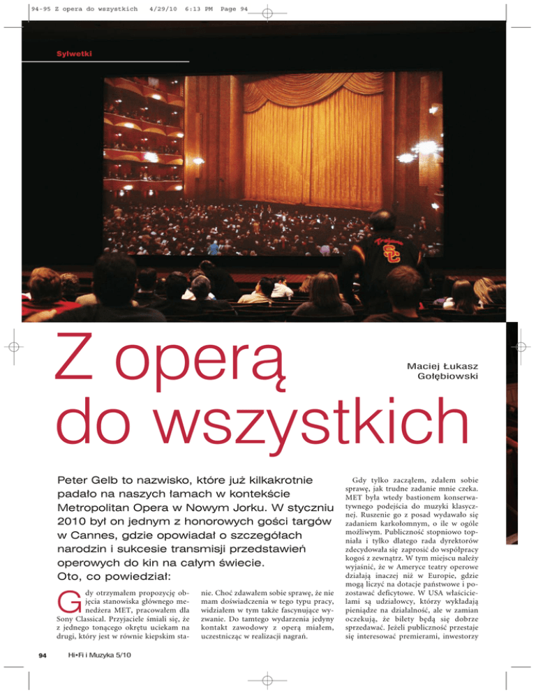 94-95 Z opera do wszystkich 4/29/10 6:13 PM Page 94 Sylwetki Z operà do wszystkich Maciej ¸ukasz Go∏´biowski Peter Gelb to nazwisko, które ju˝ kilkakrotnie pada∏o na naszych ∏amach w kontekÊcie Metropolitan Opera w Nowym Jorku. W styczniu 2010 by∏ on jednym z honorowych goÊci targów w Cannes, gdzie opowiada∏ o szczegó∏ach narodzin i sukcesie transmisji przedstawieƒ operowych do kin na ca∏ym Êwiecie. Oto, co powiedzia∏: G dy otrzyma∏em propozycj´ obj´cia stanowiska g∏ównego mened˝era MET, pracowa∏em dla Sony Classical. Przyjaciele Êmiali si´, ˝e z jednego tonàcego okr´tu uciekam na drugi, który jest w równie kiepskim sta94 Hi•Fi i Muzyka 5/10 nie. Choç zdawa∏em sobie spraw´, ˝e nie mam doÊwiadczenia w tego typu pracy, widzia∏em w tym tak˝e fascynujàce wyzwanie. Do tamtego wydarzenia jedyny kontakt zawodowy z operà mia∏em, uczestniczàc w realizacji nagraƒ. Gdy tylko zaczà∏em, zda∏em sobie spraw´, jak trudne zadanie mnie czeka. MET by∏a wtedy bastionem konserwatywnego podejÊcia do muzyki klasycznej. Ruszenie go z posad wydawa∏o si´ zadaniem karko∏omnym, o ile w ogóle mo˝liwym. PublicznoÊç stopniowo topnia∏a i tylko dlatego rada dyrektorów zdecydowa∏a si´ zaprosiç do wspó∏pracy kogoÊ z zewnàtrz. W tym miejscu nale˝y wyjaÊniç, ˝e w Ameryce teatry operowe dzia∏ajà inaczej ni˝ w Europie, gdzie mogà liczyç na dotacje paƒstwowe i pozostawaç deficytowe. W USA w∏aÊcicielami sà udzia∏owcy, którzy wyk∏adajà pieniàdze na dzia∏alnoÊç, ale w zamian oczekujà, ˝e bilety b´dà si´ dobrze sprzedawaç. Je˝eli publicznoÊç przestaje si´ interesowaç premierami, inwestorzy 94-95 Z opera do wszystkich 4/29/10 6:13 PM Page 95 Sylwetki si´ wycofujà i nie trzeba d∏ugo czekaç na bankructwo. Moim podstawowym celem sta∏o si´ rozbudzenie na nowo zainteresowania ludzi dzia∏alnoÊcià teatru. Postanowi∏em zrobiç to poprzez zaproszenie nowych re˝yserów i producentów, którzy mieli Êwie˝e pomys∏y na inscenizacj´ oper. Podwoi∏em liczb´ premier do 3-4 w sezonie i zaczà∏em korzystaç z nowoczesnych metod dotarcia do publicznoÊci poprzez media. Nie wszystkie pomys∏y zyska∏y aprobat´, ale nie ma w tej bran˝y decyzji, które wszyscy przyj´liby z entuzjazmem. Sztukà jest manewrowaç na tyle skutecznie, by z jednej strony przyciàgaç nowà publicznoÊç, a z drugiej – zatrzymywaç starà. Modelem, który warto zastosowaç w przypadku opery, jest ten, który od dawna funkcjonuje w relacjach mi´dzy fanami sportu i ich idolami wyst´pujàcymi na stadionach. Tak w sporcie, jak i w operze mamy do czynienia z wielbicielami gwiazd. Sà gotowi wiele poÊwi´ciç, by dostaç si´ na przedstawienie z udzia∏em ukochanego zawod- nika, w tym przypadku – tenora czy sopranu. W∏aÊnie dlatego transmisje przedstawieƒ do kin okaza∏y si´ takim sukcesem. Dzisiejsze gwiazdy funkcjonujà przecie˝ na ca∏ym Êwiecie i meloman z Bombaju, Moskwy, Johannesburga czy Aten, nawet kiedy nie mo˝e sobie pozwoliç na wyjazd do Nowego Jorku, ch´tnie kupi bilet na takà transmisj´ i b´dzie kibicowa∏ swemu ulubieƒcowi Êpiewajàcemu górne „c” w którejÊ ze s∏ynnych arii. Idea przedstawieƒ dla szerokiej publicznoÊci ma w MET d∏ugà tradycj´. Zacz´∏o si´ od transmisji radiowych, które realizuje si´ do dziÊ. Uzna∏em, ˝e przynajmniej cz´Êç radiowej publicznoÊci zechce wy∏àczyç odbiorniki i pójÊç do kina, by nie tylko s∏uchaç, ale i oglàdaç wyst´py. Eksperyment rozpocz´liÊmy w 2007 roku, ale nie oby∏o si´ bez przeszkód. Samo dogadanie si´ z 16 zwiàzkami zawodowymi dzia∏ajàcymi w teatrze stanowi∏o niema∏y sukces. Negocjacje trwa∏y rok. Rozpocz´liÊmy przedsi´wzi´cie transmisjami do 60 kin. DziÊ mamy podpisane umowy z ponad 1000. Tu tak˝e, podobnie jak w pokazywaniu meczy sportowych, nie ograniczamy si´ do jednej czy dwóch kamer, skierowanych tylko na scen´ i g∏ówne postacie. Wchodzimy za kulisy, gdzie w czasie przerwy pokazujemy artystów i techników i z niektórymi rozmawiamy. Staramy si´, by widz przez ca∏y czas by∏ czymÊ zaj´ty i nigdy si´ nie nudzi∏. Kamery pracujà non stop, od pierwszego dêwi´ku uwertury do ostatniej sekundy owacji po przedstawieniu. To wszystko sprawia, ˝e niedawne przedstawienie „Carmen” obejrza∏o 330 tysi´cy osób na ca∏ym Êwiecie. Oko∏o 10% z nich to odbiorcy, którzy nigdy wczeÊniej nie byli w operze, ale taka forma przekazu ich zainteresowa∏a i przyciàgn´∏a. OczywiÊcie podobne projekty muszà kosztowaç. Nasz roczny bud˝et to 290 mln dolarów, z czego oko∏o 30 wydajemy na dzia∏alnoÊç multimedialnà. Wp∏ywy z biletów sà jednak na tyle du˝e, ˝e wk∏ad finansowy zwraca si´ z nawiàzkà. Obecnie oko∏o po∏owa naszych wp∏ywów z biletów pochodzi w∏aÊnie z transmisji. Wype∏nienie sal si´ga obecnie 90 %, a liczba kin systematycznie roÊnie. Ciekawym i cennym efektem tego kinowego projektu jest te˝ wzrost zainteresowania naszym teatrem wÊród obiecujàcych m∏odych Êpiewaków. W dzisiejszych czasach Êwiat klasyki mo˝e m∏odemu cz∏owiekowi zaoferowaç zwykle znacznie mniej ni˝ popkultura. Pojawia si´ pytanie, jak ich przekonaç, by spróbowali rozwijaç swoje talenty w operze. Istotnym elementem motywujàcym mo˝e si´ okazaç popularnoÊç. ÂwiadomoÊç, ˝e na ca∏ym Êwiecie w tej samej chwili spektakl oglàda kilkaset tysi´cy ludzi, jest fascynujàca dla ka˝dego artysty. To przecie˝ wi´cej ni˝ jakikolwiek stadion. ≤ Hi•Fi i Muzyka 5/10 95