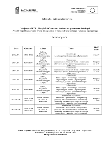 Człowiek – najlepsza inwestycja Inicjatywa WZZ „Sierpień 80” na rzecz budowania partnerstw lokalnych Projekt współfinansowany z Unii Europejskiej w ramach Europejskiego Funduszu Społecznego Harmonogram Data 29.03.2011 Godzina 14:00-20:00 04.04.2011 8:00-16:00 05.04.2011 8:00-16:00 Adres Zabrze, Hagera 41 sala konferencyjna, II piętro Zabrze, Hagera 41 sala konferencyjna, II piętro Zabrze, Hagera 41 sala konferencyjna, II piętro 8:00-16:00 Zabrze, Hagera 41 sala konferencyjna, II piętro 10.04.2011 8:00-16:00 Zabrze, Hagera 41 sala konferencyjna, II piętro 16-17.04.2011 10:00-16:00, 10:00-16:00 Ośrodek „Harnaś”, ul. Leśna 1, Korbielów 16-17.04.2011 10:00-16:00, 10:00-16:00 Ośrodek „Harnaś”, ul. Leśna 1, Korbielów 09.04.2011 Temat Ilość osób Konferencja: Lokalne partnerstwa na rzecz adaptacyjności Min. 50 Seminarium: Idea uczenia się przez całe życie – promowanie aktywnych postaw, poprawiających szanse na rynku pracy Seminarium: Idea uczenia się przez całe życie – promowanie aktywnych postaw, poprawiających szanse na rynku pracy Seminarium: Praca – życie – równowaga. Możliwości organizacyjne, prawne i psychologiczne ułatwiające godzenie życia zawodowego i prywatnego. Seminarium: Praca – życie – równowaga. Możliwości organizacyjne, prawne i psychologiczne ułatwiające godzenie życia zawodowego i prywatnego. Seminarium wyjazdowe: Pracownik – pracodawca – relacje nowej generacji. Skuteczne narzędzia komunikacji i mentoring zawodowy jako droga do rozwoju zawodowego i poprawy życia prywatnego. Seminarium wyjazdowe: Pracownik – pracodawca – relacje nowej generacji. Skuteczne narzędzia komunikacji i mentoring zawodowy jako droga do rozwoju zawodowego i poprawy życia prywatnego. Biuro Projektu: Siedziba Komisji Zakładowej WZZ „Sierpień 80” przy KWK „Wujek-Śląsk” Katowice, ul. Wincentego Pola 65, tel. 505-467-572 www.partnerstwolokalne.eu Grupa I: 25 osób Grupa II: 25 osób Grupa I: 25 osób Grupa II: 25 osób Grupa I: 25 osób Grupa II: 25 osób TEMATY I ZAKRESY ZAJĘĆ KONFERENCJA Tytuł: „Lokalne partnerstwa na rzecz adaptacyjności” Zakres tematyczny: Omówienie problematyki równości szans kobiet i mężczyzn, a także przybliżenie elastycznych form zatrudnienia w aspekcie godzenia życia zawodowego i prywatnego, odpowiedzialności społecznej przedsiębiorstw, nietypowych form zatrudnienia oraz organizacji pracy. SEMINARIUM JEDNODNIOWE Tytuł: „Idea uczenia się – promowanie aktywnych postaw zwiększających szansę na rynku pracy ” Zakres tematyczny: Program Operacyjny Kapitał Ludzki na lata 2007-2013, podnoszenie kwalifikacji zawodowych osób bezrobotnych, podnoszenie kwalifikacji zawodowych osób pracujących z własnej inicjatywy, podnoszenie kwalifikacji zawodowych osób pracujących delegowanych przez pracodawcę, projekty edukacyjno-doradcze wspierające rozwój przedsiębiorczości, możliwość podnoszenia kwalifikacji zawodowych z wykorzystaniem metod elearningu na przykładzie Akademii PARP. Tytuł: „Praca – życie – równowaga. Możliwości organizacyjne, prawne i psychologiczne ułatwiające godzenie życia zawodowego i prywatnego”. Zakres tematyczny: uczestnicy seminarium będą mieli możliwość zapoznania się z następującymi zagadnieniami: rozwiązania ułatwiające godzenie pracy z życiem prywatnym – elastyczne formy pracy przyjazne rodzinie, elastyczność a polski rynek pracy, elastyczne formy zatrudnienia w perspektywie polskiego prawa pracy, rola reprezentacji pracowniczych w realizacji działań na rzecz równowagi praca – życie, szanse i zagrożenia ze strony elastycznych form zatrudniania i organizowania pracy, związki zawodowe wobec elastycznych form zatrudnienia, organizacje pracodawców wobec elastycznych form zatrudnienia, kobiety i mężczyźni na rynku pracy a elastyczne formy zatrudnienia, narzędzia godzenia życia zawodowego i rodzinnego, psychospołeczne czynniki warunkujące pełnienie ról zawodowych i rodzinnych. SEMINARIUM WYJAZDOWE (DWUDNIOWE) Tytuł: „Pracownik – pracodawca – relacje nowej generacji. Skuteczne narzędzia komunikacji i mentoring zawodowy jako droga do rozwoju zawodowego i poprawy życia prywatnego” Zakres seminarium: uczestnicy seminarium będą mieli możliwość zapoznania się z następującymi zagadnieniami: budowanie wiarygodnego wizerunku pracownika i pracodawcy, narzędzia wspierające skuteczną komunikację na linii pracownik – pracodawca i pracodawca – pracownik, rozpoznawanie styli komunikowania się i skutecznie komunikowanie się z osobami reprezentującymi inne style komunikacji, stosowanie techniki skutecznego komunikowania się, aby zrealizować cele zawodowe i prywatne, prowadzenie rozmów z pracodawcą, prowadzenie rozmów Biuro Projektu: Siedziba Komisji Zakładowej WZZ „Sierpień 80” przy KWK „Wujek-Śląsk” Katowice, ul. Wincentego Pola 65, tel. 505-467-572 www.partnerstwolokalne.eu z pracownikiem, likwidowanie lub niwelowanie barier komunikacyjnych, sztuka aktywnego słuchania, mowa ciała i parajęzyk, strategie budowania skutecznej komunikacji interpersonalnej, mentoring jako partnerstwo w rozwoju osobistym i zawodowym, relacja mentorska czyli układ „jeden na jeden” mentora i mentee, pracownik pracodawca - partnerska relacja zorientowana na odkrywanie i rozwijanie potencjału, jak udzielać inspiracji i stymulować innych – zasady mentorskiej pomocy w strategicznym rozwoju kariery i dążeniu do sukcesu. WARSZTATY Tytuł: „Kreacja wizerunku i współpraca z mediami jako skuteczne narzędzia pracy Lidera Dialogu Społecznego ” Zakres warsztatów: rola Lidera Dialogu Społecznego, zasady profesjonalnego kształtowania wizerunku medialnego, perswazja w komunikacji jako umiejętność koniczna w kontaktach z mediami, komunikacja niewerbalna, werbalna i wokalna Lidera Dialogi Społecznego - gesty i znaki, sposób i styl ubierania się, język ciała i wyraz twarzy, 