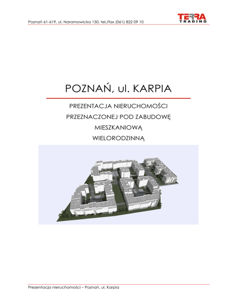 Poznań 61-619, ul. Naramowicka 150, tel./fax (061) 822 09 10 POZNAŃ, ul. KARPIA PREZENTACJA NIERUCHOMOŚCI PRZEZNACZONEJ POD ZABUDOWĘ MIESZKANIOWĄ WIELORODZINNĄ 诲诲 眉 看 看 Prezentacja nieruchomości – Poznań, ul. Karpia Poznań 61-619, ul. Naramowicka 150, tel./fax (061) 822 09 10 POŁOŻENIE NIERUCHOMOŚCI Prezentowana nieruchomość zlokalizowana jest w Poznaniu, przy ulicy Karpiej, w rejonie Naramowic, w północnej części miasta: – lokalizacja prezentowanej nieruchomości Teren zlokalizowany jest w niewielkiej odległości od ścisłego centrum miasta, z dogodnym połączeniem komunikacyjnym, w niedalekiej odległości od rzeki Warty. Przedmiotowa nieruchomość położona jest przy nieprzelotowej ulicy, co daje gwarancję ciszy i spokoju. Naramowice to niezwykle prężnie rozwijający się rejon miasta, z rozwiniętą infrastrukturą, punktami handlowo – usługowymi, szkołami i miejscami użyteczności przeważającej publicznej. większości nowa Najbliższe lub wielorodzinna oraz szeregowa. Prezentacja nieruchomości – Poznań, ul. Karpia sąsiedztwo kilkuletnia działek zabudowa stanowi w mieszkaniowa Poznań 61-619, ul. Naramowicka 150, tel./fax (061) 822 09 10 OPIS NIERUCHOMOŚCI Przedmiotowa nieruchomość składa się z siedmiu działek, o łącznej powierzchni 25.502m2. Działki stanowią łącznie zwartą nieruchomość o regularnym kształcie – wyjątkowo atrakcyjnym pod względem możliwości inwestycyjnych. Dodatkowym atutem jest niezwykle korzystne, płaskie ukształtowanie terenu. Zestawienie działek: Działka nr 510 KW: PO1P/00129471/6 Pow: 4.357 m2 Działka nr 29/19 KW: PO1P/00137902/6 Pow: 4.004 m2 Działka nr 29/17 KW: PO1P/00137902/6 Pow: 1.021 m2 Działka nr 29/20 KW: PO1P/00137697/5 Pow: 4.027 m2 Działka nr 29/18 KW: PO1P/00137902/6 Pow: 4.052 m2 Działka nr 29/21 KW: PO1P/00137697/5 Pow: 4.045 m2 Prezentacja nieruchomości – Poznań, ul. Karpia Działka nr 29/22 KW: PO1P/00137697/5 Pow: 3.996 m2 Poznań 61-619, ul. Naramowicka 150, tel./fax (061) 822 09 10 PROJEKT ZAGOSPODAROWANIA TERENU Dnia 14 sierpnia została dla przedmiotowej nieruchomości wydana decyzja o warunkach zabudowy dla zespołu budynków wielomieszkaniowych, zaś dnia 19 marca 2008 roku – decyzja o udzieleniu pozwolenia na budowę budynku nr 1 (schemat budynków w dalszej części prezentacji). Projektowane osiedle stanowić będzie zespół pięciu budynków wielomieszkaniowych o wysokości od pięciu do sześciu kondygnacji nadziemnych, z trzema wydzielonymi kondygnacji garażami podziemnej. dla samochodów Projektowane budynki osobowych zajmą, w według poziomie koncepcji architektonicznej, 8.602m2, natomiast całkowita powierzchnia budynków wyniesie 45.379m2. Powierzchnia użytkowa mieszkań kształtuje się na poziomie około 29.269m2, a więc powierzchnia mieszkalna stanowić będzie około 65% całkowitej powierzchni budynków. W zespole mieszkaniowym przewidziano 545 mieszkań oraz 555 miejsc postojowych, zlokalizowanych w garażach podziemnych. Najbliższe sąsiedztwo przedmiotowej nieruchomości stanowi nieruchomość będąca przedmiotem własności Spółki JKM Gant Sp. z o.o., dla której to nieruchomości opracowany został wcześniej podobny projekt zagospodarowania terenu. Dodatkowe prace nad zoptymalizowaniem tego projektu pozwoliły Spółce JKM Gant Sp. z o.o. na uzyskanie aż o około 10% więcej powierzchni użytkowej mieszkalnej, niż zakładano w początkowym projekcie, jak również dodatkowych miejsc postojowych w hali garażowej. Podobne prace optymalizacyjne mogłyby pozwolić na uzyskanie analogicznych korzyści dla zaprojektowanego osiedla. Prezentacja nieruchomości – Poznań, ul. Karpia Poznań 61-619, ul. Naramowicka 150, tel./fax (061) 822 09 10 SCHEMAT PROJEKTOWANYCH BUDYNKÓW Prezentacja nieruchomości – Poznań, ul. Karpia Poznań 61-619, ul. Naramowicka 150, tel./fax (061) 822 09 10 SCHEMAT PROJEKTOWANYCH GARAŻY PODZIEMNYCH Prezentacja nieruchomości – Poznań, ul. Karpia Poznań 61-619, ul. Naramowicka 150, tel./fax (061) 822 09 10 WIZUALIZACJE Prezentacja nieruchomości – Poznań, ul. Karpia Poznań 61-619, ul. Naramowicka 150, tel./fax (061) 822 09 10 WIZUALIZACJE Prezentacja nieruchomości – Poznań, ul. Karpia Poznań 61-619, ul. Naramowicka 150, tel./fax (061) 822 09 10 ELEWACJE Prezentacja nieruchomości – Poznań, ul. Karpia Poznań 61-619, ul. Naramowicka 150, tel./fax (061) 822 09 10 KONTAKT TERRA TRADING SPÓŁKA AKCYJNA Ul. Naramowicka 150 61-619 Poznań tel. (0048) 61 822 09 10 REGON 630722493 NIP 972-00-50-031 KRS 0000060117, Sąd Rejonowy w Poznaniu, VIII Wydział Gospodarczy Kapitał zakładowy: 5.600.000 PLN Kapitał wpłacony: 5.600.000 PLN Kontakt : Władysław Szebiotko Prezentacja nieruchomości – Poznań, ul. Karpia Poznań 61-619, ul. Naramowicka 150, tel./fax (061) 822 09 10 tel. (0048) 61 822 09 10 Magdalena Szebiotko tel. (0048) 608 472 403 tel. (0048) 61 822 09 10 Prezentacja nieruchomości – Poznań, ul. Karpia