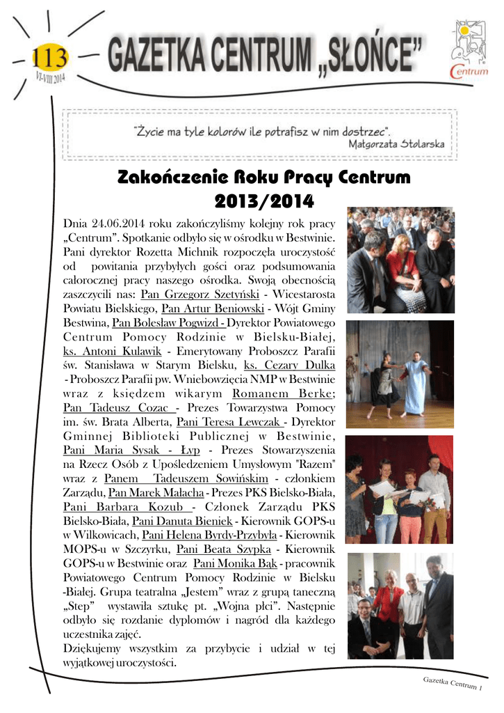 Zakończenie Roku Pracy Centrum 2013/2014 Dnia 24.06.2014 roku zakończyliśmy kolejny rok pracy „Centrum”. Spotkanie odbyło się w ośrodku w Bestwinie. Pani dyrektor Rozetta Michnik rozpoczęła uroczystość od powitania przybyłych gości oraz podsumowania całorocznej pracy naszego ośrodka. Swoją obecnością zaszczycili nas: Pan Grzegorz Szetyński - Wicestarosta Powiatu Bielskiego, Pan Artur Beniowski - Wójt Gminy Bestwina, Pan Bolesław Pogwizd - Dyrektor Powiatowego Centrum Pomocy Rodzinie w Bielsku-Białej, ks. Antoni Kulawik - Emerytowany Proboszcz Parafii św. Stanisława w Starym Bielsku, ks. Cezary Dulka - Proboszcz Parafii pw. Wniebowzięcia NMP w Bestwinie wraz z księdzem wikarym Romanem Berke; Pan Tadeusz Cozac - Prezes Towarzystwa Pomocy im. św. Brata Alberta, Pani Teresa Lewczak - Dyrektor Gminnej Biblioteki Publicznej w Bestwinie, Pani Maria Sysak - Łyp - Prezes Stowarzyszenia na Rzecz Osób z Upośledzeniem Umysłowym "Razem" wraz z Panem Tadeuszem Sowińskim - członkiem Zarządu, Pan Marek Małacha - Prezes PKS Bielsko-Biała, Pani Barbara Kozub - Członek Zarządu PKS Bielsko-Biała, Pani Danuta Bieniek - Kierownik GOPS-u w Wilkowicach, Pani Helena Byrdy-Przybyła - Kierownik MOPS-u w Szczyrku, Pani Beata Szypka - Kierownik GOPS-u w Bestwinie oraz Pani Monika Bąk - pracownik Powiatowego Centrum Pomocy Rodzinie w Bielsku -Białej. Grupa teatralna „Jestem” wraz z grupą taneczną „Step” wystawiła sztukę pt. „Wojna płci”. Następnie odbyło się rozdanie dyplomów i nagród dla każdego uczestnika zajęć. Dziękujemy wszystkim za przybycie i udział w tej wyjątkowej uroczystości. Gazetka C entrum 1 W dniu 24. 06. 2014 roku odbyło się uroczyste zakończenie Roku Pracy Centrum. Najpierw nastąpiło przemówienie zaproszonych gości. Następnie grupa teatralna ''Jestem'' przedstawiła spektakl na podstawie wiersza Ludwika Jerzego Kerna pt. ''Wojna płci''. Wystąpiły w nim : drzewo, Adam i Ewa, wędrowiec, kozacy, księżniczki, kucharka oraz dziewczyna kupująca odzież. W ostatniej kolejności nastąpiło wręczenie dyplomów. Pod koniec był poczęstunek. Sławomir Ślosarczyk Zakończenie roku w Centrum odbyło się 24 czerwca. Były występy grupy teatralnej. Następnie rozdanie dyplomów oraz podziękowanie Pani Dyrektor za całoroczną współpracę. My ze swojej strony wręczyliśmy symboliczne kwiaty wszystkim opiekunom. Na zakończenie był poczęstunek w postaci ciasta i napojów. Ja porozmawiałam sobie z kolegami z Piastowskiej. Było fajnie. Agnieszka Jasińska Julia Berezowska Gracja Boba Dariusz Kluka Paulina Łaciak Katarzyna Rodak Sławomir Ślosarczyk Janusz Tyszecki Bartosz Wierzbowski Ilona Grygierczyk Michał Kozik Tomasz Kozik Gabrysia Krupa Ewa Kubaczka Artur Rakotny Łukasz Przygoda Lucyna Suchy Dariusz Janica Marzena Piecha Sebastian Szypuła Szymon Świerczyński Adrian Kocman Rys. Jola Szwed Solenizanci miesięcy: sierpień, wrzesień, październik Gazetka C entrum 2 KLUB RZECZNIKA /Szymon Boruta/ Gazetka C entrum 3 WYJAZD WAKACYJNY ZAKOŚCIELE 2014 Dnia 9 czerwca 2014 wyjechałem z grupą kolegów i koleżanek z „Centrum” na wczasy do Zakościela. Po przyjeździe na miejsce poszliśmy od razu na obiad, a po obiedzie poszliśmy się rozpakowywać i trochę odpocząć i tak jakoś zleciało do kolacji. We wtorek po śniadaniu pojechaliśmy do Tomaszowa Mazowieckiego do skansenu rzeki Pilicy, było tam dużo ciekawych rzeczy m.in. działa wojskowe, czołgi i wagony kolejowe. W środę mieliśmy całodzienną wyprawę do Trojanowa do „Farmy iluzji”. Było tam dużo ciekawych rzeczy: krzywy dom, kran z wodą wiszący w powietrzu. W czwartek byliśmy w Tomaszowie Mazowieckim i zwiedzaliśmy Groty Nagórzyckie. Po powrocie do Zakościela mieliśmy ognisko. W piątek byliśmy w bunkrze w miejscowości Konewka, bardzo mi się tam podobało, a wieczorem mieliśmy dyskotekę wspólnie z Amerykanami. W sobotę rano po śniadaniu zaczęliśmy się pakować ale znaleźliśmy trochę czasu aby jeszcze zwiedzić stary kościół i cmentarz. Po powrocie poszliśmy na obiad a potem wrzuciliśmy nasze bagaże do busów i wyruszyliśmy w drogę powrotną do Bielska-Białej. Wyjazd bardzo mi się podobał. Dawid Szweda Najlepiej z całego wyjazdu wspominam Amerykanów i naszą wspólną dyskotekę, na której razem się bawiliśmy. Chłopaki byli bardzo przystojni i robili sobie z nami zdjęcia. Bardzo fajny był ich pokaz, najfajniejsze były trzy metrowe kołowce, na których jeździli i żonglowali piłeczkami. Z wszystkich wycieczek najbardziej podobała mi się wycieczka do bunkrów w Konewce, do których jechaliśmy ciuchcią. Pogoda była ładna, atrakcji bardzo wiele, lecz wyjazd za krótki. Mam nadzieję, że uda się nam go powtórzyć. Najlepiej za rok. Jola Sznepka Byłam na wyjeździe w w skansenie rzeki Pilicy. Nagórzyckie. Szliśmy trasą w Konewce. Była także był bardzo udany. Zakościelu. Byliśmy Zwiedzaliśmy Groty turystyczną bunkrów dyskoteka. Wyjazd Anna Łaciak Rys. Marek Szpyra Gazetka C entrum 4 WYJAZD WAKACYJNY ZAKOŚCIELE 2014 Tegoroczny pobyt w Zakościelu trwał od 09.06. do 14.06.2014 roku. Czekały tam na nas liczne atrakcje tj. wypoczynek w hamakach, wycieczki, leśne spacery. Atrakcją był niewielki skrawek plaży, do której można było się dostać jedyną drogą prowadzącą przez most zbudowany z grubych lin. Mieliśmy dużo szczęścia ponieważ przez cały czas dopisywała nam ładna pogoda, za to dokuczały kąsające komary. Zakończeniem turnusu była dyskoteka, którą mieliśmy okazję zakończyć wspólnie z nowymi przyjaciółmi z Dakoty. Wakacyjny wyjazd był bardzo relaksujący oraz był udaną formą wczasów. Krzysiek Tomasik W poniedziałek 9.06.2014r. wyjechaliśmy do Zakościela. Jedzie się bardzo długo bo aż cztery godziny. Ośrodek w Zakościelu należy do chrześcijańskiej fundacji „PROeM” i jest bardzo fajny. W czasie naszego pobytu spotkaliśmy się