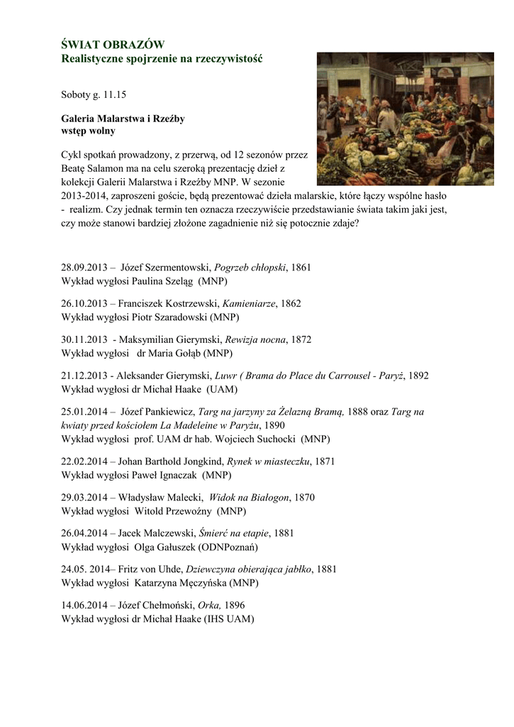 ŚWIAT OBRAZÓW Realistyczne spojrzenie na rzeczywistość Soboty g. 11.15 Galeria Malarstwa i Rzeźby wstęp wolny Cykl spotkań prowadzony, z przerwą, od 12 sezonów przez Beatę Salamon ma na celu szeroką prezentację dzieł z kolekcji Galerii Malarstwa i Rzeźby MNP. W sezonie 2013-2014, zaproszeni goście, będą prezentować dzieła malarskie, które łączy wspólne hasło - realizm. Czy jednak termin ten oznacza rzeczywiście przedstawianie świata takim jaki jest, czy może stanowi bardziej złożone zagadnienie niż się potocznie zdaje? 28.09.2013 – Józef Szermentowski, Pogrzeb chłopski, 1861 Wykład wygłosi Paulina Szeląg (MNP) 26.10.2013 – Franciszek Kostrzewski, Kamieniarze, 1862 Wykład wygłosi Piotr Szaradowski (MNP) 30.11.2013 - Maksymilian Gierymski, Rewizja nocna, 1872 Wykład wygłosi dr Maria Gołąb (MNP) 21.12.2013 - Aleksander Gierymski, Luwr ( Brama do Place du Carrousel - Paryż, 1892 Wykład wygłosi dr Michał Haake (UAM) 25.01.2014 – Józef Pankiewicz, Targ na jarzyny za Żelazną Bramą, 1888 oraz Targ na kwiaty przed kościołem La Madeleine w Paryżu, 1890 Wykład wygłosi prof. UAM dr hab. Wojciech Suchocki (MNP) 22.02.2014 – Johan Barthold Jongkind, Rynek w miasteczku, 1871 Wykład wygłosi Paweł Ignaczak (MNP) 29.03.2014 – Władysław Malecki, Widok na Białogon, 1870 Wykład wygłosi Witold Przewoźny (MNP) 26.04.2014 – Jacek Malczewski, Śmierć na etapie, 1881 Wykład wygłosi Olga Gałuszek (ODNPoznań) 24.05. 2014– Fritz von Uhde, Dziewczyna obierająca jabłko, 1881 Wykład wygłosi Katarzyna Męczyńska (MNP) 14.06.2014 – Józef Chełmoński, Orka, 1896 Wykład wygłosi dr Michał Haake (IHS UAM)