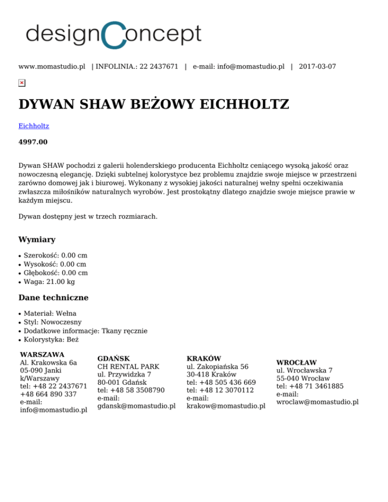 www.momastudio.pl | INFOLINIA.: 22 2437671 | e-mail: [email protected] | 2017-03-07 DYWAN SHAW BEŻOWY EICHHOLTZ Eichholtz 4997.00 Dywan SHAW pochodzi z galerii holenderskiego producenta Eichholtz ceniącego wysoką jakość oraz nowoczesną elegancję. Dzięki subtelnej kolorystyce bez problemu znajdzie swoje miejsce w przestrzeni zarówno domowej jak i biurowej. Wykonany z wysokiej jakości naturalnej wełny spełni oczekiwania zwłaszcza miłośników naturalnych wyrobów. Jest prostokątny dlatego znajdzie swoje miejsce prawie w każdym miejscu. Dywan dostępny jest w trzech rozmiarach. Wymiary ● ● ● ● Szerokość: 0.00 cm Wysokość: 0.00 cm Głębokość: 0.00 cm Waga: 21.00 kg Dane techniczne ● ● ● ● Materiał: Wełna Styl: Nowoczesny Dodatkowe informacje: Tkany ręcznie Kolorystyka: Beż WARSZAWA Al. Krakowska 6a 05-090 Janki k/Warszawy tel: +48 22 2437671 +48 664 890 337 e-mail: [email protected] GDAŃSK CH RENTAL PARK ul. Przywidzka 7 80-001 Gdańsk tel: +48 58 3508790 e-mail: [email protected] KRAKÓW ul. Zakopiańska 56 30-418 Kraków tel: +48 505 436 669 tel: +48 12 3070112 e-mail: [email protected] WROCŁAW ul. Wrocławska 7 55-040 Wrocław tel: +48 71 3461885 e-mail: [email protected]