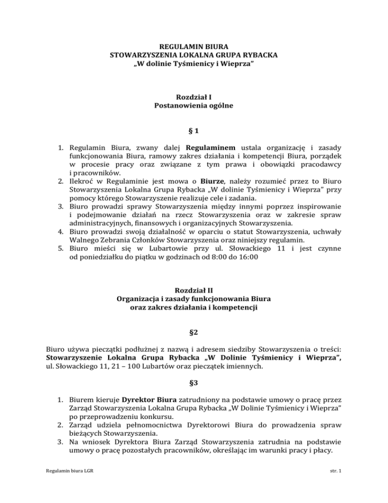 REGULAMIN BIURA STOWARZYSZENIA LOKALNA GRUPA RYBACKA „W dolinie Tyśmienicy i Wieprza” Rozdział I Postanowienia ogólne §1 1. Regulamin Biura, zwany dalej Regulaminem ustala organizację i zasady funkcjonowania Biura, ramowy zakres działania i kompetencji Biura, porządek w procesie pracy oraz związane z tym prawa i obowiązki pracodawcy i pracowników. 2. Ilekroć w Regulaminie jest mowa o Biurze, należy rozumieć przez to Biuro Stowarzyszenia Lokalna Grupa Rybacka „W dolinie Tyśmienicy i Wieprza” przy pomocy którego Stowarzyszenie realizuje cele i zadania. 3. Biuro prowadzi sprawy Stowarzyszenia między innymi poprzez inspirowanie i podejmowanie działań na rzecz Stowarzyszenia oraz w zakresie spraw administracyjnych, finansowych i organizacyjnych Stowarzyszenia. 4. Biuro prowadzi swoją działalność w oparciu o statut Stowarzyszenia, uchwały Walnego Zebrania Członków Stowarzyszenia oraz niniejszy regulamin. 5. Biuro mieści się w Lubartowie przy ul. Słowackiego 11 i jest czynne od poniedziałku do piątku w godzinach od 8:00 do 16:00 Rozdział II Organizacja i zasady funkcjonowania Biura oraz zakres działania i kompetencji §2 Biuro używa pieczątki podłużnej z nazwą i adresem siedziby Stowarzyszenia o treści: Stowarzyszenie Lokalna Grupa Rybacka „W Dolinie Tyśmienicy i Wieprza”, ul. Słowackiego 11, 21 – 100 Lubartów oraz pieczątek imiennych. §3 1. Biurem kieruje Dyrektor Biura zatrudniony na podstawie umowy o pracę przez Zarząd Stowarzyszenia Lokalna Grupa Rybacka „W Dolinie Tyśmienicy i Wieprza” po przeprowadzeniu konkursu. 2. Zarząd udziela pełnomocnictwa Dyrektorowi Biura do prowadzenia spraw bieżących Stowarzyszenia. 3. Na wniosek Dyrektora Biura Zarząd Stowarzyszenia zatrudnia na podstawie umowy o pracę pozostałych pracowników, określając im warunki pracy i płacy. Regulamin biura LGR str. 1 4. Struktura organizacyjna Biura przedstawia się następująco: 1) Dyrektor Biura; 2) Specjalista ds. finansowych (księgowy); 3) Specjalista ds. organizacji i koordynacji projektów; 4) Doradca ds. projektów; 5) Specjalista ds. promocji; §4 1. Dyrektor Biura zapewnia warunki skutecznego i ekonomicznego funkcjonowania oraz sprawuje pieczę nad majątkiem i sprawami Stowarzyszenia w ramach jego umocowania, przy ścisłym przestrzeganiu przepisów prawa oraz postanowień statutu, uchwał Walnego Zebrania Członków oraz uchwał Zarządu i Komitetu Stowarzyszenia. 2. Dyrektor Biura zapewnia protokołowanie posiedzeń Komitetu. §5 Do obowiązków Dyrektora Biura poza zadaniami wymienionymi w §4 należy: 1) prawidłowe zarządzanie sprawami Stowarzyszenia w ramach posiadanych uprawnień i kompetencji, niezastrzeżonych przez inne organy Stowarzyszenia. 2) nadzór i organizację pracy Biura Stowarzyszenia, nadzór i koordynacja nad sprawami kadrowo-księgowymi, nadzór nad należytym wykonywaniem obowiązków przydzielonych pracownikom; 3) sprawowanie pieczy nad sprzętem biurowym oraz zlecanie przeprowadzenia jego konserwacji lub naprawy; 4) prowadzenie procesu naboru kandydatów do zatrudnienia na wolne stanowiska pracy; 5) wykonywanie uchwał Walnego Zebrania Członków, Zarządu Stowarzyszenia oraz Komitetu; 6) realizację zadań określonych przez Zarząd; 7) prowadzenie bieżących spraw stowarzyszenia; 8) gromadzenie i udostępnianie informacji z zakresu działalności Stowarzyszenia; 9) opracowywanie projektów zmian w statucie, regulaminach organizacyjnych oraz LSR, 10) przygotowywanie materiałów na Walne Zebranie Członków, zebrania Zarządu Stowarzyszenia oraz posiedzenia Komitetu; 11) obsługa Walnego Zebrania Członków, Zarządu i Komitetu; 12) prowadzenie rejestru uchwał Walnego Zebrania Członków, Zarządu oraz Komitetu; 13) sporządzanie syntetycznych protokołów z zebrań Zarządu; 14) prowadzenie dokumentacji Walnego Zebrania Członków, Zarządu oraz Komitetu; 15) pomoc przy organizacji pracy Rady Stowarzyszenia oceniającej operacje; 16) sporządzanie odpisów uchwał Walnego Zebrania Członków i wydawanie ich uprawnionym organom; 17) opracowywanie planów pracy, budżetu oraz sprawozdań merytorycznych i finansowych; Regulamin biura LGR str. 2 18) prowadzenie korespondencji; 19) udział w różnego rodzaju naradach, sympozjach, szkoleniach, uroczystościach związanych z działalnością Stowarzyszenia; 20) utrzymywanie stałego kontaktu z członkami Stowarzyszenia; 21) prowadzenie spraw kadrowych i dokumentacji Stowarzyszenia; 22) przygotowanie i składanie wniosków o pomoc finansową na funkcjonowanie Lokalnej Grupy Rybackiej i realizację przedsięwzięć określonych w Lokalnej Strategii Rozwoju; 23) nadzór nad prowadzeniem działań związanych z podnoszeniem kwalifikacji zawodowych pracowników Biura, współuczestniczenie w systemie szkoleń; 24) prowadzenie działań z zakresu animacji lokalnej i współpracy społecznej mających na celu wspierać słabszych grup społeczności w procesie rozwoju lokalnego, stymulowanie potencjalnych beneficjentów oraz pomoc lokalnym koordynatorom projektów. 25) wykonywanie zaleceń pokontrolnych organu przeprowadzającego kontrole oraz udzielanie kontrolującemu i władzom Stowarzyszenia wyczerpujących wyjaśnień wraz z przedstawieniem wszelkich dokumentów i innych materiałów dotyczących przedmiotu kontroli. §7 Dyrektor Biura upoważniony jest do: 1) reprezentowania Stowarzyszenia na zewnątrz; 2) podpisywania bieżącej korespondencji; 3) kierowania pracą i pełnienia nadzoru nad pracownikami Biura i zleceniobiorcami; 4) zawierania umów, umów – zleceń oraz umów o dzieło; 5) dokonywania samodzielnych zakupów bieżących jednorazowo do wysokości 3500 zł netto; 6) współdziałania z przedstawicielami środków masowego przekazu oraz informowanie ich o działalności i zamierzeniach Stowarzyszenia; 7) organizowania konferencji prasowych; 8) koordynowania sprawami funkcjonowania zespołów problemowych; 9) podejmowania decyzji dotyczących dział