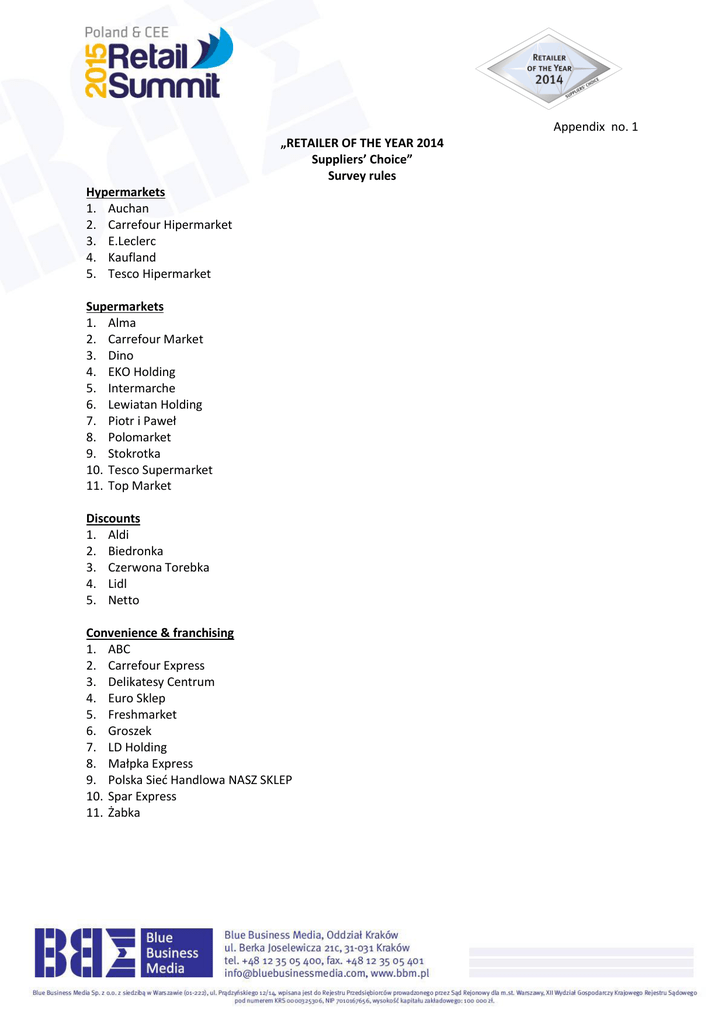 Appendix no. 1 „RETAILER OF THE YEAR 2014 Suppliers’ Choice” Survey rules Hypermarkets 1. Auchan 2. Carrefour Hipermarket 3. E.Leclerc 4. Kaufland 5. Tesco Hipermarket Supermarkets 1. Alma 2. Carrefour Market 3. Dino 4. EKO Holding 5. Intermarche 6. Lewiatan Holding 7. Piotr i Paweł 8. Polomarket 9. Stokrotka 10. Tesco Supermarket 11. Top Market Discounts 1. Aldi 2. Biedronka 3. Czerwona Torebka 4. Lidl 5. Netto Convenience & franchising 1. ABC 2. Carrefour Express 3. Delikatesy Centrum 4. Euro Sklep 5. Freshmarket 6. Groszek 7. LD Holding 8. Małpka Express 9. Polska Sieć Handlowa NASZ SKLEP 10. Spar Express 11. Żabka Regional & local retail chains 1. Aldik 2. Arhelan 3. Chata Polska 4. Eden 5. Grupa Chorten 6. Sieć Handlowa Rabat 7. Simply Market 8. Sklep Polski 9. SPAR Market 10. Topaz Wholesalers & Distributors 1. Bać-Pol 2. Eurocash 3. Grupa MPT 4. Makro Cash&Carry 5. MAROL 6. Selgros 7. Specjał