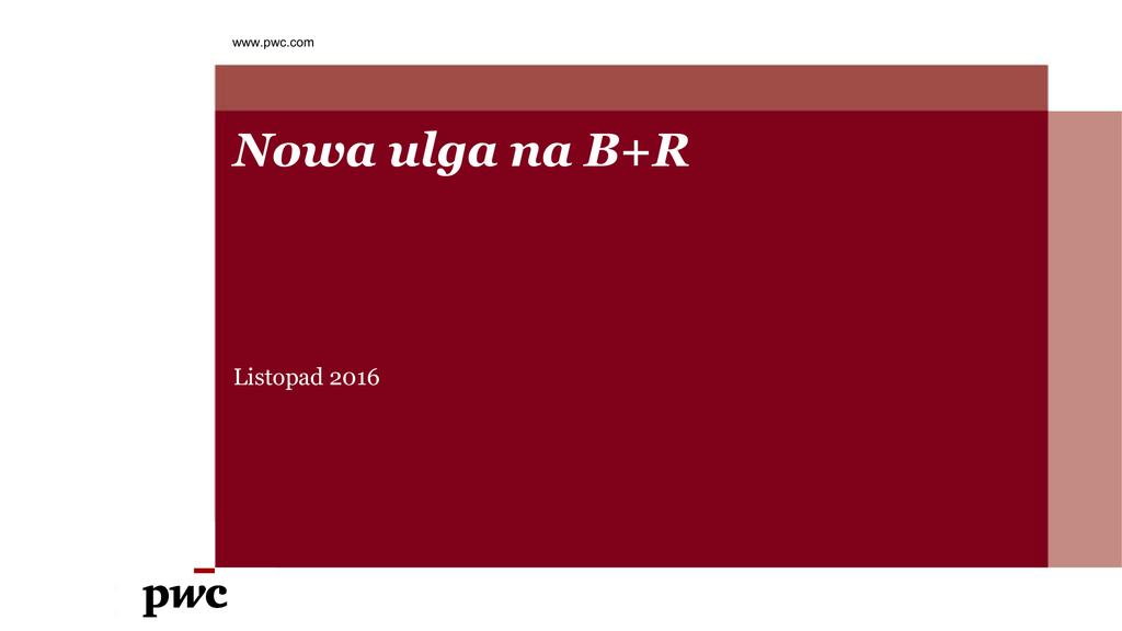 www.pwc.com Nowa ulga na B+R Listopad 2016 Nowa ulga na B+R Informacje podstawowe 01 Warunkiem skorzystania z ulgi B+R będzie poniesienie wydatków mieszczących się w ustawowo zdefiniowanej działalności badawczo-rozwojowej – koszty kwalifikowane. 1 stycznia 2016 r. weszła w życie Ustawa o zmianie niektórych ustaw w związku ze wspieraniem innowacyjności, która przewiduje możliwość odliczenia przez przedsiębiorców wydatków poniesionych na działalność badawczo-rozwojową – czyli tzw. ulga na badania i rozwój (B+R). 02 Przestaje obowiązywać dotychczasowa ulga tzw. „ulga na nowe 03 technologie”. 21 października Senat uchwalił zmiany do Ustawy, które weszłyby w życie od stycznia 2017 r. Najważniejsze z nich zakładają zwiększenie dopuszczalnej wielkości odpisów oraz okresu odliczania poniesionych kosztów. 04 05 PwC Ministerstwo Nauki i Szkolnictwa Wyższego przygotowuje projekt tzw. dużej ustawy o wspieraniu innowacyjności, wg. zapowiedzi m.in. kolejnemu zwiększeniu miałyby ulec dopuszczalne wielkości odpisów. 2 Zakres działań kwalifikujący się do ulgi 01 Ulga nie wymaga prowadzenia ewidencji w podziale na projekty, a jedynie rodzaje kosztów, niemniej jednak ewidencja w podziale na projekty daje przedsiębiorstwu ważną informację zarządczą i pozwala na bardziej elastyczne podejście do całego systemu. 02 03 Ustawa nie ogranicza sposobów komercjalizacji i wykorzystania wyników prowadzonych prac B+R. Można je więc wykorzystywać we własnej działalności, jak również udostępnić innym spółkom z grupy, czy podmiotom zewnętrznym. PwC Ulga pozwala na kwalifikowanie projektów w toku – na przykład rozpoczętych w poprzednich latach. Nie ma znaczenia wynik prowadzonych badań, czyli można kwalifikować projekty, które nie zakończyły się sukcesem, lub zostały zamknięte w trakcie realizacji. Nie jest też ważny poziom innowacyjności. 04 3 Wysokość ulgi na B+R Odpis od podstawy opodatkowania Wielkość przedsiębiorstwa Każde Rodzaj kosztów kwalifikowanych Koszty wynagrodzeń Wielkość odpisu Planowane zmiany od 2017 roku 2016 rok 100% 150% 130% 150% Małe i średnie Duże Pozostałe koszty kwalifikowane 120% 130% 110% PwC Korzyść podatkowa - % poniesionych kosztów B+R który wraca do przedsiębiorstwa w formie niezapłaconego podatku 1,9% 2016 rok 3,8% Odpis 110% Duże przedsiębiorstwo na kosztach pozostałych Planowane zmiany od 2017 roku Odpis 130% 5,7% PwC Odpis 120% Małe i średnie przedsiębiorstwo na kosztach pozostałych Odpis 150% 9,5% 5,7% Odpis 130% Wszystkie przedsiębiorstwa na kosztach wynagrodzeń Odpis 150% 9,5% Jak to działa? Kalkulacja ulgi – przykład – duże przedsiębiorstwo Bez ulgi na B+R Koszty kwalifikowane do ulgi B+R Koszty B+R – wynagrodzenia Z ulgą na B+R 20 000 000 Pozostałe koszty B+R np. amortyzacja sprzętu 4 500 000 Podstawa opodatkowania 200 000 000 Odpis z tytułu kosztów B+R - wynagrodzenia (30%) nd. 6 000 000 Odpis z tytułu kosztów B+R - pozostałe koszty (10%) nd. 450 000 200 000 000 193 550 000 38 000 000 36 774 500 Podstawa opodatkowania po odliczeniu ulgi na B+R Podatek (19%) KORZYŚĆ Z ZASTOSOWANIA ULGI - różnica w opodatkowaniu – 2016 r. 1 225 500 PLN Realna korzyść procentowo (% całkowitych kosztów B+R (wynagrodzenia i amortyzacja), który wraca w formie niezapłaconego podatku) KORZYŚĆ Z ZASTOSOWANIA ULGI – zgodnie ze zmianami planowanymi od 2017 r. PwC 5,00% 2 156 500 PLN 8,80% 6 Kategorie kosztów kwalifikowanych Płace i składki pracowników, w części finansowanej przez płatnika składek, jeżeli te należności i składki dotyczą pracowników zatrudnionych w celu realizacji działalności badawczo-rozwojowej, PwC Nabycie materiałów i surowców bezpośrednio związanych z prowadzoną działalnością badawczo-rozwojową, Ekspertyzy, opinie, usługi doradcze i usługi równorzędne, a także nabycie wyników badań naukowych, świadczonych lub wykonywanych na podstawie umowy przez jednostkę naukową na potrzeby prowadzonej działalności badawczorozwojowej, Odpłatne korzystanie z aparatury naukowobadawczej wykorzystywanej wyłącznie w prowadzonej działalności badawczorozwojowej, jeżeli to korzystanie nie wynika z umowy zawartej z podmiotem powiązanym z podatnikiem, Odpisy amortyzacyjne od środków trwałych oraz wartości niematerialnych i prawnych wykorzystywanych w prowadzonej działalności badawczorozwojowej, z wyłączeniem samochodów osobowych oraz budowli, budynków i lokali będących odrębną własnością. 7 Działania B+R kwalifikowane do ulgi Działalność badawczo rozwojowa PwC Działalność badawczorozwojowa - oznacza to działalność twórczą obejmującą badania naukowe lub prace rozwojowe, podejmowaną w sposób systematyczny w celu zwiększenia zasobów wiedzy oraz wykorzystania zasobów wiedzy do tworzenia nowych zastosowań. 8 Działalność badawcza definicje (1/2) Badania naukowe obejmują: Badania Podstawowe oryginalne prace badawcze, eksperymentalne lub teoretyczne podejmowane przede wszystkim w celu zdobywania nowej wiedzy o podstawach zjawisk i obserwowalnych faktów bez nastawienia na bezpośrednie zastosowanie komercyjne kwalifikowane, gdy zlecone jednostce naukowej, PwC Badania stosowane prace badawcze podejmowane w celu zdobycia nowej wiedzy, zorientowane przede wszystkim na zastosowanie w praktyce, Badania przemysłowe badania mające na celu zdobycie nowej wiedzy w celu opracowywania nowych produktów, procesów i usług lub wprowadzania znaczących ulepszeń do istniejących produktów, procesów i usług (np. budowa prototypów w środowisku laboratoryjnym). 9 Działalność badawcza definicje (2/2) Prace rozwojowe to: Nabywanie, łączenie, kształtowanie i wykorzystywanie dostępnej aktualnie wiedzy i umiejętności do planowania produkcji oraz tworzenia i projektowania nowych, zmienionych lub ulepszonych produktów, procesów i usług, PwC Opracowywanie prototypów i projektów pilota