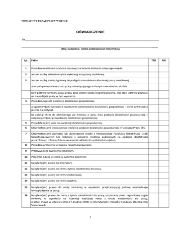 POWIATOWY URZĄD PRACY W OPOLU OŚWIADCZENIE Ja,_______________________________________________________________________________ _____________________________________________________________________________ ___ (IMIĘ I NAZWISKO, ADRES ZAMIESZKANIA ORAZ PESEL) Lp. Fakty TAK 1 Posiadam meldunek (stały lub czasowy) na terenie działania tutejszego urzędu. 2 Jestem osobą zatrudnioną lub wykonuję inną pracę zarobkową. 3 Jestem osobą zdolną i gotową do podjęcia zatrudnienia albo innej pracy zarobkowej a) w pełnym wymiarze czasu pracy obowiązującego w danym zawodzie lub służbie b) w połowie wymiaru czasu pracy, gdyż jestem osobą niepełnosprawną, lecz stan zdrowia pozwala mi na podjęcie pracy w tym wymiarze. 4 Posiadam wpis do ewidencji działalności gospodarczej. a) zgłosiłem(am) wniosek o zawieszenie wykonywania działalności gospodarczej i okres zawieszenia jeszcze nie upłynął. b) upłynął okres do określonego we wniosku o wpis, dnia podjęcia działalności gospodarczej – rozpocząłem(am) prowadzenie działalności gospodarczej. 5 Posiadałem(am) wpis do ewidencji działalności gospodarczej. 6 Otrzymałem(am) jednorazowo środki na podjęcie działalności gospodarczej z Funduszu Pracy, EFS. 7 Otrzymałem(am) pożyczkę lub jednorazowe środki z Państwowego Funduszu Rehabilitacji Osób Niepełnosprawnych lub instytucji z udziałem środków publicznych na podjęcie działalności pozarolniczej, rolniczej lub na wniesienie wkładu do spółdzielni socjalnej. 8 Posiadam orzeczenie o stopniu niepełnosprawności. 9 Przebywam na zwolnieniu lekarskim. 10 Pobieram naukę w szkole w systemie dziennym. 11 Nabyłem(am) prawo do emerytury . 12 Nabyłem(am) prawo do renty z tytułu niezdolności do pracy. 13 Nabyłem(am) prawo do renty szkoleniowej. 14 Nabyłem(am) prawo do renty socjalnej. 15 Nabyłem(am) prawo do renty rodzinnej w wysokości przekraczającej połowę minimalnego wynagrodzenia za pracę. 16 Nabyłem(am) prawo do renty z tytułu niezdolności do pracy, przyznanej przez zagraniczny organ rentowy, w wysokości co najmniej najniższej renty z tytułu niezdolności do pracy, o której mowa w ustawie z dnia 17 grudnia 1998r. o emeryturach i rentach z Funduszu Ubezpieczeń Społecznych. 1 NIE 17 Nabyłem(am) prawo do emerytury, przyznanej przez zagraniczny organ emerytalny, w wysokości co najmniej najniższej emerytury, o której mowa w ustawie z dnia 17 grudnia 1998r. o emeryturach i rentach z Funduszu Ubezpieczeń Społecznych. 18 Pobieram zasiłek przedemerytalny. 19 Pobieram świadczenie przedemerytalne. 20 Pobieram nauczycielskie świadczenie kompensacyjne. 21 Pobieram świadczenie rehabilitacyjne. 22 Pobieram świadczenia szkoleniowe. 23 Pobieram zasiłek chorobowy. 24 Pobieram zasiłek macierzyński. 25 Pobieram zasiłek w wysokości zasiłku macierzyńskiego - po ustaniu zatrudnienia, innej pracy zarobkowej lub zaprzestaniu prowadzenia pozarolniczej działalności. 26 Jestem właścicielem lub posiadaczem ( samoistnym lub zależnym ) nieruchomości rolnej o powierzchni użytków rolnych powyżej 2 ha przeliczeniowych. 27 Podlegam ubezpieczeniu emerytalno-rentowemu z tytułu stałej pracy jako współmałżonek w gospodarstwie rolnym o powierzchni użytków rolnych przekraczającej 2 ha przeliczeniowe. 28 Podlegam ubezpieczeniu emerytalno-rentowemu z tytułu stałej pracy jako domownik w gospodarstwie rolnym o powierzchni użytków rolnych przekraczającej 2 ha przeliczeniowe. 29 Uzyskuję przychody podlegające opodatkowaniu podatkiem dochodowym z działów specjalnych produkcji rolnej ( chyba, że dochód z działów specjalnych produkcji rolnej, obliczony dla ustalenia podatku dochodowego od osób fizycznych, nie przekracza wysokości przeciętnego dochodu z pracy w indywidualnych gospodarstwach rolnych z 2 ha przeliczeniowych ustalonego przez Prezesa Głównego Urzędu Statystycznego na podstawie przepisów o podatku rolnym ). a) podlegam ubezpieczeniu emerytalno-rentowemu z tytułu stałej pracy jako współmałżonek w takim gospodarstwie b) podlegam ubezpieczeniu emerytalno-rentowemu z tytułu stałej pracy jako domownik w takim gospodarstwie 30 Podlegam obowiązkowi ubezpieczenia społecznego lub zaopatrzenia emerytalnego (nie dotyczy ubezpieczenia społecznego rolników ). 31 Biorę udział w stażu organizowanym przez inny podmiot niż powiatowy urząd pracy. 32 Biorę udział w szkoleniu organizowanym przez inny podmiot niż powiatowy urząd pracy. 33 Jestem osobą tymczasowo aresztowaną lub odbywam karę pozbawienia wolności, nie dotyczy kary pozbawienia wolności odbywanej poza zakładem karnym w systemie dozoru elektronicznego. 34 Uzyskuję miesięcznie przychód w wysokości przekraczającej połowę minimalnego wynagrodzenia za pracę z wyłączeniem przychodów uzyskanych z tytułu odsetek lub innych przychodów od środków pieniężnych zgromadzonych na rachunku bankowym. 35 Korzystam ze świadczeń pomocy społecznej. 36 Pobieram, na podstawie przepisów o pomocy społecznej, zasiłek stały. 2 37 Pobieram na podstawie przepisów o świadczeniach rodzinnych, świadczenie pielęgnacyjne. 38 Pobieram na podstawie przepisów o świadczeniach rodzinnych, specjalny zasiłek opiekuńczy lub dodatek do zasiłku rodzinnego z tytułu samotnego wychowywania dziecka i utraty prawa do zasiłku dla bezrobotnych na skutek upływu ustawowego okresu jego pobierania. 39 Pobieram na podstawie przepisów o ustaleniu i wypłacie zasiłków dla opiekunów zasiłek dla opiekuna. 40 Jestem zarejestrowany(a) w innym urzędzie pracy jako osoba bezrobotna na terenie kraju lub Unii Europejskiej. 41 Jestem osobą transferującą zasiłek z innego państwa . 42 Jestem zainteresowany(a) podjęciem pracy w krajach Unii Europejskiej/Europejskiego Obszaru Gospodarczego. 43 Wyrażam zgodę na udział w badaniach rynku pracy prowadzonych przez publiczne służby zatrudnienia, organy administracji rządowej lub samorządowej lub na ich zlecenie. 44 Przekazane 