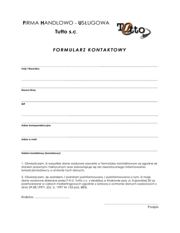 FIRMA HANDLOWO - USŁUGOWA Tutto s.c. FORMULARZ KONTAKTOWY …………………………………….………………………................................................................ Imię i Nazwisko …………………………………..................................................................................................... .................................................................................................................................................... Nazwa firmy …………………………………………………………………………………………………………… NIP …………………………………….................................................................................................. .................................................................................................................................................... Adres korespondencyjny …………………………………….................................................................................................. Adres e-mail …………………………………..................................................................................................... Telefon kontaktowy (komórkowy) 1. Oświadczam, iż wszystkie dane osobowe zawarte w formularzu kontaktowym są zgodne ze stanem prawnym i faktycznym oraz zobowiązuje się do niezwłocznego informowania świadczeniodawcy o zmianie tych danych. 2. Oświadczam, że zostałem / zostałam poinformowany / poinformowana o tym, iż moje dane osobowe zbierane przez F.H.U. Tutto s.c. z siedzibą w Krakowie przy ul. Kujawskiej 20 są przetwarzane w celach marketingowych zgodnie z Ustawą o ochronie danych osobowych z dnia 29.08.1997r. (Dz. U. 1997 Nr 133 poz. 883). Kraków, …………………………. …………………………………………. Podpis