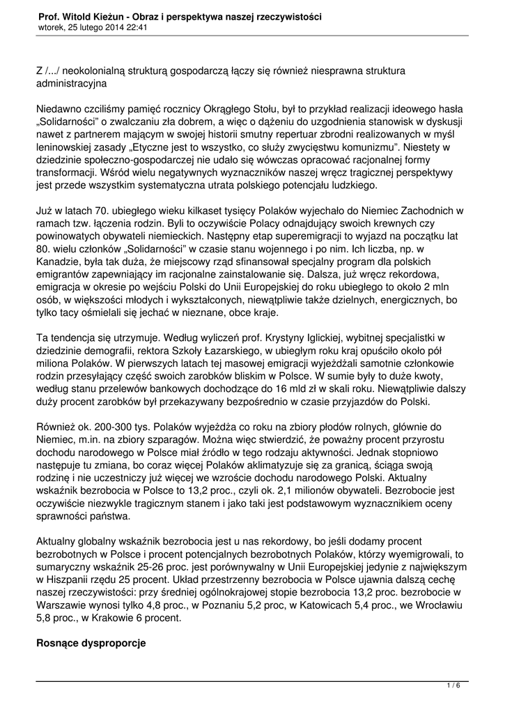 Prof. Witold Kieżun - Obraz i perspektywa naszej rzeczywistości wtorek, 25 lutego 2014 22:41 Z /.../ neokolonialną strukturą gospodarczą łączy się również niesprawna struktura administracyjna Niedawno czciliśmy pamięć rocznicy Okrągłego Stołu, był to przykład realizacji ideowego hasła „Solidarności” o zwalczaniu zła dobrem, a więc o dążeniu do uzgodnienia stanowisk w dyskusji nawet z partnerem mającym w swojej historii smutny repertuar zbrodni realizowanych w myśl leninowskiej zasady „Etyczne jest to wszystko, co służy zwycięstwu komunizmu”. Niestety w dziedzinie społeczno-gospodarczej nie udało się wówczas opracować racjonalnej formy transformacji. Wśród wielu negatywnych wyznaczników naszej wręcz tragicznej perspektywy jest przede wszystkim systematyczna utrata polskiego potencjału ludzkiego. Już w latach 70. ubiegłego wieku kilkaset tysięcy Polaków wyjechało do Niemiec Zachodnich w ramach tzw. łączenia rodzin. Byli to oczywiście Polacy odnajdujący swoich krewnych czy powinowatych obywateli niemieckich. Następny etap superemigracji to wyjazd na początku lat 80. wielu członków „Solidarności” w czasie stanu wojennego i po nim. Ich liczba, np. w Kanadzie, była tak duża, że miejscowy rząd sfinansował specjalny program dla polskich emigrantów zapewniający im racjonalne zainstalowanie się. Dalsza, już wręcz rekordowa, emigracja w okresie po wejściu Polski do Unii Europejskiej do roku ubiegłego to około 2 mln osób, w większości młodych i wykształconych, niewątpliwie także dzielnych, energicznych, bo tylko tacy ośmielali się jechać w nieznane, obce kraje. Ta tendencja się utrzymuje. Według wyliczeń prof. Krystyny Iglickiej, wybitnej specjalistki w dziedzinie demografii, rektora Szkoły Łazarskiego, w ubiegłym roku kraj opuściło około pół miliona Polaków. W pierwszych latach tej masowej emigracji wyjeżdżali samotnie członkowie rodzin przesyłający część swoich zarobków bliskim w Polsce. W sumie były to duże kwoty, według stanu przelewów bankowych dochodzące do 16 mld zł w skali roku. Niewątpliwie dalszy duży procent zarobków był przekazywany bezpośrednio w czasie przyjazdów do Polski. Również ok. 200-300 tys. Polaków wyjeżdża co roku na zbiory płodów rolnych, głównie do Niemiec, m.in. na zbiory szparagów. Można więc stwierdzić, że poważny procent przyrostu dochodu narodowego w Polsce miał źródło w tego rodzaju aktywności. Jednak stopniowo następuje tu zmiana, bo coraz więcej Polaków aklimatyzuje się za granicą, ściąga swoją rodzinę i nie uczestniczy już więcej we wzroście dochodu narodowego Polski. Aktualny wskaźnik bezrobocia w Polsce to 13,2 proc., czyli ok. 2,1 milionów obywateli. Bezrobocie jest oczywiście niezwykle tragicznym stanem i jako taki jest podstawowym wyznacznikiem oceny sprawności państwa. Aktualny globalny wskaźnik bezrobocia jest u nas rekordowy, bo jeśli dodamy procent bezrobotnych w Polsce i procent potencjalnych bezrobotnych Polaków, którzy wyemigrowali, to sumaryczny wskaźnik 25-26 proc. jest porównywalny w Unii Europejskiej jedynie z największym w Hiszpanii rzędu 25 procent. Układ przestrzenny bezrobocia w Polsce ujawnia dalszą cechę naszej rzeczywistości: przy średniej ogólnokrajowej stopie bezrobocia 13,2 proc. bezrobocie w Warszawie wynosi tylko 4,8 proc., w Poznaniu 5,2 proc, w Katowicach 5,4 proc., we Wrocławiu 5,8 proc., w Krakowie 6 procent. Rosnące dysproporcje 1/6 Prof. Witold Kieżun - Obraz i perspektywa naszej rzeczywistości wtorek, 25 lutego 2014 22:41 Jak wiadomo, bezrobocie do 5 proc. jest tzw. frykcyjnym, a więc wynikającym jedynie z okresowego braku pracy na skutek jej zmiany, oczekiwania zatrudnienia po studiach itp. Można więc stwierdzić, że w mniej więcej 10 ośrodkach miejskich w Polsce problem bezrobocia nie ma charakteru priorytetowego, biorąc też pod uwagę, że w Warszawie na 1000 mieszkańców jest więcej samochodów osobowych niż w Paryżu, a średnia płaca w Warszawie jest poważnie wyższa od średniej w Polsce. Widzimy, że dalszą cechą naszej rzeczywistości jest bardzo daleko idąca różnica między tymi miastami a tzw. prowincją. 1 milion 200 tysięcy Polaków posiada tylko ustawową minimalną płacę 1 tys. 680 zł miesięcznie brutto, podczas gdy najniższe pensje np. we Francji to w przeliczeniu na złote: 5 tys. 935 zł, w Irlandii 6 tys. 067 zł, w Hiszpanii 3 tys. 125 zł i w Grecji 2 tys. 839 złotych. Oczywiście nieco inaczej kształtuje się struktura cen w różnych krajach, ale wiele produktów przemysłowych jest nawet tańszych niż w Polsce. Natomiast średnie pensje miesięczne polskich kierowników banków dochodzą do 120 tys. zł miesięcznie, a zagranicznych kierowników banków w Polsce do 300 tys. zł, płace dyrektorów giełdowych spółek 60-70 tysięcy miesięcznie, nie mówiąc już o milionach zarabianych przez 100 najbogatszych polskich przemysłowców i rekinów giełdowych. Według danych Boston Consulting Group, w Polsce jest 38 tys. osób, których majątek przekracza 1 milion dolarów, według ich prognoz w 2017 roku liczba tych bogaczy wzrośnie do 78 tysięcy. Mamy więc w Polsce wysoką stratyfikację zarobków. Pod tym względem jesteśmy drugim krajem po Rosji w krajach Europy Środkowo-Wschodniej. Dużo niższe zarobki w Polsce niż w 15 pierwszych krajach Unii Europejskiej są wynikiem ich struktury gospodarczej, np. jedynie 6 proc. zagranicznych banków w Niemczech i jedynie 10 proc. zagranicznych banków we Francji, czy 20 proc. w Danii, a zdecydowana większość przemysłu i handlu w rękach miejscowych właścicieli plus liczne udziały w wielonarodowych wielkich koncernach. Skalę istniejącej biedy w Polsce przedstawia opublikowany ostatnio przez Główny Urząd Statystyczny dokument „Warunki życia rodzin w Polsce”. Okazuje się, że aż 1,4 mln dzieci w Polsce żyje w skrajnej biedzie i niedostatku. 