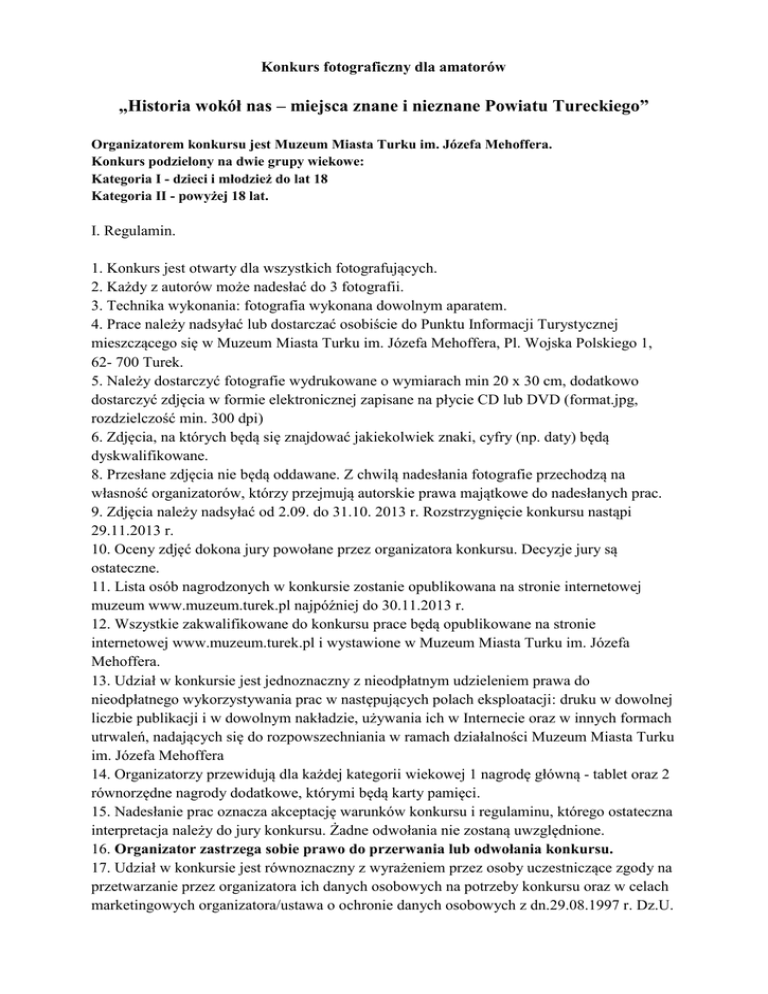 Konkurs fotograficzny dla amatorów „Historia wokół nas – miejsca znane i nieznane Powiatu Tureckiego” Organizatorem konkursu jest Muzeum Miasta Turku im. Józefa Mehoffera. Konkurs podzielony na dwie grupy wiekowe: Kategoria I - dzieci i młodzież do lat 18 Kategoria II - powyżej 18 lat. I. Regulamin. 1. Konkurs jest otwarty dla wszystkich fotografujących. 2. Każdy z autorów może nadesłać do 3 fotografii. 3. Technika wykonania: fotografia wykonana dowolnym aparatem. 4. Prace należy nadsyłać lub dostarczać osobiście do Punktu Informacji Turystycznej mieszczącego się w Muzeum Miasta Turku im. Józefa Mehoffera, Pl. Wojska Polskiego 1, 62- 700 Turek. 5. Należy dostarczyć fotografie wydrukowane o wymiarach min 20 x 30 cm, dodatkowo dostarczyć zdjęcia w formie elektronicznej zapisane na płycie CD lub DVD (format.jpg, rozdzielczość min. 300 dpi) 6. Zdjęcia, na których będą się znajdować jakiekolwiek znaki, cyfry (np. daty) będą dyskwalifikowane. 8. Przesłane zdjęcia nie będą oddawane. Z chwilą nadesłania fotografie przechodzą na własność organizatorów, którzy przejmują autorskie prawa majątkowe do nadesłanych prac. 9. Zdjęcia należy nadsyłać od 2.09. do 31.10. 2013 r. Rozstrzygnięcie konkursu nastąpi 29.11.2013 r. 10. Oceny zdjęć dokona jury powołane przez organizatora konkursu. Decyzje jury są ostateczne. 11. Lista osób nagrodzonych w konkursie zostanie opublikowana na stronie internetowej muzeum www.muzeum.turek.pl najpóźniej do 30.11.2013 r. 12. Wszystkie zakwalifikowane do konkursu prace będą opublikowane na stronie internetowej www.muzeum.turek.pl i wystawione w Muzeum Miasta Turku im. Józefa Mehoffera. 13. Udział w konkursie jest jednoznaczny z nieodpłatnym udzieleniem prawa do nieodpłatnego wykorzystywania prac w następujących polach eksploatacji: druku w dowolnej liczbie publikacji i w dowolnym nakładzie, używania ich w Internecie oraz w innych formach utrwaleń, nadających się do rozpowszechniania w ramach działalności Muzeum Miasta Turku im. Józefa Mehoffera 14. Organizatorzy przewidują dla każdej kategorii wiekowej 1 nagrodę główną - tablet oraz 2 równorzędne nagrody dodatkowe, którymi będą karty pamięci. 15. Nadesłanie prac oznacza akceptację warunków konkursu i regulaminu, którego ostateczna interpretacja należy do jury konkursu. Żadne odwołania nie zostaną uwzględnione. 16. Organizator zastrzega sobie prawo do przerwania lub odwołania konkursu. 17. Udział w konkursie jest równoznaczny z wyrażeniem przez osoby uczestniczące zgody na przetwarzanie przez organizatora ich danych osobowych na potrzeby konkursu oraz w celach marketingowych organizatora/ustawa o ochronie danych osobowych z dn.29.08.1997 r. Dz.U. Nr 133 poz.833 z pózn. zm./.Osoby uczestniczące w konkursie potwierdzają swoją zgodę na powyższe podpisując oświadczenie na Karcie Uczestnictwa (załącznik do Regulaminu). II. Przepisy dotyczące prac: 2.1. Prace nie mogą być nagrodzone w innych konkursach. 2.2. Prace powinny być związane tematycznie z tytułem organizowanego konkursu. 2.3. Rozmiary fotografii powinny wynosić 20x30 cm, wersje elektroniczne zdjęć (format.jpg, rozdzielczość min. 300 dpi). 2.4. Każde zdjęcie powinno być opatrzone w: godło autora (pseudonim), tytuł, rok, miejsce wykonania, kategorię wiekową. 2.5. Do koperty (zaadresowanej na: Muzeum Miasta Turku im. Józefa Mehoffera, Plac Wojska Polskiego 1, 62-700 Turek, z dopiskiem: Konkurs fotograficzny „Historia wokół nas - miejsca znane i nie znane Powiatu Tureckiego”) należy włożyć: 1) podpisane prace (dodatkowo wersje elektroniczne na płycie), 2) drugą zaklejoną kopertę, oznaczoną na zewnątrz godłem autora, która zawierać powinna wypełnioną kartę zgłoszeniową 2.6. Organizator zastrzega sobie prawo do wyłączenia z udziału w konkursie prac o niskiej jakości technicznej, niespełniających kryteriów tematycznych oraz niespełniających wyżej wymienionych wymogów. 2.7. Organizator nie zwraca prac biorących udział w konkursie, prac zdyskwalifikowanych jak również z niego wyłączonych. 2.8. Informacji dotyczących konkursu udziela Radosław Nawrot, tel. 63 222 30 93 lub 63 222 30 86, e-mail: [email protected] Na stronie Muzeum Miasta Turku im. Józefa Mehoffera można pobrać kartę uczestnictwa, której wypełnienie jest niezbędne, aby brać udział w naszym konkursie. Skład Komisji Konkursowej: „Historia wokół nas - miejsca znane i nieznane Powiatu Tureckiego” 1. Radosław Nawrot – grafik komputerowy 2. Joanna Skieresz – pracownik działu promocji muzeum 3. Ewelina Derucka- fotoreporter Muzeum Miasta Turku im. Józefa Mehoffera KARTA UCZESTNICTWA w konkursie fotograficznym: „Historia wokół nas - miejsca znane i nie znane Powiatu Tureckiego” Godło autora:…………………………………….………… wiek autora: ………………………………………….…….. Imię i nazwisko……………………………………………………………………… Miejsce zamieszkania: Miejscowość: ……………………………………………….. Poczta (kod pocztowy) ..…………………………………….. Ulica: ...........................................................nr domu……….. mieszkania………………………. Telefon: ………………………………………………….. e-mail: …………………………..…. Wykaz nadesłanych zdjęć Nr. 1. Tytuł pracy 2. 3. Oświadczam, że zapoznałem się z regulaminem i akceptuję jego wszystkie postanowienia. Dobrowolnie przystąpiłem do uczestnictwa w konkursie. Dane zawarte w zgłoszeniu są zgodne z prawdą. Oświadczam, że wszelkie treści, w tym dzieła nie naruszają jakichkolwiek praw autorskich i osobistych, a dane osobowe zawarte na karcie uczestnictwa w konkursie są prawdziwe. Wyrażam zgodę na przetwarzanie moich danych osobowych na potrzeby przeprowadzenia konkur