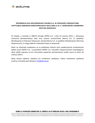 INFORMACJA DLA AKCJONARIUSZY ADUMA S.A. W UPADŁOŚCI LIKWIDACYJNEJ DOTYCZĄCA ZNIESIENIA DEMATERIALIZACJI AKCJI SERII A, B I C I MOŻLIWOŚCI ODEBRANIA AKCJI NA OKAZICIELA W związku z uchwała nr 408/15 Zarządu KDPW S.A. z dnia 24 czerwca 2015 r., dotyczącą zniesienia dematerializacji akcji oraz ustania uczestnictwa Aduma S.A. w upadłości likwidacyjnej w Krajowym Depozycie, Zarząd Aduma S.A. w upadłości likwidacyjnej informuje Akcjonariuszy, iż mogą odebrać materialne akcje na okaziciela. Akcje na okaziciela wydawane są na podstawie danych kont ewidencyjnych przekazanych Spółce przez KDPW S.A. i uczestników KDPW S.A. wszystkim Akcjonariuszom posiadającym akcje spółki zapisane na ich rachunkach papierów wartościowych wedle stanu na dzień 26 czerwca 2015 r. Akcje można odebrać osobiście po umówieniu spotkania. Celem umówienia spotkania prosimy o kontakt pod adresem [email protected] ADUMA S.A. w upadłości likwidacyjnej, Ul. Duńska 9, 54-427 Wrocław, Polska, E-maiL: [email protected] Aduma S.A. w upadłości likwidacyjnej, z siedzibą we Wrocławiu, 54-427, przy ul. Duńskiej 9, wpisana do rejestru przedsiębiorców prowadzonego przez Sąd Rejonowy dla Wrocławia – Fabrycznej we Wrocławiu, VI Wydział Gospodarczy Krajowego Rejestru Sądowego pod numerem KRS 0000390102, NIP 894-29-92-201, REGON: 021167590. Kapitał zakładowy 125.394,60 PLN, w całości opłacony.