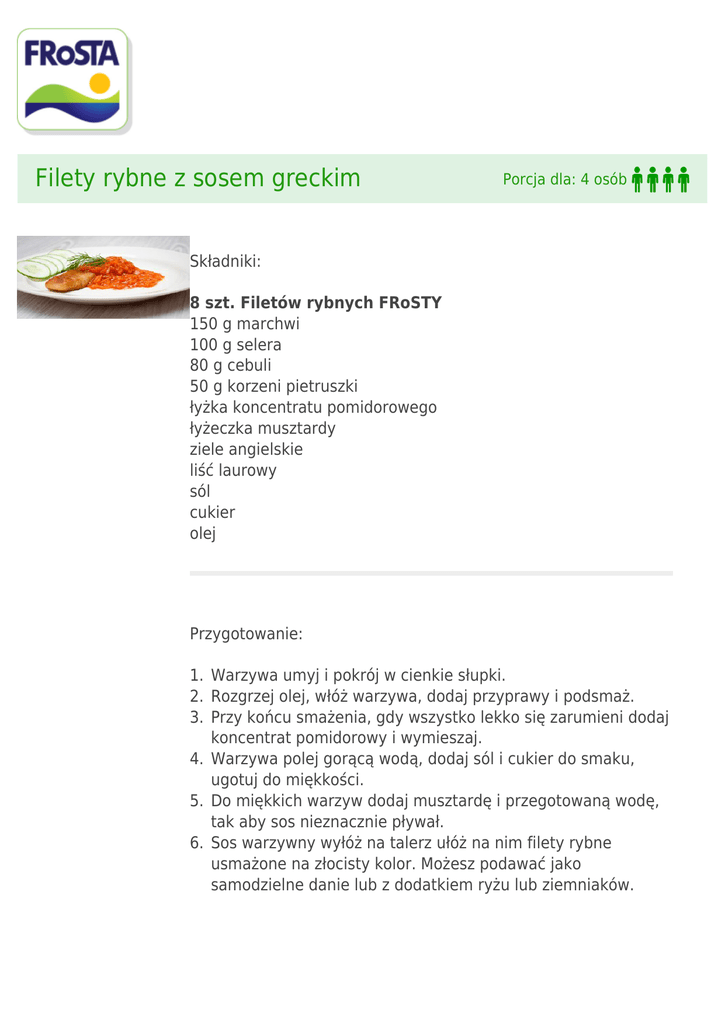 Filety rybne z sosem greckim Porcja dla: 4 osób Składniki: 8 szt. Filetów rybnych FRoSTY 150 g marchwi 100 g selera 80 g cebuli 50 g korzeni pietruszki łyżka koncentratu pomidorowego łyżeczka musztardy ziele angielskie liść laurowy sól cukier olej Przygotowanie: 1. Warzywa umyj i pokrój w cienkie słupki. 2. Rozgrzej olej, włóż warzywa, dodaj przyprawy i podsmaż. 3. Przy końcu smażenia, gdy wszystko lekko się zarumieni dodaj koncentrat pomidorowy i wymieszaj. 4. Warzywa polej gorącą wodą, dodaj sól i cukier do smaku, ugotuj do miękkości. 5. Do miękkich warzyw dodaj musztardę i przegotowaną wodę, tak aby sos nieznacznie pływał. 6. Sos warzywny wyłóż na talerz ułóż na nim filety rybne usmażone na złocisty kolor. Możesz podawać jako samodzielne danie lub z dodatkiem ryżu lub ziemniaków.