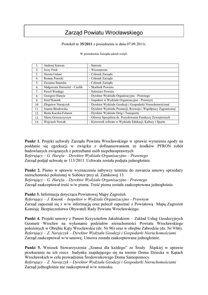 Zarząd Powiatu Wrocławskiego Protokół nr 35/2011 z posiedzenia w dniu 07.09.2011r. W posiedzeniu Zarządu udział wzięli: 1. 2. 3. 4. 5. 6. 7. 8. 9. 10. 11. 12. 13. 14. Andrzej Szawan Jerzy Fitek Dorota Galant Roman Potocki Zuzanna Smereka Małgorzata Dreiseitel - Cieślik Paweł Wardęga Grzegorz Haręża Józef Kmonk Zbigniew Narojczyk Joanna Brodowska Beata Kaczka-Folaron Marta Grzeszczyszyn Wojciech Nowak - Starosta - Wicestarosta - Członek Zarządu - Członek Zarządu - Członek Zarządu - Skarbnik Powiatu - Sekretarz Powiatu - Dyrektor Wydziału Organizacyjno - Prawnego - Inspektor w Wydziale Organizacyjno - Prawnym - Dyrektor Wydziału Geodezji i Gospodarki Nieruchomościami - Dyrektor Wydziału Promocji, Rozwoju i Współpracy Zagranicznej - Dyrektor Wydziału Dróg i Transportu - Główny Specjalista ds. Pozyskiwania Funduszy Zewnętrznych - Kierownik referatu w Wydziale Edukacji, Kultury i Sportu Punkt 1. Projekt uchwały Zarządu Powiatu Wrocławskiego w sprawie wyrażenia zgody na poddanie się egzekucji w związku z dofinansowaniem ze środków PFRON robót budowlanych związanych z potrzebami osób niepełnosprawnych Referujący – G. Haręża – Dyrektor Wydziału Organizacyjno – Prawnego Zarząd podjął uchwałę nr 113/2011. Uchwała została podjęta jednogłośnie. Punkt 2. Pismo w sprawie wyznaczenia nabywcy terminu do zawarcia umowy sprzedaży nieruchomości położonej w Sobótce przy ul. Zamkowej 13. Referujący – G. Haręża – Dyrektor Wydziału Organizacyjno - Prawnego Zarząd zaakceptował treść w/w pisma. Treść pisma została zaakceptowana jednogłośnie. Punkt 3. Informacja dotycząca Powiatowej Mapy Zagrożeń. Referujący – J. Kmonk – Inspektor w Wydziale Organizacyjno - Prawnym Zarząd zapoznał się z w/w informacją oraz polecił zapoznać z Powiatową Mapą Zagrożeń Komisję Bezpieczeństwa Obywateli Rady Powiatu Wrocławskiego. Punkt 4. Projekt umowy z Panem Krzysztofem Jakubiakiem – Zakład Usług Geodezyjnych Geometr Wrocław na wykonanie podziałów nieruchomości Powiatu Wrocławskiego położonych w Obrębie Kąty Wrocławskie (dz. Nr 96) oraz w obrębie Zabrodzie (dz. Nr 9/66). Referujący – Z. Narojczyk – Dyrektor Wydziału Geodezji i Gospodarki Nieruchomościami Zarząd zaakceptował w/w umowę. Umowa została zaakceptowana jednogłośnie. Punkt 5. Wniosek Stowarzyszenia „Szansa dla każdego” ze Środy Śląskiej w sprawie przekazania na ich rzecz budynku znajdującego się na terenie Domu Dziecka w Kątach Wrocławskich w celu prowadzenia Środowiskowego Domu Samopomocy. Referujący – Z. Narojczyk – Dyrektor Wydziału Geodezji i Gospodarki Nieruchomościami Zarząd jednogłośnie nie zaakceptował w/w wniosku. Punkt 6. Projekt umowy z Panem Krzysztofem Jakubiakiem – Zakład Usług Geodezyjnych Geometr Wrocław na wykonanie podziałów nieruchomości Powiatu Wrocławskiego położonej w Krzyżowicach – Wierzbicy – dz. nr 204 AM 1. Referujący – Z. Narojczyk – Dyrektor Wydziału Geodezji i Gospodarki Nieruchomościami Zarząd zaakceptował w/w umowę. Umowa została zaakceptowana jednogłośnie. Punkt 7. Projekt umowy przygotowany przez Wydział Dróg i Transportu Referujący - B. Kaczka-Folaron – Dyrektor Wydziału Dróg i Transportu Zarząd zaakceptował umowę: - Projekt umowy NR SP-DT.273.7.2011 z Firmą REMDRO S.A. Kamień ul. Granitowa 10 55-095 Mirków na roboty uzupełniające przewidziane w ogłoszeniu o zamówieniu dla zadania podstawowego, na realizację którego zawarto umowę podstawową nr SP.DT.3421.P1N-38/2011 w dniu 08.06.2011r.(Koszt brutto: 70.110,00 zł). Umowa została zaakceptowana jednogłośnie. Punkt 8. Projekt uchwały Zarządu Powiatu Wrocławskiego w sprawie wydania opinii w przedmiocie wyłączenia z ciągu drogi powiatowej nr 2020D nieruchomości położonej w obrębie Rakoszyce, gmina Środa Śląska Referujący - B. Kaczka-Folaron – Dyrektor Wydziału Dróg i Transportu Zarząd podjął uchwałę nr 114/2011. Uchwała została podjęta jednogłośnie. Punkt 9. Projekt uchwały Zarządu Powiatu Wrocławskiego w sprawie wydania opinii w przedmiocie wyłączenia z ciągu drogi powiatowej nr 2065D nieruchomości położonej w obrębie Lipnica, gmina Środa Śląska oraz wyłączenia z ciągu drogi powiatowej nr 2066D nieruchomości położonej w obrębie Chomiąża, gmina Malczyce Referujący - B. Kaczka-Folaron – Dyrektor Wydziału Dróg i Transportu Zarząd podjął uchwałę nr 115/2011. Uchwała została podjęta jednogłośnie. Punkt 10. Projekt uchwały Zarządu Powiatu Wrocławskiego w wydania opinii w przedmiocie zaliczenia części dotychczasowej drogi powiatowej nr 1960D położonej na terenie Gminy Kobierzyce do kategorii dróg gminnych Referujący - B. Kaczka-Folaron – Dyrektor Wydziału Dróg i Transportu Zarząd podjął uchwałę nr 116/2011. Uchwała została podjęta jednogłośnie. Punkt 11. Projekt uchwały Zarządu Powiatu Wrocławskiego w sprawie wydania opinii w przedmiocie pozbawienia drogi nr 2918D kategorii drogi powiatowej Referujący - B. Kaczka-Folaron – Dyrektor Wydziału Dróg i Transportu Zarząd podjął uchwałę nr 117/2011. Uchwała została podjęta jednogłośnie. Punkt 12. Projekty postanowień Zarządu Powiatu w sprawie uzgodnienia projektu decyzji o warunkach zabudowy Referujący - B. Kaczka-Folaron – Dyrektor Wydziału Dróg i Transportu Zarząd zaakceptował postanowienia: -SP-DT.672.35.1.2011.MN Postanowienie w sprawie uzgodnienia projektu decyzji o warunkach zabudowy dla inwestycji polegającej na przebudowie wejścia do budynku usługowego od strony podwórza (dobudowa ganku) na dz. nr 54, obręb Dobrzykowice, gmina Czernica. -SP-DT.672.36.1.2011.AM Postanowienie w sprawie uzgodnienia projektu decyzji o warunkach zabudowy dla inwestycji polegającej na dobudowie pomieszczeń mieszkalnych do istniejącego budynku mieszkalnego jednorodzinnego na dz. nr 367, obręb Chrząstawa Wielka, gmina Czernica. -SP-DT.672.37.1.2