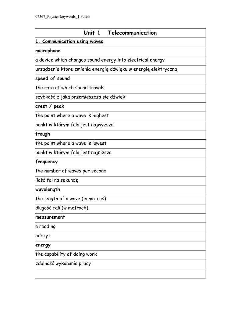 07367_Physics keywords_1.Polish Unit 1 Telecommunication 1. Communication using waves microphone a device which changes sound energy into electrical energy urządzenie które zmienia energię dźwięku w energię elektryczną speed of sound the rate at which sound travels szybkość z jaką przemieszcza się dźwięk crest / peak the point where a wave is highest punkt w którym fala jest najwyższa trough the point where a wave is lowest punkt w którym fala jest najniższa frequency the number of waves per second ilość fal na sekundę wavelength the length of a wave (in metres) długość fali (w metrach) measurement a reading odczyt energy the capability of doing work zdolność wykonania pracy 07367_Physics keywords_1.Polish instantaneously at a point in time zdarzający się w momencie w czasie mouthpiece the part of a telephone which is spoken into część telefonu do której się mówi earpiece the part of a telephone which is listened to część telefonu przez którą się słucha amplitude the maximum height of a wave (in metres) największa wysokość fali (w metrach) angle of incidence the angle between the 'normal' and the ray as it enters a medium kąt pomiędzy "normalną" i promieniem kiedy ten wchodzi w medium echo a wave which returns off a barrier to the transmitting source fala która powraca od przeszkody do źródła nadającego loudspeaker a device which changes electrical energy into sound energy urządzenie które zmienia energię elektryczną w energię dźwięku pitch a word which is used to indicate a frequency - particularly of sound słowo którego używa się do wskazania częstotliwości - szczególnie dźwiękowej 07367_Physics keywords_1.Polish signal usually a small electrical current which carries information zwykle mały prąd elektryczny który przesyła informacje 2. Communication using cables buzzer a small device which gives out sound energy małe urządzenie które wydaje energię dźwiękową oscilloscope a display screen which shows varying voltages ekran monitora który pokazuje zmieniające sie napięcie receiver a radio radio signal generator a device which gives out an alternating voltage at different frequencies urządzenie które wydaje naprzemienne napięcie w różnych częstotliwościach volume the size of an ouput signal (usually audio) objętość sygnału wyjściowego (zwykle dźwiękowa) angle of reflection the angle between the 'normal' and the ray as it reflects off a surface kąt pomiędzy "normalną" i promieniem gdy ten odbija się od powierzchni optical fibre a length of plastic material (round in cross-section) which can carry light odcinek tworzywa plastikowego (okrągłego w przekroju) która może przenosić światło 07367_Physics keywords_1.Polish Lab. Pack variable voltage supply zmienne zasilanie napięcia ray box a light source źródło światła refraction the deviation of a ray of light as it passes in/out of a material odchylenie promienia światła kiedy wnika/wydostaje się z tworzywa total internal reflection when light within a glass/plastic material bounces off an inside wall kiedy światło w tworzywie szklanym/plastikowym odbija się od ściany wewnętrznej critical angle the angle beyond which total internal reflection occurs, but below which external refraction occurs kąt poza którym występuje całkowite wewnętrzne odbicie ale poniżej którego występuje wewnętrzne załamanie światła density how heavy an object is relative to its volume jak ciężki jest przedmiot w stosunku do swojej wielkości link connection połączenie 07367_Physics keywords_1.Polish 3. Radio and Television transmitter sends out radio waves wysyła fale radiowe tuner a coil and a variable capacitor in parallel cewka i kondensator zmienny połączone równolegle amplifier a device which increases an electrical signal urządzenie które zwiększa sygnał elektryczny decoder a diode dioda aerial usually a length of wire which collects radio waves zwykle odcinek drutu który gromadzi fale radiowe modulation to change or 'shape' (a radio or TV wave) zmienić lub "nadać kształt" (fali radiowej lub telewizyjnej) leads 4mm electrical connectors 4mm-we złącza elektryczne electric charge basic unit of electricity / measured in Coulombs podstawowa jednostka elektryczności / mierzona w Coulombach 07367_Physics keywords_1.Polish cassette recorder tape recorder magnetofon metal foil aluminium 'kitchen foil' aluminiowa "folia kuchenna" resonant / resonance the frequency at which an object vibrates at maximum amplitude częstotliwość z jaką obiekt drga w największej amplitudzie variable output changeable signal sygnał zmienny resistor a device which restricts current urządzenie które ogranicza prąd coil / inductor many turns of copper wire wiele zwojów miedzianego drutu carrier wave a radio frequency signal on which an audio signal is transmitted sygnał częstotliwości radiowej na którym przesyłany jest sygnał dźwiękowy radio frequency a high frequency wysoka częstotliwość audio frequency a low frequency niska częstotliwość 07367_Physics keywords_1.Polish deflection deviation odchylenie fluorescent re-transmits light ponownie przesyła światło cathode ray tube the 'tube' of a TV "lampa" telewizyjna electron beam a flow of electrons through air/vacuum strumień elektronów przez powietrze/próżnię kinetic movement ruch vacuum a space in which there are no particles przestrzeń w której nie ma cząsteczek scan to move (usually one's eye) across a screen przesuwać się (zwykle swoim okiem) przez ekran image retention / persistence of vision the ability of the brain to 'join up' several still images to make a moving picture umiejętność "łączenia" przez mózg kilku nieruchomych obrazów tak aby powstał obraz ruchomy 07367_Physics keywords_1.Polish cyan turquoise/sea green colour kolor turkusowy/zieleń morska magenta pink/red colour kolor różowy/czerwony primary colour main colour kolor podstawowy seco