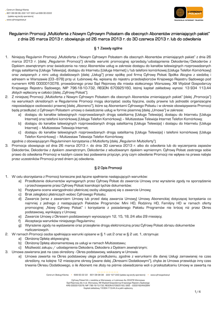 Centrum Obsługi Klienta 801 08 08 08, 222 127 222 lub 699 00 2222 (opłata wg taryfy operatora) www.cyfrowypolsat.pl Regulamin Promocji „Multioferta z Nowym Cyfrowym Polsatem dla obecnych Abonentów zmieniających pakiet” z dnia 26 marca 2013 r. obowiązuje od 26 marca 2013 r. do 30 czerwca 2013 r. lub do odwołania § 1 Zasady ogólne 1. Niniejszy Regulamin Promocji „Multioferta z Nowym Cyfrowym Polsatem dla obecnych Abonentów zmieniających pakiet” z dnia 26 marca 2013 r. (dalej „Regulamin Promocji”) określa warunki promocyjnej sprzedaży/udostępnienia Dekoderów/Dekoderów z Dyskiem zewnętrznym oraz świadczenia na rzecz Abonentów usług w zakresie dostępu do kanałów telewizyjnych rozprowadzanych drogą satelitarną (Usługa Telewizja), dostępu do Internetu (Usługa Internet) i/lub telefonii komórkowej (Usługa Telefon Komórkowy) oraz związanych z nimi usług dodatkowych (dalej „Usługi”) przez spółkę pod firmą Cyfrowy Polsat Spółka Akcyjna z siedzibą i adresem w Warszawie (03–878) przy ul. Łubinowej 4a, wpisaną do rejestru przedsiębiorców Krajowego Rejestru Sądowego pod numerem KRS 0000010078, prowadzonego przez Sąd Rejonowy dla miasta stołecznego Warszawy, XIII Wydział Gospodarczy Krajowego Rejestru Sądowego, NIP 796-18-10-732, REGON 670925160, której kapitał zakładowy wynosi: 13 934 113,44 złotych wpłacony w całości (dalej „Cyfrowy Polsat”). 2. Z niniejszej Promocji „Multioferta z Nowym Cyfrowym Polsatem dla obecnych Abonentów zmieniających pakiet” (dalej „Promocja”) na warunkach określonych w Regulaminie Promocji mogą skorzystać osoby fizyczne, osoby prawne lub jednostki organizacyjne nieposiadające osobowości prawnej (dalej „Abonenci”), które są Abonentami Cyfrowego Polsatu i w okresie obowiązywania Promocji będą przedłużać z Cyfrowym Polsatem umowy o świadczenie usług w formie pisemnej (dalej „Umowa”) w zakresie: a) dostępu do kanałów telewizyjnych rozprowadzanych drogą satelitarną (Usługa Telewizja), dostępu do Internetu (Usługa Internet) oraz telefonii komórkowej (Usługa Telefon Komórkowy) – Multizestaw Telewizja Internet Telefon Komórkowy; b) dostępu do kanałów telewizyjnych rozprowadzanych drogą satelitarną (Usługa Telewizja) i dostępu do Internetu (Usługa Internet) – Multizestaw Telewizja Internet; c) dostępu do kanałów telewizyjnych rozprowadzanych drogą satelitarną (Usługa Telewizja) i telefonii komórkowej (Usługa Telefon Komórkowy) – Multizestaw Telewizja Telefon Komórkowy; zgodnie z obowiązującym Regulaminem korzystania z Multioferty (dalej „Regulamin Multioferty”). 3. Promocja obowiązuje od dnia 26 marca 2013 r. do dnia 30 czerwca 2013 r. albo do odwołania lub do wyczerpania zapasów Dekoderów, Dekoderów z dyskiem zewnętrznym, Dekoderów z wbudowanym dyskiem wymiennym. Cyfrowy Polsat zastrzega sobie prawo do odwołania Promocji w każdym czasie bez podawania przyczyn, przy czym odwołanie Promocji nie wpływa na prawa nabyte przez uczestników Promocji przed dniem jej odwołania. § 2 Opis Promocji 1. W celu skorzystania z Promocji konieczne jest łączne spełnienie następujących warunków: a) Przedłożenie dokumentów wymaganych przez Cyfrowy Polsat do zawarcia Umowy oraz wyrażenie zgody na sporządzenie i przechowywanie przez Cyfrowy Polsat kserokopii tychże dokumentów; b) Pozytywna ocena wiarygodności płatniczej osoby ubiegającej się o zawarcie Umowy; c) Brak zaległości płatniczych wobec Cyfrowego Polsatu; d) Zawarcie (wraz z zawarciem Umowy lub przed datą zawarcia Umowy) Umowy Abonenckiej dotyczącej korzystania co najmniej z jednego z następujących Pakietów Programów: Mini HD, Rodzinny HD, Familijny HD w ramach oferty promocyjnej „Nowy Cyfrowy Polsat” i korzystanie z posiadanego Pakietu Programów nie krócej niż przez Okres podstawowy, wynikający z Umowy; e) Zawarcie Umowy z Okresem podstawowym wynoszącym 12, 15, 18, 24 albo 29 miesięcy; f) Akceptacja warunków niniejszego Regulaminu; g) Wyrażenie zgody na wystawianie oraz przesyłanie drogą elektroniczną przez Cyfrowy Polsat obrazu dokumentów rozliczeniowych. 2. W ramach Promocji osoba spełniająca warunki opisane w § 1 ust 2 oraz w § 2 ust. 1, otrzymuje: a) Obniżoną Opłatę aktywacyjną; b) Obniżoną Opłatę abonamentową za usługi w ramach Multizestawu; c) Możliwość zakupu / udostępnienia Dekodera, Dekodera z Dyskiem zewnętrznym; 3. Umowa zawierana jest na czas określony - Okres podstawowy, wskazany w Umowie. a) Umowa zawarta na Okres podstawowy ulega przedłużeniu, zgodnie z warunkami dla danej Usługi zamawianej na czas określony, na kolejne 12 miesięczne okresy (zwane dalej „Okresami Dodatkowymi”), chyba że Umowa przewiduje inny czas trwania Okresu Dodatkowego, o ile Abonent nie złoży na piśmie oświadczenia woli o przekształceniu Umowy w zawartą na Centrum Obsługi Klienta • 699 00 22 22 801 08 08 08 222 127 222 (opłata wg taryfy operatora) • www.cyfrowypolsat.pl Cyfrowy Polsat S.A. z siedzibą w Warszawie, ul. Łubinowa 4a, 03-878 Warszawa Sąd Rejonowy dla m.st. Warszawy, XIII Wydział Gospodarczy Krajowego Rejestru Sądowego KRS 0000010078, NIP 796-18-10-732, REGON 670925160, GIOŚ – E0001824WZBW Kapitał zakładowy 13.934.113,44 zł w pełni wpłacony 1/4 Centrum Obsługi Klienta 801 08 08 08, 222 127 222 lub 699 00 2222 (opłata wg taryfy operatora) www.cyfrowypolsat.pl b) czas nieokreślony co najmniej na jeden Okres Rozliczeniowy przed upływem terminu obowiązywania Okresu podstawowego lub danego Okresu Dodatkowego; Nie później niż na trzy Okresy rozliczeniowe przed upływem Okresu podstawowego (lub odpowiednio danego Okresu Dodatkowego), Abonent jest uprawniony do złożenia oświadczenia na piśmie, iż wyraża wolę, aby Umowa wygasła z ostatnim dniem Okresu podstawowego (lub odpowiednio danego Okresu Dodatkowego). § 3 Szczegóły Promocji 1. W ramach Promocji, Abonent, który korzystał z 