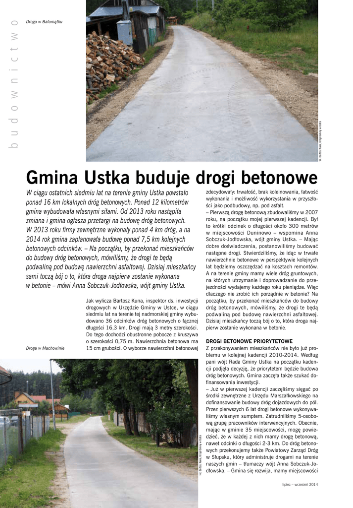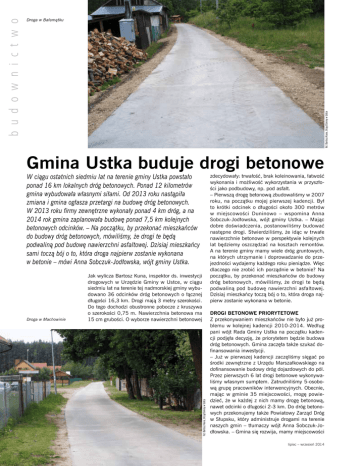 fot. Bartosz Kuna, Urząd Gminy w Ustce b u d o w n i c t w o Droga w Bałamątku Gmina Ustka buduje drogi betonowe W ciągu ostatnich siedmiu lat na terenie gminy Ustka powstało ponad 16 km lokalnych dróg betonowych. Ponad 12 kilometrów gmina wybudowała własnymi siłami. Od 2013 roku nastąpiła zmiana i gmina ogłasza przetargi na budowę dróg betonowych. W 2013 roku firmy zewnętrzne wykonały ponad 4 km dróg, a na 2014 rok gmina zaplanowała budowę ponad 7,5 km kolejnych betonowych odcinków. – Na początku, by przekonać mieszkańców do budowy dróg betonowych, mówiliśmy, że drogi te będą podwaliną pod budowę nawierzchni asfaltowej. Dzisiaj mieszkańcy sami toczą bój o to, która droga najpierw zostanie wykonana w betonie – mówi Anna Sobczuk-Jodłowska, wójt gminy Ustka. 42 Jak wylicza Bartosz Kuna, inspektor ds. inwestycji drogowych w Urzędzie Gminy w Ustce, w ciągu siedmiu lat na terenie tej nadmorskiej gminy wybudowano 36 odcinków dróg betonowych o łącznej długości 16,3 km. Drogi mają 3 metry szerokości. Do tego dochodzi obustronne pobocze z kruszywa o szerokości 0,75 m. Nawierzchnia betonowa ma 15 cm grubości. O wyborze nawierzchni betonowej fot. Bartosz Kuna, Urząd Gminy w Ustce Droga w Machowinie zdecydowały: trwałość, brak koleinowania, łatwość wykonania i możliwość wykorzystania w przyszłości jako podbudowy, np. pod asfalt. – Pierwszą drogę betonową zbudowaliśmy w 2007 roku, na początku mojej pierwszej kadencji. Był to krótki odcinek o długości około 300 metrów w miejscowości Duninowo – wspomina Anna Sobczuk-Jodłowska, wójt gminy Ustka. – Mając dobre doświadczenia, postanowiliśmy budować następne drogi. Stwierdziliśmy, że idąc w trwałe nawierzchnie betonowe w perspektywie kolejnych lat będziemy oszczędzać na kosztach remontów. A na terenie gminy mamy wiele dróg gruntowych, na których utrzymanie i doprowadzanie do przejezdności wydajemy każdego roku pieniądze. Więc dlaczego nie zrobić ich porządnie w betonie? Na początku, by przekonać mieszkańców do budowy dróg betonowych, mówiliśmy, że drogi te będą podwaliną pod budowę nawierzchni asfaltowej. Dzisiaj mieszkańcy toczą bój o to, która droga najpierw zostanie wykonana w betonie. DROGI BETONOWE PRIORYTETOWE Z przekonywaniem mieszkańców nie było już problemu w kolejnej kadencji 2010-2014. Według pani wójt Rada Gminy Ustka na początku kadencji podjęła decyzję, że priorytetem będzie budowa dróg betonowych. Gmina zaczęła także szukać dofinansowania inwestycji. – Już w pierwszej kadencji zaczęliśmy sięgać po środki zewnętrzne z Urzędu Marszałkowskiego na dofinansowanie budowy dróg dojazdowych do pól. Przez pierwszych 6 lat drogi betonowe wykonywaliśmy własnym sumptem. Zatrudniliśmy 5-osobową grupę pracowników interwencyjnych. Obecnie, mając w gminie 35 miejscowości, mogę powiedzieć, że w każdej z nich mamy drogę betonową, nawet odcinki o długości 2-3 km. Do dróg betonowych przekonujemy także Powiatowy Zarząd Dróg w Słupsku, który administruje drogami na terenie naszych gmin – tłumaczy wójt Anna Sobczuk-Jodłowska. – Gmina się rozwija, mamy miejscowości lipiec – wrzesień 2014 fot. Bartosz Kuna, Urząd Gminy w Ustce fot. Bartosz Kuna, Urząd Gminy w Ustce Droga w Wytownie TERAZ LEPIEJ OGŁOSIĆ PRZETARG W 2013 roku przyszedł czas na zmiany. Pani wójt uważa, że technologia budowy dróg betonowych na tyle się zmieniła, a ceny wykonawstwa zmalały, że gmina mogła przejść na zlecanie budowy dróg betonowych firmom zewnętrznym. – Gdy realizowaliśmy drogi sami, to było korzystne cenowo, ale wymagało ogromnej pracy biurokratycznej. Na zakup każdej części składowej – kruszywa, piasku, betonu i na zakup usług trzeba było ogłaszać przetarg. To bardzo uciążliwe. Beton kupowaliśmy z betoniarni zlokalizowanych w okolicach Słupska. Najpierw był to beton B20, a potem B25. Gminną ekipę wyposażaliśmy w coraz to nowszy sprzęt. Mieli listwę wibracyjną. Najpierw w dylatacje kładli deski, a potem zakupiliśmy piłę, którą nacinali szczeliny. Nie będziemy inwestować w zakup ciężkiego sprzętu, którym dysponują np. wykonawcy dróg z betonu wałowanego. Lepiej usługę zamówić na zewnątrz. Pani wójt dodaje, że na 2014 rok gmina rozpisała przetargi na budowę ponad 7,5 km kilometra dróg betonowych. Najdłuższe odcinki to Starkowo – Możdżanowo – 2500 metrów długości i droga w miejscowości Machowino Kolonia Leśna o długości 1850 metrów. Nowe drogi betonowe pojawią się także w miejscowościach: Charnowo, Wytowno, Machowinko, Przewłoka i Wodnica. Piotr Piestrzyński fot. Bartosz Kuna, Urząd Gminy w Ustce turystyczne, które się rozbudowują i potrzebują dobrych dróg. Mamy także poniemieckie drogi z kamienia, które wymagają remontu. Mieszkańcy korzystający z tych dróg także chcą, by im budować drogi betonowe. Każdego roku robimy przegląd wykonanych wcześniej dróg. Anna Sobczuk-Jodłowska, wójt gminy Ustka fot. Bartosz Kuna, Urząd Gminy w Ustce Powyżej: droga w miejscowości Objazda. Obok: droga w miejscowości Zaleskie-Zabłocie 43 budownictwo • technologie • architektura
