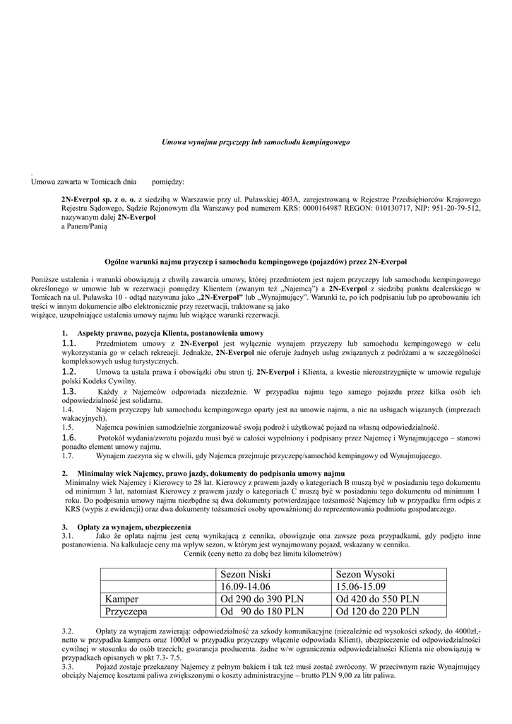 Umowa wynajmu przyczepy lub samochodu kempingowego . Umowa zawarta w Tomicach dnia pomiędzy: 2N-Everpol sp. z o. o. z siedzibą w Warszawie przy ul. Puławskiej 403A, zarejestrowaną w Rejestrze Przedsiębiorców Krajowego Rejestru Sądowego, Sądzie Rejonowym dla Warszawy pod numerem KRS: 0000164987 REGON: 010130717, NIP: 951-20-79-512, nazywanym dalej 2N-Everpol a Panem/Panią Ogólne warunki najmu przyczep i samochodu kempingowego (pojazdów) przez 2N-Everpol Poniższe ustalenia i warunki obowiązują z chwilą zawarcia umowy, której przedmiotem jest najem przyczepy lub samochodu kempingowego określonego w umowie lub w rezerwacji pomiędzy Klientem (zwanym też „Najemcą”) a 2N-Everpol z siedzibą punktu dealerskiego w Tomicach na ul. Puławska 10 - odtąd nazywana jako „2N-Everpol” lub „Wynajmujący”. Warunki te, po ich podpisaniu lub po aprobowaniu ich treści w innym dokumencie albo elektronicznie przy rezerwacji, traktowane są jako wiążące, uzupełniające ustalenia umowy najmu lub wiążące warunki rezerwacji. 1. Aspekty prawne, pozycja Klienta, postanowienia umowy Przedmiotem umowy z 2N-Everpol jest wyłącznie wynajem przyczepy lub samochodu kempingowego w celu wykorzystania go w celach rekreacji. Jednakże, 2N-Everpol nie oferuje żadnych usług związanych z podróżami a w szczególności kompleksowych usług turystycznych. 1.2. Umowa ta ustala prawa i obowiązki obu stron tj. 2N-Everpol i Klienta, a kwestie nierozstrzygnięte w umowie reguluje polski Kodeks Cywilny. 1.3. Każdy z Najemców odpowiada niezależnie. W przypadku najmu tego samego pojazdu przez kilka osób ich odpowiedzialność jest solidarna. 1.4. Najem przyczepy lub samochodu kempingowego oparty jest na umowie najmu, a nie na usługach wiązanych (imprezach wakacyjnych). 1.5. Najemca powinien samodzielnie zorganizować swoją podroż i użytkować pojazd na własną odpowiedzialność. 1.6. Protokół wydania/zwrotu pojazdu musi być w całości wypełniony i podpisany przez Najemcę i Wynajmującego – stanowi ponadto element umowy najmu. 1.7. Wynajem zaczyna się w chwili, gdy Najemca przejmuje przyczepę/samochód kempingowy od Wynajmującego. 1.1. 2. Minimalny wiek Najemcy, prawo jazdy, dokumenty do podpisania umowy najmu Minimalny wiek Najemcy i Kierowcy to 28 lat. Kierowcy z prawem jazdy o kategoriach B muszą być w posiadaniu tego dokumentu od minimum 3 lat, natomiast Kierowcy z prawem jazdy o kategoriach C muszą być w posiadaniu tego dokumentu od minimum 1 roku. Do podpisania umowy najmu niezbędne są dwa dokumenty potwierdzające tożsamość Najemcy lub w przypadku firm odpis z KRS (wypis z ewidencji) oraz dwa dokumenty tożsamości osoby upoważnionej do reprezentowania podmiotu gospodarczego. 3. Opłaty za wynajem, ubezpieczenia 3.1. Jako że opłata najmu jest ceną wynikającą z cennika, obowiązuje ona zawsze poza przypadkami, gdy podjęto inne postanowienia. Na kalkulacje ceny ma wpływ sezon, w którym jest wynajmowany pojazd, wskazany w cenniku. Cennik (ceny netto za dobę bez limitu kilometrów) Kamper Przyczepa Sezon Niski 16.09-14.06 Od 290 do 390 PLN Od 90 do 180 PLN Sezon Wysoki 15.06-15.09 Od 420 do 550 PLN Od 120 do 220 PLN 3.2. Opłaty za wynajem zawierają: odpowiedzialność za szkody komunikacyjne (niezależnie od wysokości szkody, do 4000zł,netto w przypadku kampera oraz 1000zł w przypadku przyczepy włącznie odpowiada Klient), ubezpieczenie od odpowiedzialności cywilnej w stosunku do osób trzecich; gwarancja producenta. żadne w/w ograniczenia odpowiedzialności Klienta nie obowiązują w przypadkach opisanych w pkt 7.3- 7.5. 3.3. Pojazd zostaje przekazany Najemcy z pełnym bakiem i tak też musi zostać zwrócony. W przeciwnym razie Wynajmujący obciąży Najemcę kosztami paliwa zwiększonymi o koszty administracyjne – brutto PLN 9,00 za litr paliwa. 3.4. Opłata dzienna najmu zostaje naliczona za każde rozpoczęte 24h. Jeśli pojazd zostanie zwrócony po wygaśnięciu zawartej umowy pobieramy PLN 50,- netto za każdą rozpoczętą godzinę (maksymalna kwota może przekroczyć całkowitą opłatę dzienną). W przypadku uzyskania zgody 2N-Everpol na przedłużenie terminu najmu, naliczona zostanie opłata zgodnie z cennikiem. Wynajmujący nie wyraża automatycznej zgody na przedłużenie terminu najmu. 3.5. Ponieważ umowa najmu zawarta jest na czas określony, nawet jeśli pojazd zostanie zwrócony przed wygaśnięciem terminu zawartego w umowie opłata za najem pojazdu musi być zapłacona w całości za cały okres najmu określony w umowie, chyba, że ewentualność wcześniejszego rozwiązania umowy przez Najemcę została ujęta w umowie. Minimalny czas najmu pojazdu to 7-dni, – wszelkie odstępstwa muszą być zapisane w umowie. 4. Rezerwacja (zawarcie umowy), przedmiot usługi Klient dokonując rezerwacji zobowiązuje się do zawarcia umowy najmu w oparciu o poniższe warunki i specyfikację usług zawartych w umowie najmu. Rezerwacja traktowana jest jak zamówienie Klienta, wiążące 2N-Everpol dopiero po jej potwierdzeniu na piśmie pod rygorem nieważności w terminie 7 dni od daty otrzymania rezerwacji, nie później niż na 3 dni przed datą wydania samochodu określoną w rezerwacji. żadna inna forma potwierdzenia nie obowiązuje. 4.1. W przypadku dokonywania rezerwacji w sposób elektroniczny (przez e-mail lub Internet ) Wynajmujący powinien potwierdzić Klientowi otrzymanie rezerwacji niezwłocznie w sposób elektroniczny. Potwierdzenie otrzymania rezerwacji przekazane elektronicznie oznacza wpisanie Klienta na listę zainteresowanych najmem i nie jest jednoznaczne z potwierdzeniem rezerwacji (zawarciem umowy) i nie uprawnia Klienta do roszczenia praw związanych z zawarciem umowy. 4.2. Umowa najmu musi być pod rygorem nieważności zawarta w formie pisemnej (też pisemna rezerwacja potwierdzona pisemnie przez 2N-Everpol) lub w drodze pisemnego potwierdzenia wydanego przez 2N-Everpol dla Klienta - w przypadku rezerwacji 