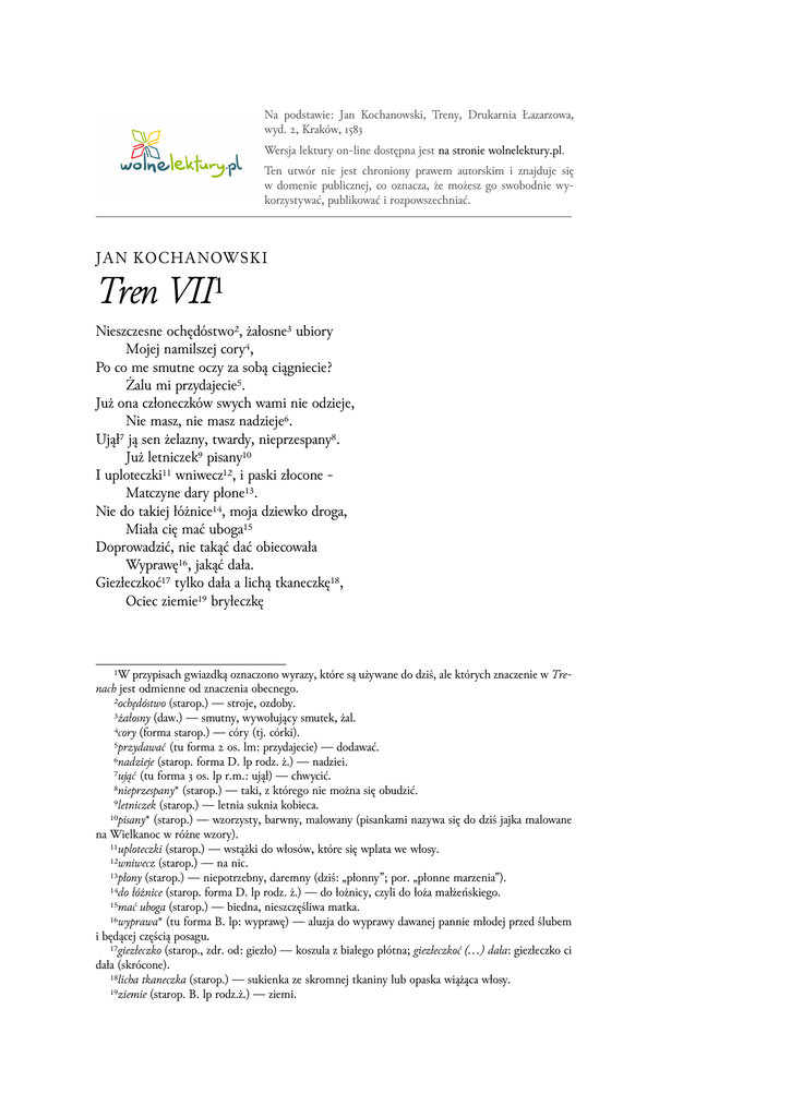 Na podstawie: Jan Kochanowski, Treny, Drukarnia Łazarzowa, wyd. , Kraków, Wersja lektury on-line dostępna jest na stronie wolnelektury.pl. Ten utwór nie jest chroniony prawem autorskim i znajduje się w domenie publicznej, co oznacza, że możesz go swobodnie wykorzystywać, publikować i rozpowszechniać. JAN KOCHANOWSKI Tren VII¹ Nieszczesne ochędóstwo², żałosne³ ubiory Mojej namilszej cory⁴, Po co me smutne oczy za sobą ciągniecie? Żalu mi przydajecie⁵. Już ona członeczków swych wami nie odzieje, Nie masz, nie masz nadzieje⁶. Ujął⁷ ją sen żelazny, twardy, nieprzespany⁸. Już letniczek⁹ pisany¹⁰ I uploteczki¹¹ wniwecz¹², i paski złocone Matczyne dary płone¹³. Nie do takiej łóżnice¹⁴, moja dziewko droga, Miała cię mać uboga¹⁵ Doprowadzić, nie takąć dać obiecowała Wyprawę¹⁶, jakąć dała. Giezłeczkoć¹⁷ tylko dała a lichą tkaneczkę¹⁸, Ociec ziemie¹⁹ bryłeczkę ¹W przypisach gwiazdką oznaczono wyrazy, które są używane do dziś, ale których znaczenie w Tre jest odmienne od znaczenia obecnego. ² (starop.) — stroje, ozdoby. ³ n (daw.) — smutny, wywołujący smutek, żal. ⁴ r (forma starop.) — córy (tj. córki). ⁵ r (tu forma os. lm: przydajecie) — dodawać. ⁶n e e (starop. forma D. lp rodz. ż.) — nadziei. ⁷ (tu forma os. lp r.m.: ujął) — chwycić. ⁸n e r e n * (starop.) — taki, z którego nie można się obudzić. ⁹ e n e (starop.) — letnia suknia kobieca. ¹⁰ n * (starop.) — wzorzysty, barwny, malowany (pisankami nazywa się do dziś jajka malowane na Wielkanoc w różne wzory). ¹¹ e (starop.) — wstążki do włosów, które się wplata we włosy. ¹² n e (starop.) — na nic. ¹³ n (starop.) — niepotrzebny, daremny (dziś: „płonny”; por. „płonne marzenia”). ¹⁴ n e (starop. forma D. lp rodz. ż.) — do łożnicy, czyli do łoża małżeńskiego. (starop.) — biedna, nieszczęśliwa matka. ¹⁵ ¹⁶ r * (tu forma B. lp: wyprawę) — aluzja do wyprawy dawanej pannie młodej przed ślubem i będącej częścią posagu. (starop., zdr. od: giezło) — koszula z białego płótna; e e : giezłeczko ci ¹⁷ e e dała (skrócone). ne (starop.) — sukienka ze skromnej tkaniny lub opaska wiążąca włosy. ¹⁸ ¹⁹ e e (starop. B. lp rodz.ż.) — ziemi. n W główki²⁰ włożył. Niestetyż, i posag i ona W jednej skrzynce²¹ zamkniona²². ²⁰ — w miejsce, gdzie spoczywa głowa. ²¹ e ne r n e — „skrzynka” oznacza tu jednocześnie trumnę, a także przedmiot, w którym chowano rzeczy cenne, pieniądze, klejnoty, kosztowną odzież. n n (starop.) — zamknięta. ²² Tren VII