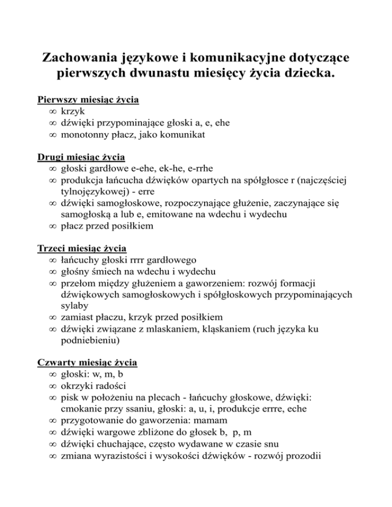 Zachowania językowe i komunikacyjne dotyczące pierwszych dwunastu miesięcy życia dziecka. Pierwszy miesiąc życia • krzyk • dźwięki przypominające głoski a, e, ehe • monotonny płacz, jako komunikat Drugi miesiąc życia • głoski gardłowe e-ehe, ek-he, e-rrhe • produkcja łańcucha dźwięków opartych na spółgłosce r (najczęściej tylnojęzykowej) - erre • dźwięki samogłoskowe, rozpoczynające głużenie, zaczynające się samogłoską a lub e, emitowane na wdechu i wydechu • płacz przed posiłkiem Trzeci miesiąc życia • łańcuchy głoski rrrr gardłowego • głośny śmiech na wdechu i wydechu • przełom między głużeniem a gaworzeniem: rozwój formacji dźwiękowych samogłoskowych i spółgłoskowych przypominających sylaby • zamiast płaczu, krzyk przed posiłkiem • dźwięki związane z mlaskaniem, kląskaniem (ruch języka ku podniebieniu) Czwarty miesiąc życia • głoski: w, m, b • okrzyki radości • pisk w położeniu na plecach - łańcuchy głoskowe, dźwięki: cmokanie przy ssaniu, głoski: a, u, i, produkcje errre, eche • przygotowanie do gaworzenia: mamam • dźwięki wargowe zbliżone do głosek b, p, m • dźwięki chuchające, często wydawane w czasie snu • zmiana wyrazistości i wysokości dźwięków - rozwój prozodii Piąty miesiąc życia • opanowane dotychczas dźwięki ćwiczone są w różnych kombinacjach i ciągach sylabowych • śmiech i pisk w położeniu na plecach - łańcuchy głoskowe, dźwięki: cmokanie przy ssaniu, głoski a, u, i, produkcje: errre, eche • zróżnicowane gaworzenie w nowych kontekstach sytuacyjnych • wykrzyknienia (całe łańcuchy) • głośny śmiech • dźwięki złości bez łez połączone ze zmianą mimiki twarzy, używanie płaczu do wyrażania złości • produkcje sylab z separowaniem sylaby z łańcucha: ma-ma , ba-ba Szósty miesiąc życia • gaworzenie: wyraźne, rytmiczne łańcuchy sylabowe • dźwięki p, g • dźwięk związany z negacją – „ne” Siódmy miesiąc życia • poszerzenie się repertuaru w gaworzeniu - zróżnicowanie dźwięków wargowych m, w • wykrzyknienia • produkcja szeptu i zmiana wyposażenia prozodycznego w postaci różnicowania wysokości dźwięku • krzyk w sytuacji głodu • sygnał – „nie” jest już zrozumiały dla otoczenia Ósmy miesiąc życia • dialog inicjowany przez dziecko(dziecko gaworzy, by zwrócić uwagę dorosłego) • wyraźne dźwięki żądania • głoski: p, b, łańcuchy sylabowe: ga-ga-ga, ta-ta-ta, wyrażanie się głośno-cicho, wyrażane są emocje – „dźwięki złości” • szeptanie Dziewiąty miesiąc życia • imitacja dźwięków z otoczenia – onomatopeje • autoimitacja • dalsza separacja sylab, np. da da • pierwsze spontaniczne słowa z bardzo wyrazistym rytmem • neologizmy - własne słowa i sylaby znaczące • wykorzystanie w komunikacji gestu wskazywania palcem Dziesiąty miesiąc życia • eksperymentowanie z dźwiękami, sprawdzanie jakie dźwięki wydają przedmioty (np. w wyniku stukania łyżeczką o kubek) • naśladowanie dźwięków, zmiana akcentu i wysokości dźwięku, częste powtarzanie dźwięków, tworzenie kombinacji sylabowych • głoski wargowe • zabawne ruchy językiem • dźwięki wołania • szukanie znajomej osoby lub przedmiotu „Gdzie jest mama?”, „Gdzie jest lala?” Jedenasty miesiąc życia • eksperymentowanie z dźwiękami, sprawdzanie jakie dźwięki wydają przedmioty • naśladowanie dźwięków, zmiana akcentu i wysokości dźwięków, częste powtarzanie dźwięków, kombinacje sylabowe, np. tatata, dadada • głoski wargowe • zabawne ruchy językiem • dźwięki wołania • reagowanie na zakazy - nie/nie wolno Dwunasty miesiąc życia • wymawianie dłuższych łańcuchów sylabowych: tatata, dadada, mamama, gegege • łączenie dwóch sylab • dźwięki wołania • szukanie znajomej osoby lub przedmiotu • reagowanie na zakazy, wyrażanie sprzeciwu słowem „nie” lub kręceniem głowy • wymawianie pierwszych sylab o sensownym znaczeniu, np. „am” (jeść) • pierwsze proste słowa • kojarzenie najbliższych osób z otoczenia; dziecko wie kogo • • • • • • • oznaczają słowa: „mama”, „tata” używanie słów „mama”, „tata” wydawanie dźwięków związanych z ruchem, np. „bum” wykonywanie prostych poleceń typu „podaj lalę” lub „pokaż piłkę”(w odniesieniu do znanych przedmiotów) uczestniczenie w zabawach z dorosłymi typu „a ku-ku” lub „kosikosi łapci” adekwatne do sytuacji wykonywanie gestu pożegnania: pa-pa pokazywanie palcem kilku przedmiotów nazywanych przez dorosłą osobę szukanie znajomej osoby lub przedmiotu poprzez odwracanie głowy mgr Elżbieta Jarząbkowska logopeda