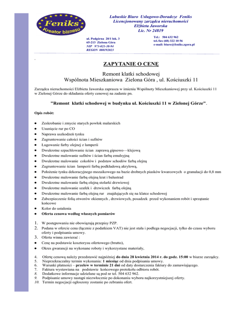 Lubuskie Biuro Usługowo-Doradcze Feniks Licencjonowany zarządca nieruchomości Elżbieta Jaworska Lic. Nr 24819 ul. Podgórna 20/1 lok. 3 65-213 Zielona Góra NIP 973-021-38-94 REGON 080192023 Tel.: 504 632 962 tel./fax (68) 322 10 56 e-mail: [email protected] . ZAPYTANIE O CENĘ Remont klatki schodowej Wspólnota Mieszkaniowa Zielona Góra , ul. Kościuszki 11 Zarządca nieruchomości Elżbieta Jaworska zaprasza w imieniu Wspólnoty Mieszkaniowej przy ul. Kościuszki 11 w Zielonej Górze do składania oferty cenowej na zadanie pn. "Remont klatki schodowej w budynku ul. Kościuszki 11 w Zielonej Górze". Opis robót: Zeskrobanie i zmycie starych powłok malarskich Usunięcie rur po CO Naprawa uszkodzeń tynku Zagruntowanie całości ścian i sufitów Ługowanie farby olejnej z lamperii Dwukrotne szpachlowanie ścian zaprawą gipsowo—klejową Dwukrotne malowanie sufitów i ścian farbą emulsyjną Dwukrotne malowanie cokołów i podstaw schodów farbą olejną Zagruntowanie ścian lamperii farbą podkładową akrylową, Położenie tynku dekoracyjnego mozaikowego na bazie drobnych piasków kwarcowych o granulacji do 0,8 mm Dwukrotne malowanie farbą olejną krat i balustrad Dwukrotne malowanie farbą olejną stolarki drzwiowej Dwukrotne malowanie szafek i drzwiczek farbą olejną Dwukrotne malowanie farbą olejną rur znajdujących się na klatce schodowej Zabezpieczenie folią otworów okiennych , drzwiowych, posadzek przed wykonaniem robót i sprzątanie końcowe Kolor do ustalenia Oferta cenowa według własnych pomiarów 1. W postępowaniu nie obowiązują przepisy PZP. 2. Podana w ofercie cena (łącznie z podatkiem VAT) nie jest stała i podlega negocjacji, tylko do czasu wyboru oferty i podpisania umowy. 3. Oferta winna zawierać : Cenę na podstawie kosztorysu ofertowego (brutto), Okres gwarancji na wykonane roboty i wykorzystane materiały, 4. 5. 6. 7. 8. 9. 10. Ofertę cenową należy przedstawić najpóźniej do dnia 28 kwietnia 2014 r. do godz. 15:00 w biurze zarządcy. Nieprzekraczalny termin wykonania: 1 miesiąc od dnia podpisania umowy. Warunki płatności – przelew w terminie 21 dni od daty dostarczenia faktury do zamawiającego. Faktura wystawiana na podstawie końcowego protokołu odbioru robót. Dodatkowe informacje udzielane są pod nr tel. 504 632 962. Podpisanie umowy nastąpi niezwłocznie po dokonaniu wyboru najkorzystniejszej oferty. Termin negocjacji ogłoszony zostanie po zebraniu ofert.