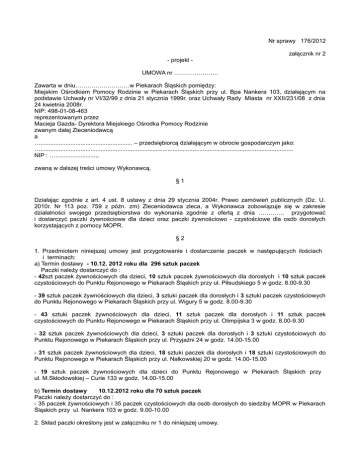 Nr sprawy 176/2012 załącznik nr 2 - projekt UMOWA nr …………………. Zawarta w dniu………………………w Piekarach Śląskich pomiędzy: Miejskim Ośrodkiem Pomocy Rodzinie w Piekarach Śląskich przy ul. Bpa Nankera 103, działającym na podstawie Uchwały nr VI/32/99 z dnia 21 stycznia 1999r. oraz Uchwały Rady Miasta nr XXII/231/08 z dnia 24 kwietnia 2008r. NIP: 498-01-08-463 reprezentowanym przez Macieja Gazda- Dyrektora Miejskiego Ośrodka Pomocy Rodzinie zwanym dalej Zleceniodawcą a …....................................................... – przedsiębiorcą działającym w obrocie gospodarczym jako: …....................................................................................................................................................... NIP : …........................., zwaną w dalszej treści umowy Wykonawcą. §1 Działając zgodnie z art. 4 ust. 8 ustawy z dnia 29 stycznia 2004r. Prawo zamówień publicznych (Dz. U. 2010r. Nr 113 poz. 759 z późn. zm) Zleceniodawca zleca, a Wykonawca zobowiązuje się w zakresie działalności swojego przedsiębiorstwa do wykonania zgodnie z ofertą z dnia …………. przygotować i dostarczyć paczki żywnościowe dla dzieci oraz paczki żywnościowo - czystościowe dla osób dorosłych korzystających z pomocy MOPR. §2 1. Przedmiotem niniejszej umowy jest przygotowanie i dostarczenie paczek w następujących ilościach i terminach: a) Termin dostawy - 10.12. 2012 roku dla 296 sztuk paczek Paczki należy dostarczyć do : - 42szt paczek żywnościowych dla dzieci, 10 sztuk paczek żywnościowych dla dorosłych i 10 sztuk paczek czystościowych do Punktu Rejonowego w Piekarach Śląskich przy ul. Piłsudskiego 5 w godz. 8.00-9.30 - 39 sztuk paczek żywnościowych dla dzieci, 3 sztuki paczek dla dorosłych i 3 sztuki paczek czystościowych do Punktu Rejonowego w Piekarach Śląskich przy ul. Wigury 5 w godz. 8.00-9.30 - 43 sztuki paczek żywnościowych dla dzieci, 11 sztuk paczek dla dorosłych i 11 sztuk paczek czystościowych do Punktu Rejonowego w Piekarach Śląskich przy ul. Olimpijska 3 w godz. 8.00-9.30 - 32 sztuk paczek żywnościowych dla dzieci, 3 sztuki paczek dla dorosłych i 3 sztuki czystościowych do Punktu Rejonowego w Piekarach Śląskich przy ul. Przyjaźni 24 w godz. 14.00-15.00 - 31 sztuk paczek żywnościowych dla dzieci, 18 sztuki paczek dla dorosłych i 18 sztuki czystościowych do Punktu Rejonowego w Piekarach Śląskich przy ul. Nałkowskiej 20 w godz. 14.00-15.00 - 19 sztuk paczek żywnościowych dla dzieci do Punktu Rejonowego w Piekarach Śląskich przy ul. M.Skłodowskiej – Curie 133 w godz. 14.00-15.00 b) Termin dostawy 10.12.2012 roku dla 70 sztuk paczek Paczki należy dostarczyć do : - 35 paczek żywnościowych i 35 paczek czystościowych dla osób dorosłych do siedziby MOPR w Piekarach Śląskich przy ul. Nankera 103 w godz. 9.00-10.00 2. Skład paczki określony jest w załączniku nr 1 do niniejszej umowy. §3 1. Wynagrodzenie za wykonanie przedmiotu umowy nie może przekroczyć kwoty w wysokości ..................................... brutto. 2. Zamawiający zobowiązany jest do zapłaty należności przelewem, na rachunek bankowy Wykonawcy w terminie do 14 dni od daty otrzymania faktury wystawionej po wykonaniu umowy. §4 1. Wykonawca oświadcza, iż jest właścicielem towaru. 2. Wykonawca oświadcza, że towar spełnia wymagania pod względem jakości zgodnej z Polskimi Normami dotyczącymi artykułów spożywczych będących przedmiotem niniejszej umowy. 3. Okres ważności do spożycia wszystkich wyrobów musi obowiązywać przez co najmniej 3 miesiące od daty dostawy paczek. §5 1. Wykonawca zobowiązuje się zapłacić kary umowne w przypadku: a) nieterminowego wykonania przedmiotu umowy lub wykonania niezgodnie z zamówieniem pod względem asortymentowym, jakościowym lub ilościowym, w wysokości 0,2% za każdy dzień opóźnienia licząc od wartości brutto niniejszej umowy określonej w § 3 ust.1. b) odstąpienia od umowy przez Wykonawcę z przyczyn niezależnych od Zamawiającego, w wysokości 10% wynagrodzenia umownego brutto określonego w § 3 ust.1. §6 Wszelkie zmiany niniejszej umowy wymagają dla swej ważności formy pisemnej. §7 W sprawach nieuregulowanych niniejszą umową stosuje się przepisy Kodeksu Cywilnego. §8 Umowę sporządzono w dwóch jednobrzmiących egzemplarzach, po jednym dla każdej ze stron. Zamawiający Wykonawca załącznik nr 1 do umowy nr …........... Szczegółowy opis zawartości jednej paczki dla dziecka przedstawia poniżej tabela nr 1. Lp. Nazwa artykułu Gramatura Ilość 1. Płatki śniadaniowe czekoladowe Nesquik 225g 1 op. 2. Napój kakaowy Nesquik 200g 1 op. 3. Sok owocowy 100% 2 rodzaje 1l 2 op. 4. Delicje szampańskie 147g 1 op. 5. Nimm 2 cukierki 90g 1 op. 6. Kinder chocolate 100g 1 op. 7. Czekolada mleczna Wedel 100g 1 op. 8. Bombonierka Toffifee kartonik 125g 1 op. 9. Brzoskwinie w puszce 470g 1 op. 10. Mandarynki w puszce 312g 2 op. 11. Krem czekoladowy Nutela 630g 1 op. 12. Reklamówka z akcentem mikołajkowym 1 szt. Szczegółowy opis zawartości paczki dla osoby dorosłej przedstawia poniżej tabela nr 2. Lp. 1. Nazwa artykułu Kawa mielona Tichbo Family Gramatura 500g Ilość 1 op. 2. Herbata ekspresowa Saga czarna 100 torebek 1 op. 3. Brzoskwinie w puszce 470g 1 op. 4. Ananas w puszce 380g 1 op. 5. Sok owocowy 100% multiwitamina 1l 1 op. 6. Wafelki owocowe familijne 180g 1 op. 7. Ciastka Jeżyki 140g 1 op. 8. Czekolada biała z całymi orzechami 100g 1 op. 9. Czekolada ciemna z całymi orzechami 100g 1 op. 10. Reklamówka z akcentem świątecznym 1 szt. załącznika nr 1 do umowy …...... Szczegółowy opis zawartości paczki czystościowej dla osoby dorosłej przedstawia poniżej tabela nr 3. Lp. 1. Nazwa artykułu Proszek do prania Bryza Color 2. Płyn do płukania Lenor 3. Płyn uniwersalny Ajax 4. Szampon Timotei 5. Mydło w płynie z dozownikiem Luksja 6. Żel pod prysznic Naturia 7. Płyn do 