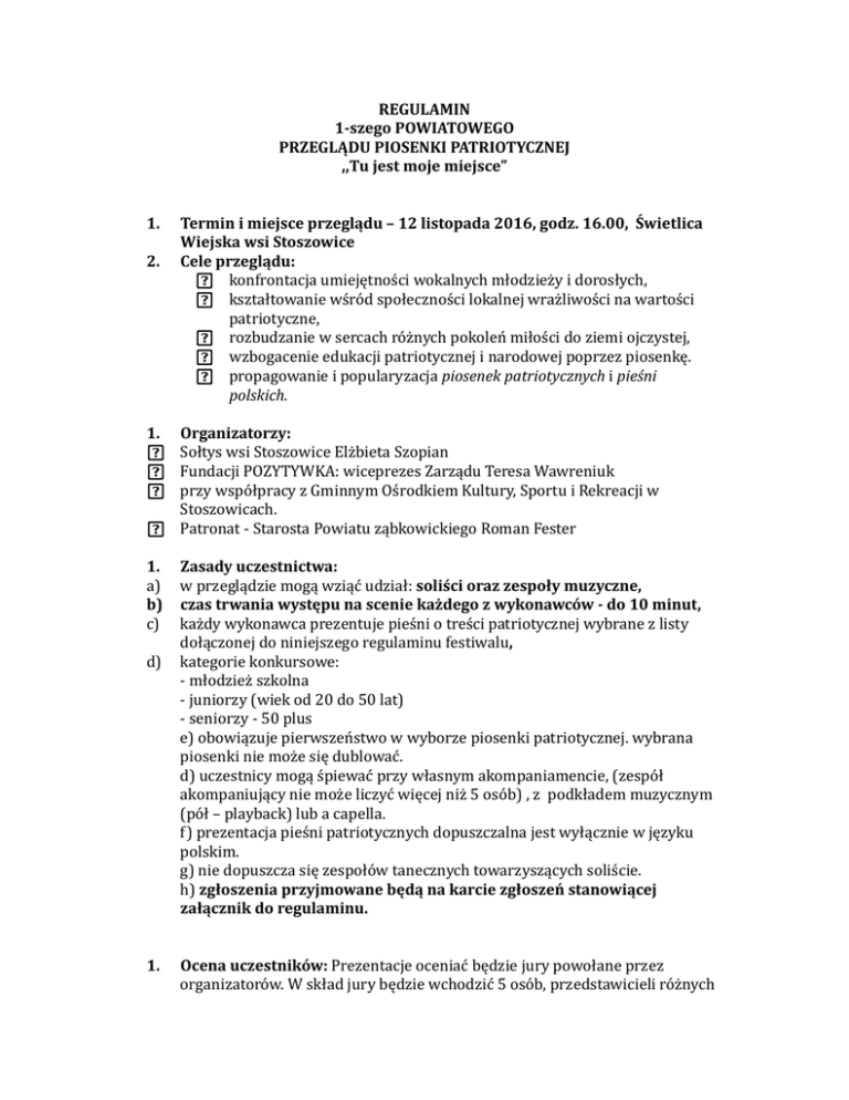 REGULAMIN 1-szegoPOWIATOWEGO PRZEGLĄDUPIOSENKIPATRIOTYCZNEJ ,,Tujestmojemiejsce” 1. 2. 1. 1. a) b) c) d) 1. Terminimiejsceprzeglądu–12listopada2016,godz.16.00,Świetlica WiejskawsiStoszowice Celeprzeglądu: konfrontacjaumiejętnościwokalnychmłodzieżyidorosłych, kształtowaniewśródspołecznościlokalnejwrażliwościnawartości patriotyczne, rozbudzaniewsercachróżnychpokoleńmiłościdoziemiojczystej, wzbogacenieedukacjipatriotycznejinarodowejpoprzezpiosenkę. propagowanieipopularyzacjapiosenekpatriotycznychipieśni polskich. Organizatorzy: SołtyswsiStoszowiceElżbietaSzopian FundacjiPOZYTYWKA:wiceprezesZarząduTeresaWawreniuk przywspółpracyzGminnymOśrodkiemKultury,SportuiRekreacjiw Stoszowicach. Patronat-StarostaPowiatuząbkowickiegoRomanFester Zasadyuczestnictwa: wprzeglądziemogąwziąćudział:soliściorazzespołymuzyczne, czastrwaniawystępunasceniekażdegozwykonawców-do10minut, każdywykonawcaprezentujepieśniotreścipatriotycznejwybranezlisty dołączonejdoniniejszegoregulaminufestiwalu, kategoriekonkursowe: -młodzieższkolna -juniorzy(wiekod20do50lat) -seniorzy-50plus e)obowiązujepierwszeństwowwyborzepiosenkipatriotycznej.wybrana piosenkiniemożesiędublować. d)uczestnicymogąśpiewaćprzywłasnymakompaniamencie,(zespół akompaniującyniemożeliczyćwięcejniż5osób),zpodkłademmuzycznym (pół–playback)lubacapella. f)prezentacjapieśnipatriotycznychdopuszczalnajestwyłączniewjęzyku polskim. g)niedopuszczasięzespołówtanecznychtowarzyszącychsoliście. h)zgłoszeniaprzyjmowanebędąnakarciezgłoszeństanowiącej załącznikdoregulaminu. Ocenauczestników:Prezentacjeoceniaćbędziejurypowołaneprzez organizatorów.Wskładjurybędziewchodzić5osób,przedstawicieliróżnych środowisk. 1. Ogólnekryteriaoceny: jakośćwykonania(intonacja,czystośćwspółbrzmieniawśpiewie wielogłosowym), dobórrepertuaru(utwórdostosowanydowiekuimożliwościwokalnych uczestników) ogólnywyrazartystyczny(wizeruneksceniczny). Juryprzyznanagrodyrzeczoweorazdyplomyiwyróżnienia. 1. a) b) c) 1. a) b) Sprawyróżne: organizatorzapewnianagłośnienie,mikrofony,sprzętdoodtwarzania: odtwarzaczcd. zgłoszenieuczestnictwawkonkursiejestjednoznacznezprzyjęciem warunkówniniejszegoregulaminu. sprawynieujętewregulaminieorazspornedecyzjerozstrzygaostatecznie organizator. Zgłoszenia: Kartyzgłoszeniowenależyprzesyłaćdodnia30.10.2016r.naadres: Pocztą:SołectwoStoszowiceSołtysElżbietaSzopian,57-213Stoszowice44z dopiskiemIPowiatowyPrzeglądPIOSENKIPATRIOTYCZNEJ,,Tujestmoje miejsce” e-mailem:[email protected],wtytule1-wszyPowiatowyPrzegląd PIOSENKIPATRIOTYCZNEJ,,Tujestmojemiejsce” Osobaodpowiedzialnazaprzyjmowaniezgłoszeńnafestiwal-Teresa Wawreniuk(tel.508389454) Przesłaniekartyzgłoszeniowejjestrównoznacznezakceptacjąregulaminu konkursuorazwyrażeniemzgodynaprzetwarzaniedanychosobowych uczestnikakonkursuzawartychwzgłoszeniu. Zgłoszenieuczestnictwawfestiwalujestrównoznacznezwyrażeniemzgody nadilmowanieirozpowszechnianiewizerunku. Kosztyzwiązanezprzygotowaniemdoprezentacji,przyjazdemipobytem pokrywająuczestnicyprzeglądu. Ilośćmiejscograniczona. Wykonawcy,którzyzostanązakwalidikowanidoudziałuwprzeglądzie zostanąpowiadomienitelefonicznie,dodnia5.11.2016roku. Kontaktdoorganizatorów:[email protected] ZAPRASZAMY