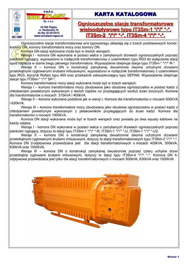 NC-1087 P.H.P.U. KARTA KATALOGOWA Sp. z o.o. Ognioszczelne stacje transformatorowe wieloodpływowe typu IT3Sm-1 */*/* *-*, IT3Sm-2 */*/* *-*, IT3Sm-4 */*/* *-*. 44-362 Rogów ul. Raciborska 79 tel./fax 32-4512010 www.izol-plast.rogow.pl Ognioszczelne stacje transformatorowe w/w typoszeregu składają się z trzech podstawowych komór: komory GN, komory transformatora mocy oraz komory DN. Komora GN stacji wykonana może być w dwóch wersjach. Wersja I - komora GN wykonana w postaci walca o zamykanych drzwiach ognioszczelnych poprzez pierścień ryglujący, wyposażono w rozłącznik transformatorowy z uziemnikiem typu RG3 do wyłączenia stacji spod napięcia w stanie biegu jałowego transformatora. Wyposażenie obejmuje stacje typu IT3Sm-* */*/* R-*. Wersja II – komora GN o konstrukcji zamykanej dwustronnie dwoma uchylnymi drzwiami prostokątnymi ryglowanymi śrubami imbusowymi, wyposażono w rozłącznik transformatorowy z uziemnikiem typu RG3, stycznik Rollarc typu 400 oraz przekaźnik zabezpieczający typu SEPAM. Wyposażenie obejmuje stacje typu IT3Sm-* */*/* SP-*. Komora transformatora mocy stacji wykonana może być w trzech wersjach. Wersja I – komora transformatora mocy zbudowana jako obudowa ognioszczelna w postaci kadzi z chłodzeniem powietrznym wykonanym z dwóch rzędów rur przylegających wzdłuż ścian bocznych. Komora dla transformatorów o mocach 315kVA i 400kVA. Wersja II – komora wykonana podobnie jak w wersji I. Komora dla transformatorów o mocach 500kVA i 630kVA. Wersja III – komora transformatora mocy zbudowana jako obudowa ognioszczelna w postaci kadzi z chłodzeniem powietrznym wykonanym z płaskowników przylegających do ścian kadzi. Komora dla transformatorów o mocach 1000kVA. Komora DN stacji wykonana może być w trzech wersjach oraz posiada po dwa wpusty kablowe na każdy odpływ. Wersja I - komora DN wykonana w postaci walca o zamykanych drzwiach ognioszczelnych poprzez pierścień ryglujący, dotyczy to stacji typu IT3Sm-1 */*/* *-R, IT3Sm-1 */*/* *-U, IT3Sm-1 */*/* *-U2. Wersja II – komora DN o konstrukcji zamykanej dwustronnie dwoma uchylnymi drzwiami prostokątnymi ryglowanymi śrubami imbusowymi, dotyczy to stacji transformatorowych typu IT3Sm-2 */*/* *-*. Komora DN 2-odpływowa przewidziana jest dla stacji transformatorowych o mocach 400kVA, 500kVA, 630kVA oraz 1000kVA. Wersja III – komora DN o konstrukcji zamykanej dwustronnie poprzez cztery uchylne drzwi prostokątne ryglowane śrubami imbusowymi, dotyczy to stacji typu IT3Sm-4 */*/* *-*. Komora DN 4odpływowa przewidziana jest tylko dla stacji transformatorowych o mocach 500kVA, 630kVA oraz 1000kVA. Strona 1 NC-1087 P.H.P.U. KARTA KATALOGOWA Sp. z o.o. Ognioszczelne stacje transformatorowe wieloodpływowe typu IT3Sm-1 */*/* *-*, IT3Sm-2 */*/* *-*, IT3Sm-4 */*/* *-*. 44-362 Rogów ul. Raciborska 79 tel./fax 32-4512010 www.izol-plast.rogow.pl Ognioszczelne stacje transformatorowe wieloodpływowe typu IT3Sm-* */*/* *-* produkowane w różnej konfiguracji w zależności od życzeń klienta: Widok komory GN – strona rozłącznika Widok komory GN – strona stycznika Strona 2 NC-1087 P.H.P.U. KARTA KATALOGOWA Sp. z o.o. Ognioszczelne stacje transformatorowe wieloodpływowe typu IT3Sm-1 */*/* *-*, IT3Sm-2 */*/* *-*, IT3Sm-4 */*/* *-*. 44-362 Rogów ul. Raciborska 79 tel./fax 32-4512010 www.izol-plast.rogow.pl Typoszereg ognioszczelnych stacji transformatorowych wieloodpływowych typu IT3Sm-1 */*/* *-* (stacje jednoodpływowe). Typ Rozłącznik typu RG3 Rozłącznik typu RG3 + Stycznik Rollarc typu 400D + Przekaźnik zabezpieczający typu SEPAM Moc Sn Napięcie strony DN U2n Prąd opływu I2n IT3Sm-1 315/6 R-R, IT3Sm-1 315/6 R-U, IT3Sm-1 315/6 R-U2 -------------------------------- 315 kVA 525 V 346 A IT3Sm-1 400/6 R-R, IT3Sm-1 400/6 R-U, IT3Sm-1 400/6 R-U2 IT3Sm-1 400/6 SP-R, IT3Sm-1 400/6 SP-U, IT3Sm-1 400/6 SP-U2 400 kVA 525 V 440 A IT3Sm-1 400/6/1 R-R, IT3Sm-1 400/6/1 R-U, IT3Sm-1 400/6/1 R-U2 IT3Sm-1 400/6/1 SP-R, IT3Sm-1 400/6/1 SP-U, IT3Sm-1 400/6/1 SP-U2 400 kVA 1050 V 220 A Typoszereg ognioszczelnych stacji transformatorowych wieloodpływowych typu IT3Sm-2 */*/* *-* (stacje dwuodpływowe). Typ Rozłącznik typu RG3 Rozłącznik typu RG3 + Stycznik Rollarc typu 400D + Przekaźnik zabezpieczający typu SEPAM Moc Sn Napięcie strony DN U2n Prąd opływu I2n IT3Sm-2 400/6 R-U2 IT3Sm-2 400/6 SP-U2 400 kVA 525 V 220 A IT3Sm-2 400/6/1 R-U2 IT3Sm-2 400/6/1 SP-U2 400 kVA 1050 V 110 A IT3Sm-2 500/6 R-U2 IT3Sm-2 500/6 SP-U2 500 kVA 525 V 275 A IT3Sm-2 630/6/1 R-U2 IT3Sm-2 630/6/1 SP-U2 630 kVA 1050 V 173 A IT3Sm-2 1000/6/1 R-U2 IT3Sm-2 1000/6/1 SP-U2 1000 kVA 1050 V 275 A Typoszereg ognioszczelnych stacji transformatorowych wieloodpływowych typu IT3Sm-4 */*/* *-* (stacje czteroodpływowe). Typ Rozłącznik typu RG3 Rozłącznik typu RG3 + Stycznik Rollarc typu 400D + Przekaźnik zabezpieczający typu SEPAM Moc Sn Napięcie strony Prąd opływu I2n DN U2n IT3Sm-4 500/6 R-U2 IT3Sm-4 500/6 SP-U2 500 kVA 525 V 137 A IT3Sm-4 630/6/1 R-U2 IT3Sm-4 630/6/1 SP-U2 630 kVA 1050 V 86 A IT3Sm-4 1000/6/1 R-U2 IT3Sm-4 1000/6/1 SP-U2 1000 kVA 1050 V 137 A Widok komory DN IT3Sm-2 400/6/1 SP-U2 Strona 3 NC-1087 P.H.P.U. KARTA KATALOGOWA Sp. z o.o. Ognioszczelne stacje transformatorowe wieloodpływowe typu IT3Sm-1 */*/* *-*, IT3Sm-2 */*/* *-*, IT3Sm-4 */*/* *-*. 44-362 Rogów ul. Raciborska 79 tel./fax 32-4512010 www.izol-plast.rogow.pl Ognioszczelne stacje transformatorowe typu IT3Sm-* */*/* *-* posiadają następujące dane znamionowe oraz zwarciowe: Typ stacji Moc Sn Napięcie znamionowe Częst. Liczba faz Prąd znamionowy strona GN I1n strona DN I2n Układ poł. strona GN U1n strona DN U2n kVA V V Hz - A A - IT3Sm-* 315/6 *-* 315 6000±5% 525 50 3 30,3 346 Yy0 IT3Sm-* 400/6 *-* 400 6000±5% 525 50 3 38,5 440 Yy0 IT3Sm-* 400/6/1 *-* 400 6000±5% 1050 50 3 38,5 220 Yy0 IT3Sm-* 500/6 *-* 500 6000±5% 525 50 3 48,2 550 Yy0 IT3Sm-* 630/6/1 *-* 630 6000±5% 1050 50 3 60,6 346 Yy0 IT3Sm-* 1000/6/1 *-* 1000 600