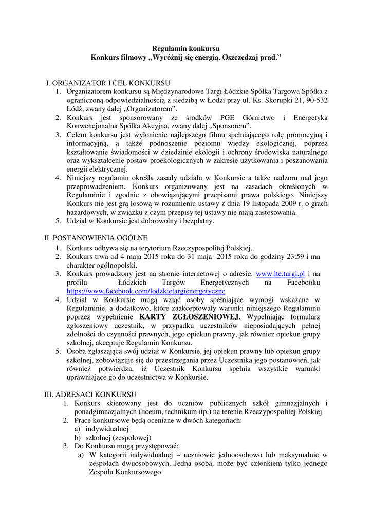 Regulamin konkursu Konkurs filmowy „Wyróżnij się energią. Oszczędzaj prąd.” I. ORGANIZATOR I CEL KONKURSU 1. Organizatorem konkursu są Międzynarodowe Targi Łódzkie Spółka Targowa Spółka z ograniczoną odpowiedzialnością z siedzibą w Łodzi przy ul. Ks. Skorupki 21, 90-532 Łódź, zwany dalej „Organizatorem”. 2. Konkurs jest sponsorowany ze środków PGE Górnictwo i Energetyka Konwencjonalna Spółka Akcyjna, zwany dalej „Sponsorem”. 3. Celem konkursu jest wyłonienie najlepszego filmu spełniającego rolę promocyjną i informacyjną, a także podnoszenie poziomu wiedzy ekologicznej, poprzez kształtowanie świadomości w dziedzinie ekologii i ochrony środowiska naturalnego oraz wykształcenie postaw proekologicznych w zakresie użytkowania i poszanowania energii elektrycznej. 4. Niniejszy regulamin określa zasady udziału w Konkursie a także nadzoru nad jego przeprowadzeniem. Konkurs organizowany jest na zasadach określonych w Regulaminie i zgodnie z obowiązującymi przepisami prawa polskiego. Niniejszy Konkurs nie jest grą losową w rozumieniu ustawy z dnia 19 listopada 2009 r. o grach hazardowych, w związku z czym przepisy tej ustawy nie mają zastosowania. 5. Udział w Konkursie jest dobrowolny i bezpłatny. II. POSTANOWIENIA OGÓLNE 1. Konkurs odbywa się na terytorium Rzeczypospolitej Polskiej. 2. Konkurs trwa od 4 maja 2015 roku do 31 maja 2015 roku do godziny 23:59 i ma charakter ogólnopolski. 3. Konkurs prowadzony jest na stronie internetowej o adresie: www.lte.targi.pl i na profilu Łódzkich Targów Energetycznych na Facebooku https://www.facebook.com/lodzkietargienergetyczne 4. Udział w Konkursie mogą wziąć osoby spełniające wymogi wskazane w Regulaminie, a dodatkowo, które zaakceptowały warunki niniejszego Regulaminu poprzez wypełnienie KARTY ZGŁOSZENIOWEJ. Wypełniając formularz zgłoszeniowy uczestnik, w przypadku uczestników nieposiadających pełnej zdolności do czynności prawnych, jego opiekun prawny, jak również opiekun grupy szkolnej, akceptuje Regulamin Konkursu. 5. Osoba zgłaszająca swój udział w Konkursie, jej opiekun prawny lub opiekun grupy szkolnej, zobowiązuje się do przestrzegania przez Uczestnika jego postanowień, jak również potwierdza, iż Uczestnik Konkursu spełnia wszystkie warunki uprawniające go do uczestnictwa w Konkursie. III. ADRESACI KONKURSU 1. Konkurs skierowany jest do uczniów publicznych szkół gimnazjalnych i ponadgimnazjalnych (liceum, technikum itp.) na terenie Rzeczypospolitej Polskiej. 2. Prace konkursowe będą oceniane w dwóch kategoriach: a) indywidualnej b) szkolnej (zespołowej) 3. Do Konkursu mogą przystępować: a) W kategorii indywidualnej – uczniowie jednoosobowo lub maksymalnie w zespołach dwuosobowych. Jedna osoba, może być członkiem tylko jednego Zespołu Konkursowego. b) W kategorii szkolnej (zespołowej) – grupy uczniów stworzone z klas, kół lub klubów zainteresowań. c) Uczestnikami mogą być osoby w wieku powyżej 13 roku życia, posiadające co najmniej ograniczoną zdolność do czynności prawnych. Uczestnicy muszą mieć miejsce zamieszkania na terenie Rzeczypospolitej Polskiej. 4. Uczestnicy niepełnoletni, i inni nieposiadający pełnej zdolności do czynności prawnych mogą wziąć udział w konkursie wyłącznie na podstawie uprzednio wyrażonej pisemnej zgody przez ich opiekunów prawnych na udział w Konkursie, na zasadach określonych w niniejszym Regulaminie. Zastrzega się, że w przypadku kategorii indywidualnej, opiekun prawny wyraża pisemną zgodę na udział uczestnika w Konkursie oraz dokonuje zgłoszenia uczestnika poprzez wypełnienie KARTY ZGŁOSZENIOWEJ, zaś w przypadku kategorii szkolnej (zespołowej) zgłoszenia uczestników (grupy) dokonuje opiekun grupy szkolnej, po uprzednim uzyskaniu pisemnej zgody na udział w Konkursie na zasadach określonych w niniejszym Regulaminie, od opiekunów prawnych poszczególnych członków zespołu. Opiekun grupy szkolnej, zgłaszający dany zespół ponosi odpowiedzialność i zobowiązany jest do zweryfikowania przed wysłaniem zgłoszenia do Konkursu, czy wszyscy członkowie zespołu posiadają zgody opiekunów prawnych, o których mowa powyżej. 5. Uczestnicy pełnoletni posiadający pełną zdolność do czynności prawnych, wyrażają pisemną zgodę na swój udział w Konkursie oraz dokonują zgłoszenia poprzez wypełnienie KARTY ZGŁOSZENIOWEJ (kategoria indywidualna), zaś w przypadku kategorii szkolnej (zespołowej) zgłoszenia pełnoletnich uczestników (grupy) dokonuje opiekun grupy szkolnej, po uprzednim uzyskaniu od poszczególnych członków grupy pisemnej zgody na udział w Konkursie na zasadach określonych w niniejszym Regulaminie. IV. WARUNKI UDZIAŁU W KONKURSIE 1. Warunkiem udziału w Konkursie jest: a) dostarczenie pracy konkursowej zgodnie z wymogami, o których mowa w dalszej części Regulaminu; b) dostarczenie prawidłowo wypełnionej Karty Zgłoszenia, która znajduje się na stronie www.lte.targi.pl c) wyrażenie zgody na przedstawienie projektu na stronie internetowej www.targi.lodz.pl, www.lte.targi.pl www.youtube.com/MTLLODZ , profilach Facebook: https://www.facebook.com/LodzInternationalFair i https://www.facebook.com/lodzkietargienergetyczne. 2. Uczestnik Konkursu, jego opiekun prawny, w przypadku kategorii szkolnej - opiekun grupy szkolnej, oświadcza, iż zgłaszane prace Uczestnika są jego autorstwa oraz nie naruszają praw osób trzecich. 3. Uczestnik, jego opiekun prawny, w przypadku kategorii szkolnej - opiekun grupy szkolnej oświadcza, że Uczestnik ma zgodę osób, których wizerunki utrwalono w filmie. 4. Za wszelkie roszczenia osób trzecich wynikające z tytułu naruszenia ich praw autorskich osobistych lub majątkowych odpowiada Uczestnik, jego opiekun prawny lub opiekun grupy szkolnej. 5. Na Konkurs jeden Uczestnik (indywidualny uczeń, zespół konkursowy, grupa szkolna) może nadesłać jeden film. 6. Złożenie Pracy Konkursowej do